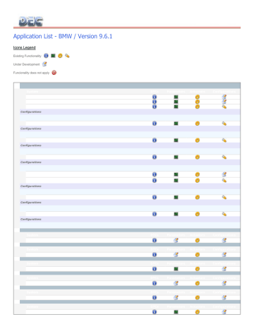 Application List - BMW / Version 9.6.1 Icons Legend Existing Functionality Under Development Funcionality does not apply ABS / ASC / DSC System DTCs Parameters Actuators Configurations DTCs Parameters Actuators Configurations DTCs Parameters Actuators Configurations DTCs Parameters Actuators Configurations DTCs Parameters Actuators Configurations DTCs Parameters Actuators Configurations DTCs Parameters Actuators Configurations ABS - DSC MK60 E46-E85-R50 ABS_2_ASC_MK20 DSC ( M5 E60-1 / 3 SERIES_E9x / 1 SERIES_E81-2 ) Configurations CBS Reset - Front Brakes Pads CBS Reset - Rear Brakes Pads DSC (1 SERIES_E87-8) Configurations CBS Reset - Front Brakes Pads CBS Reset - Rear Brakes Pads DSC (5 SERIES_E60-1) Configurations CBS Reset - Front Brakes Pads CBS Reset - Rear Brakes Pads DSC (DYNAMICZNA KONTROLA STABILNOŚCI) Configurations CBS Reset - Front Brakes Pads CBS Reset - Rear Brakes Pads DSC DXC8 DSC MK20 Configurations Read test code DSC PLUS ( 5 SERIES_E60-1 ) Configurations CBS Reset - Front Brakes Pads CBS Reset - Rear Brakes Pads DSC PREMIUM (5 SERIES_E60-1) Configurations CBS Reset - Front Brakes Pads CBS Reset - Rear Brakes Pads AHM - MODUŁ PRZYCZEPY System AHM (MODUŁ PRZYCZEPY) AL - AKTYWNY UKŁAD KIEROWNICZY System AL (AKTYWNY UKŁAD KIEROWNICZY - AFS70) AMP - WZMACNIACZ HI-FI System AMP (WZMACNIACZ HI-FI) ARS - DYNAMIC DRIVE System ARS (DYNAMIC DRIVE) CA - COMFORT ACCESS System CA (COMFORT ACCESS) CAS - CAR ACCESS SYSTEM System CAS ( 5 SERIES_E60-1 / 3 SERIES_E9x / 1 SERIES_E81-2 ) CAS (CAR ACCESS SYSTEM) CCC-A - APPLICATIONS System DTCs Parameters Actuators Configurations DTCs Parameters Actuators Configurations DTCs Parameters Actuators Configurations DTCs Parameters Actuators Configurations DTCs Parameters Actuators Configurations DTCs Parameters Actuators Configurations DTCs Parameters Actuators Configurations DTCs Parameters Actuators Configurations CCC-A (APPLICATIONS) CCC-ANT - ANTENNA TUNER System CCC-ANT (ANTENNA TUNER) CCC-ASK - AUDIO SYSTEM CONTROLLER System CCC-ASK (AUDIO SYSTEM CONTROLLER) CDC CD - CHANGER System CDC CD ( 3 SERIES_E9x / 1 SERIES_E81-2-7-8 ) CDC CD (CHANGER) CID - CENTRAL INFORMATION DISPLAY System CID (CENTRAL INFORMATION DISPLAY) CON - CONTROLLER System CON (CONTROLLER) CON (CONTROLLLER) CON 2 DAB - TUNER CYFROWY System DAB (TUNER CYFROWY) DME/DDE - MOTOR ELECTRONIC System BOSCH MED17 Configurations CBS Reset - Engine Oil BOSCH MEV17 Configurations CBS Reset - Engine Oil DDE 3.0 M47 DDE EU4 DDE M47 Configurations CBS Reset - Engine Oil DDE M57 / TU2 (CAN) Configurations CBS Reset - Engine Oil DDE M57/TU Configurations CBS Reset - Engine Oil DDE M57/TU2 Configurations CBS Reset - Engine Oil DDE W16 R56 Configurations CBS Reset - Engine Oil DME 116i_N45 Configurations CBS Reset - Engine Oil DME 323i_N52K_SED Configurations CBS Reset - Engine Oil DME 335i_N54_SED Configurations CBS Reset - Engine Oil DME BMS46 M43 (E46) DME COOPER_S_W11_CONV Page 2 of 8 DME M5.2 M44 (E36) Configurations Clear adaptation values DME MS42 2.0 M52/TU DME MS43 M54 DME N43 E87 Configurations CBS Reset - Engine Oil DME N46 Configurations CBS Reset - Engine Oil DME S85 M5 (E60) Configurations CBS Reset - Engine Oil DME X3_2,5si_N52K (CAN) Configurations CBS Reset - Engine Oil ENG_1_12_M12_M70_CY1_6 DVD-C - DVD CHANGER System DTCs Parameters Actuators Configurations DTCs Parameters Actuators Configurations DTCs Parameters Actuators Configurations DTCs Parameters Actuators Configurations DTCs Parameters Actuators Configurations DTCs Parameters Actuators Configurations DTCs Parameters Actuators Configurations DVD-C (DVD CHANGER) DWA - ANTITHEFT ALARM SYSTEM System DWA ( 5 SERIES_E60-1 / 3 SERIES_E9x / 1 SERIES_E81-2 ) EDCSHL - DAMPER SATELLITE, REAR LEFT System EDCSHL (DAMPER SATELLITE, REAR LEFT) EDCSHR - DAMPER SATELLITE, REAR RIGHT System EDCSHR (DAMPER SATELLITE, REAR RIGHT) EDCSSVR - DAMPER SATELLITE, FRONT RIGHT System EDCSVR (DAMPER SATELLITE, FRONT RIGHT) EDCSVL - DAMPER SATELLITE, FRONT LEFT System EDCSVL (DAMPER SATELLITE, FRONT LEFT) EGS - ELECTRONIC TRANSMISSION CONTROL System EGS (R55-6) Configurations Reset autoadaptacji EGS 318ti M44_30 (E36) Configurations Clear adaptation values Read test code + Adaptation values EGS 5HP E46 Configurations Clear adaptation values Read test code Read test code + Adaptation values EGS 6HPTU (ELECTRONIC TRANSMISSION CONTROL) Configurations Read adaptation values Read test code Reset all adaptation values Reset Control Module Teach in components EGS GM6 Configurations Clear adaptation values Read test code EHC - ELECTRONIC RIDE HEIGHT CONTROL Page 3 of 8 System DTCs Parameters Actuators Configurations DTCs Parameters Actuators Configurations DTCs Parameters Actuators Configurations DTCs Parameters Actuators Configurations DTCs Parameters Actuators Configurations DTCs Parameters Actuators Configurations DTCs Parameters Actuators Configurations DTCs Parameters Actuators Configurations DTCs Parameters Actuators Configurations DTCs Parameters Actuators Configurations DTCs Parameters Actuators Configurations DTCs Parameters Actuators Configurations DTCs Parameters Actuators Configurations DTCs Parameters Actuators Configurations DTCs Parameters Actuators Configurations EHC ( ELECTRONIC RIDE HEIGHT CONTROL) EKPS - FUEL PUMP CONTROL System EKPS ( 5 SERIES_E60-1 / 3 SERIES_E9x / 1 SERIES_E81-2 ) EKPS ( 5 SERIES_E60-1 / 3 SERIES_E9x) EKPS (FUEL-PUMP CONTROL) EKPS (X3_E83 N52K) EMF - HAMULEC PARKINGOWY System EMF (HAMULEC PARKINGOWY) EPS - ELEKTRYCZNE WSPOMAGANIE KIEROWNICY System EHPS COOPER_S_W11_CONV EPS (ELECTRONIC POWER STEERING) EPS E87 EWS - VEHICLE IMMOBILIZER System EWS INMOBILIZER 3 EWS_2_EWS_2 FD - REAR CABIN DISPLAY System FD (REAR CABIN DISPLAY) FKA - REAR HEATER / AIR CONDITIONING System FKA (REAR HEATER / AIR CONDITIONING) FLA - HIGH BEAM ASSIST System FLA (HIGH BEAM ASSIST) FRM / KBM - FOOTWELL MODULE / BODY BASIC MODULE System FRM ( 3 SERIES_E9x / 1 SERIES_E81-2 ) FRM (1 SERIES_E87-8) FRM 2 ( 3 SERIES_E9x / 1 SERIES_E81-2-7-