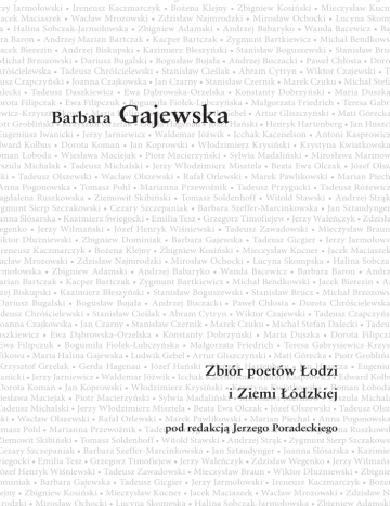 ieczysław Braun • Wiktor Dłużniewski • Zbigniew Dominiak • Barbara Gajewska • Tadeusz Gicgier rzy Jarmołowski • Ireneusz Kaczmarczyk • Bożena Klejny • Zbigniew Kosiński • Mieczysław Kucn Jacek Maciaszek • Wacław Mrozowski • Zdzisław Najmrodzki • Mirosław Ochocki • Lucyna Skomp a • Halina Sobczak-Jarmołowska • Zbigniew Adamski • Andrzej Babaryko • Wanda Bacewicz • Ba ra Baron • Andrzej Marian Bartczak • Kacper Bartczak • Zygmunt Bartkiewicz • Michał Bendkows Jacek Bierezin • Andrzej Biskupski • Kazimierz Błeszyński • Stanisław Boguszewski • Stanisław Bruc Michał Brzozowski • Dariusz Bugalski • Bogusław Bujała • Andrzej Buczacki • Paweł Chłosta • Doro hróścielewska • Tadeusz Chróścielewski • Stanisław Cieślak • Abram Cytryn • Wiktor Czajewski • T usz Czapczyński • Joanna Czajkowska • Jan Czarny • Stanisław Czernik • Marek Czuku • Michał Stefa alecki • Tadeusz Daszkiewicz • Ewa Dąbrowska-Orzelska • Konstanty Dobrzyński • Maria Duszka orota Filipczak • Ewa Filipczuk • Bogumiła Fiołek-Lubczyńska • Małgorzata Friedrich • Teresa Gabr ewicz-Krzysztofikowa • Maria Halina Gajewska • Ludwik Gebel • Artur Gliszczyński • Mati Górecka otr Grobliński • Krzysztof Grzelak • Gerda Hagenau • Józef Hański • Henryk Hartenberg • Jan Huszcz Eugeniusz Iwanicki • Jerzy Jarniewicz • Waldemar Jóźwik • Icchak Kacenelson • Antoni Kasprowicz dward Kolbus • Dorota Koman • Jan Koprowski • Włodzimierz Krysiński • Krystyna Kwiatkowska oman Łoboda • Wiesława Maciejak • Piotr Macierzyński • Sylwia Madaliński • Mirosława Marinow rszula Michalak • Tadeusz Michalski • Jerzy Włodzimierz Misztela • Beata Ewa Olczak • Józef Olsz ski • Tadeusz Olszewski • Wacław Olszewski • Rafał Orlewski • Marek Pawlikowski • Marian Piech Anna Pogonowska • Tomasz Pohl • Marianna Przewoźnik • Tadeusz Przygucki • Tadeusz Różewicz agdalena Ruszkowska • Ziemowit Skibiński • Tomasz Soldenhoff • Witold Stawski • Andrzej Strąk ygmunt Sierp Szczakowski • Cezary Szczepaniak • Barbara Szeffer-Marcinkowska • Jan Sztaudynger anna Ślósarska • Kazimierz Świegocki • Emilia Tesz • Grzegorz Timofiejew • Jerzy Waleńczyk • Zdzisła Wegenko • Jerzy Wilmański • Józef Henryk Wiśniewski • Tadeusz Zawadowski • Mieczysław Braun Wiktor Dłużniewski • Zbigniew Dominiak • Barbara Gajewska • Tadeusz Gicgier • Jerzy Jarmołows Ireneusz Kaczmarczyk • Bożena Klejny • Zbigniew Kosiński • Mieczysław Kucner • Jacek Maciaszek Wacław Mrozowski • Zdzisław Najmrodzki • Mirosław Ochocki • Lucyna Skompska • Halina Sobcza rmołowska • Zbigniew Adamski • Andrzej Babaryko • Wanda Bacewicz • Barbara Baron • Andrz arian Bartczak • Kacper Bartczak • Zygmunt Bartkiewicz • Michał Bendkowski • Jacek Bierezin • An zej Biskupski • Kazimierz Błeszyński • Stanisław Boguszewski • Stanisław Brucz • Michał Brzozows Dariusz Bugalski • Bogusław Bujała • Andrzej Buczacki • Paweł Chłosta • Dorota Chróścielewska adeusz Chróścielewski • Stanisław Cieślak • Abram Cytryn • Wiktor Czajewski • Tadeusz Czapczyńs oanna Czajkowska • Jan Czarny • Stanisław Czernik • Marek Czuku • Michał Stefan Dalecki • Tadeu aszkiewicz • Ewa Dąbrowska-Orzelska • Konstanty Dobrzyński • Maria Duszka • Dorota Filipcza Ewa Filipczuk • Bogumiła Fiołek-Lubczyńska • Małgorzata Friedrich • Teresa Gabrysiewicz-Krzys fikowa • Maria Halina Gajewska • Ludwik Gebel • Artur Gliszczyński • Mati Górecka • Piotr Groblińs Krzysztof Grzelak • Gerda Hagenau • Józef Hański • Henryk Hartenberg • Jan Huszcza • Eugeniu wanicki • Jerzy Jarniewicz • Waldemar Jóźwik • Icchak Kacenelson • Antoni Kasprowicz • Edward Kolbu Dorota Koman • Jan Koprowski • Włodzimierz Krysiński • Krystyna Kwiatkowska • Roman Łoboda Wiesława Maciejak • Piotr Macierzyński • Sylwia Madaliński • Mirosława Marinow • Urszula Michala Tadeusz Michalski • Jerzy Włodzimierz Misztela • Beata Ewa Olczak • Józef Olszewski • Tadeusz Olsz ski • Wacław Olszewski • Rafał Orlewski • Marek Pawlikowski • Marian Piechal • Anna Pogonowska pod redakcją Jerzego Poradeckiego omasz Pohl • Marianna Przewoźnik • Tadeusz Przygucki • Tadeusz Różewicz • Magdalena Ruszkowsk Ziemowit Skibiński • Tomasz Soldenhoff • Witold Stawski • Andrzej Strąk • Zygmunt Sierp Szczakows Cezary Szczepaniak • Barbara Szeffer-Marcinkowska • Jan Sztaudynger • Joanna Ślósarska • Kazimie wiegocki • Emilia Tesz • Grzegorz Timofiejew • Jerzy Waleńczyk • Zdzisław Wegenko • Jerzy Wilmańs ózef Henryk Wiśniewski • Tadeusz Zawadowski • Mieczysław Braun • Wiktor Dłużniewski • Zbignie ominiak • Barbara Gajewska • Tadeusz Gicgier • Jerzy Jarmołowski • Ireneusz Kaczmarczyk • Bożen lejny • Zbigniew Kosiński • Mieczysław Kucner • Jacek Maciaszek • Wacław Mrozowski • Zdzisław N Barbara Gajewska Zbiór poetów Łodzi i Ziemi Łódzkiej fotografia ze zbiorów prywatnych Barbara Gajewska (ur. 1955) U Poetka rodziła się w Żarnowie, ukończyła Liceum Ogólnokształcące w Opocznie, a następnie filologię polską na Uniwersytecie Łódzkim. Jest dyplomowaną nauczycielką języka polskiego (pracowała w Łękińsku, Czarnocinie i Łodzi). Za pracę zawodową otrzymała Brązowy i Srebrny Krzyż Zasługi oraz Medal Komisji Edukacji Narodowej. W czasie studiów należała do łódzkiego Korespondencyjnego Klubu Młodych Pisarzy „Wiadukt”, potem także do Klubu Literackiego Nauczycieli (KLiN-u) i „Centaura”. W Piotrkowie prowadziła klub „Zakole”, aktualnie działa w „Pomostach” i „Abatonie”. Jest laureatką kilku konkursów literackich: „O Rubinową Hortensję”, „Tu — przy Pilicy