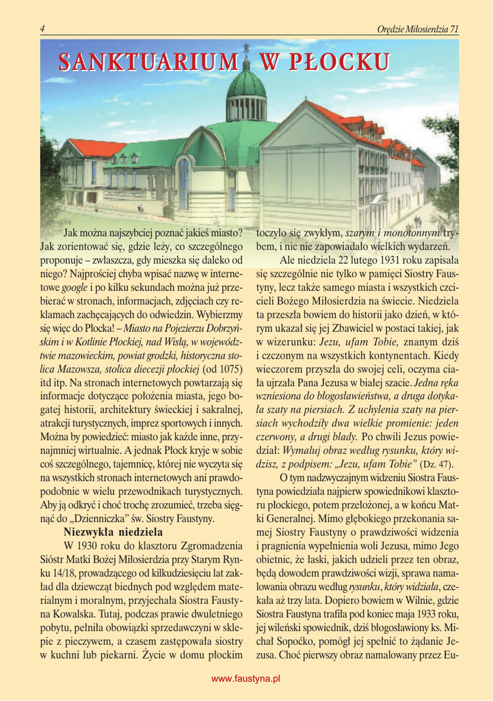 4 Orędzie Miłosierdzia 71 SANKTUARIUM W P£OCKU MIŁOSIERDZIE BOŻE W ODPUSTACH Jak można najszybciej poznać jakieś miasto? Jak zorientować się, gdzie leży, co szczególnego proponuje – zwłaszcza, gdy mieszka się daleko od niego? Najprościej chyba wpisać nazwę w internetowe google i po kilku sekundach można już przebierać w stronach, informacjach, zdjęciach czy reklamach zachęcających do odwiedzin. Wybierzmy się więc do Płocka! – Miasto na Pojezierzu Dobrzyńskim i w Kotlinie Płockiej, nad Wisłą, w województwie mazowieckim, powiat grodzki, historyczna stolica Mazowsza, stolica diecezji płockiej (od 1075) itd itp. Na stronach internetowych powtarzają się informacje dotyczące położenia miasta, jego bogatej historii, architektury świeckiej i sakralnej, atrakcji turystycznych, imprez sportowych i innych. Można by powiedzieć: miasto jak każde inne, przynajmniej wirtualnie. A jednak Płock kryje w sobie coś szczególnego, tajemnicę, której nie wyczyta się na wszystkich stronach internetowych ani prawdopodobnie w wielu przewodnikach turystycznych. Aby ją odkryć i choć trochę zrozumieć, trzeba sięgnąć do „Dzienniczka” św. Siostry Faustyny. Niezwykła niedziela W 1930 roku do klasztoru Zgromadzenia Sióstr Matki Bożej Miłosierdzia przy Starym Rynku 14/18, prowadzącego od kilkudziesięciu lat zakład dla dziewcząt biednych pod względem materialnym i moralnym, przyjechała Siostra Faustyna Kowalska. Tutaj, podczas prawie dwuletniego pobytu, pełniła obowiązki sprzedawczyni w sklepie z pieczywem, a czasem zastępowała siostry w kuchni lub piekarni. Życie w domu płockim toczyło się zwykłym, szarym i monotonnym trybem, i nic nie zapowiadało wielkich wydarzeń. Ale niedziela 22 lutego 1931 roku zapisała się szczególnie nie tylko w pamięci Siostry Faustyny, lecz także samego miasta i wszystkich czcicieli Bożego Miłosierdzia na świecie. Niedziela ta przeszła bowiem do historii jako dzień, w którym ukazał się jej Zbawiciel w postaci takiej, jak w wizerunku: Jezu, ufam Tobie, znanym dziś i czczonym na wszystkich kontynentach. Kiedy wieczorem przyszła do swojej celi, oczyma ciała ujrzała Pana Jezusa w białej szacie. Jedna ręka wzniesiona do błogosławieństwa, a druga dotykała szaty na piersiach. Z uchylenia szaty na piersiach wychodziły dwa wielkie promienie: jeden czerwony, a drugi blady. Po chwili Jezus powiedział: Wymaluj obraz według rysunku, który widzisz, z podpisem: „Jezu, ufam Tobie” (Dz. 47). O tym nadzwyczajnym widzeniu Siostra Faustyna powiedziała najpierw spowiednikowi klasztoru płockiego, potem przełożonej, a w końcu Matki Generalnej. Mimo głębokiego przekonania samej Siostry Faustyny o prawdziwości widzenia i pragnienia wypełnienia woli Jezusa, mimo Jego obietnic, że łaski, jakich udzieli przez ten obraz, będą dowodem prawdziwości wizji, sprawa namalowania obrazu według rysunku, który widziała, czekała aż trzy lata. Dopiero bowiem w Wilnie, gdzie Siostra Faustyna trafiła pod koniec maja 1933 roku, jej wileński spowiednik, dziś błogosławiony ks. Michał Sopoćko, pomógł jej spełnić to żądanie Jezusa. Choć pierwszy obraz namalowany przez Eu- www.faustyna.pl październik, listopad, grudzień 2009 5 geniusza Kazimirowskiego w 1934 roku odbiera cześć w Wilnie, a najbardziej znany w świecie obraz Jezusa Miłosiernego znajduje się w Sanktuarium Miłosierdzia Bożego w Krakowie, to miejsce jego pierwszego objawienia w Płocku stało się celem pielgrzymek zarówno polskich, jak i zagranicznych. Pielgrzymi, wiedzeni intuicją wiary, chcą zobaczyć to miejsce, gdzie Jezus tak po prostu przyszedł do człowieka; chcą dotknąć ziemi, na której stanęły Jego stopy; chcą pomodlić się tam, gdzie z Nim rozmawiała św. Siostra. Faustyna. Niezwykła kaplica Historyczne miejsce pierwszego objawienia obrazu przez Jezusa staje się coraz bardziej znaczącym miejscem kultu Miłosierdzia Bożego. W kaplicy klasztoru Zgromadzenia Sióstr Matki Bożej Miłosierdzia przy Starym Rynku w Płocku czczony jest obraz Jezusa Miłosiernego, który nawiedzał wszystkie parafie w diecezji. Na pamiątkę niezwykłej niedzieli roku 1931, 22 dzień każdego miesiąca stał się dniem szczególnej modlitwy do Miłosierdzia Bożego, w którym celebrowana jest uroczysta Eucharystia z okolicznościowym kazaniem i uczczeniem relikwii Apostołki Miłosiernego Jezusa. Kaplica przy Starym Rynku, codziennie licznie nawiedzana przez mieszkańców Płocka i pielgrzymów, stała się miejscem duchowego umocnienia. W codziennej modlitwie w godzinie Miłosierdzia siostry i wierni błagają o miłosierdzie dla siebie i całego świata. Wielkim dobrem duchowym dla miasta i świata jest także całodzienna adoracja Najświętszego Sakramentu i posługa kapłanów w konfesjonale. Znaczenie tego miejsca dostrzegł Kościół płocki, dlatego kaplica Zgromadzenia Sióstr Matki Bożej Miłosierdzia w roku 2000 została podniesiona przez bpa Stanisława Wielgusa do rangi diecezjalnego Sanktuarium Bożego Miłosierdzia. Niezwykłe plany Zapewne tajemnicą pozostanie, dlaczego na miejsce pierwszych objawień związanych z orędziem Miłosierdzia Jezus wybrał właśnie Płock? To Bóg, do którego należy cały świat, wybiera czas i miejsca, w których ludzie doświadczają Jego szczególnej obecności i łaski. Choć bez odpowie- dzi pozostanie pytanie, dlaczego takim miejscem stał się klasztor w Płocku, to dynamiczny rozwój kultu Miłosierdzia Bożego i ruchu pielgrzymkowego stawia przed Zgromadzeniem zadanie przebudowy i rozbudowy Sanktuarium, w którym najważniejszym elementem – częścią kościoła będzie kaplica adoracji Najświętszego Sakramentu, usytuowana w miejscu objawień św. Siostry Faustyny. Wykonania projektu architektonicznego kościoła wraz z „kaplicą objawień” oraz domem rekolekcyjnym i pielgrzyma podjął się architekt Grzegorz Ratajski, który przyznaje, że jest to jeden 