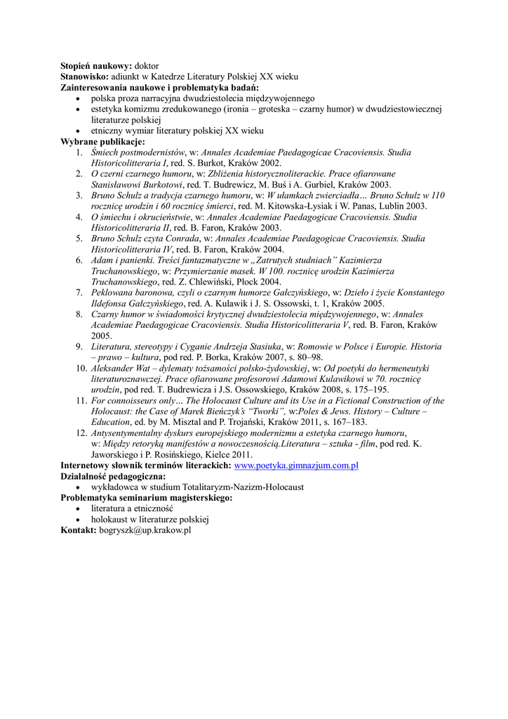 Stopień naukowy: doktor Stanowisko: adiunkt w Katedrze Literatury Polskiej XX wieku Zainteresowania naukowe i problematyka badań: polska proza narracyjna dwudziestolecia międzywojennego estetyka komizmu zredukowanego (ironia – groteska – czarny humor) w dwudziestowiecznej literaturze polskiej etniczny wymiar literatury polskiej XX wieku Wybrane publikacje: 1. Śmiech postmodernistów, w: Annales Academiae Paedagogicae Cracoviensis. Studia Historicolitteraria I, red. S. Burkot, Kraków 2002. 2. O czerni czarnego humoru, w: Zbliżenia historycznoliterackie. Prace ofiarowane Stanisławowi Burkotowi, red. T. Budrewicz, M. Buś i A. Gurbiel, Kraków 2003. 3. Bruno Schulz a tradycja czarnego humoru, w: W ułamkach zwierciadła… Bruno Schulz w 110 rocznicę urodzin i 60 rocznicę śmierci, red. M. Kitowska-Łysiak i W. Panas, Lublin 2003. 4. O śmiechu i okrucieństwie, w: Annales Academiae Paedagogicae Cracoviensis. Studia Historicolitteraria II, red. B. Faron, Kraków 2003. 5. Bruno Schulz czyta Conrada, w: Annales Academiae Paedagogicae Cracoviensis. Studia Historicolitteraria IV, red. B. Faron, Kraków 2004. 6. Adam i panienki. Treści fantazmatyczne w „Zatrutych studniach” Kazimierza Truchanowskiego, w: Przymierzanie masek. W 100. rocznicę urodzin Kazimierza Truchanowskiego, red. Z. Chlewiński, Płock 2004. 7. Peklowana baronowa, czyli o czarnym humorze Gałczyńskiego, w: Dzieło i życie Konstantego Ildefonsa Gałczyńskiego, red. A. Kulawik i J. S. Ossowski, t. 1, Kraków 2005. 8. Czarny humor w świadomości krytycznej dwudziestolecia międzywojennego, w: Annales Academiae Paedagogicae Cracoviensis. Studia Historicolitteraria V, red. B. Faron, Kraków 2005. 9. Literatura, stereotypy i Cyganie Andrzeja Stasiuka, w: Romowie w Polsce i Europie. Historia – prawo – kultura, pod red. P. Borka, Kraków 2007, s. 80–98. 10. Aleksander Wat – dylematy tożsamości polsko-żydowskiej, w: Od poetyki do hermeneutyki literaturoznawczej. Prace ofiarowane profesorowi Adamowi Kulawikowi w 70. rocznicę urodzin, pod red. T. Budrewicza i J.S. Ossowskiego, Kraków 2008, s. 175–195. 11. For connoisseurs only… The Holocaust Culture and its Use in a Fictional Construction of the Holocaust: the Case of Marek Bieńczyk’s “Tworki”, w:Poles & Jews. History – Culture – Education, ed. by M. Misztal and P. Trojański, Kraków 2011, s. 167–183. 12. Antysentymentalny dyskurs europejskiego modernizmu a estetyka czarnego humoru, w: Między retoryką manifestów a nowoczesnością.Literatura – sztuka - film, pod red. K. Jaworskiego i P. Rosińskiego, Kielce 2011. Internetowy słownik terminów literackich: www.poetyka.gimnazjum.com.pl Działalność pedagogiczna: wykładowca w studium Totalitaryzm-Nazizm-Holocaust Problematyka seminarium magisterskiego: literatura a etniczność holokaust w literaturze polskiej Kontakt: [email protected]