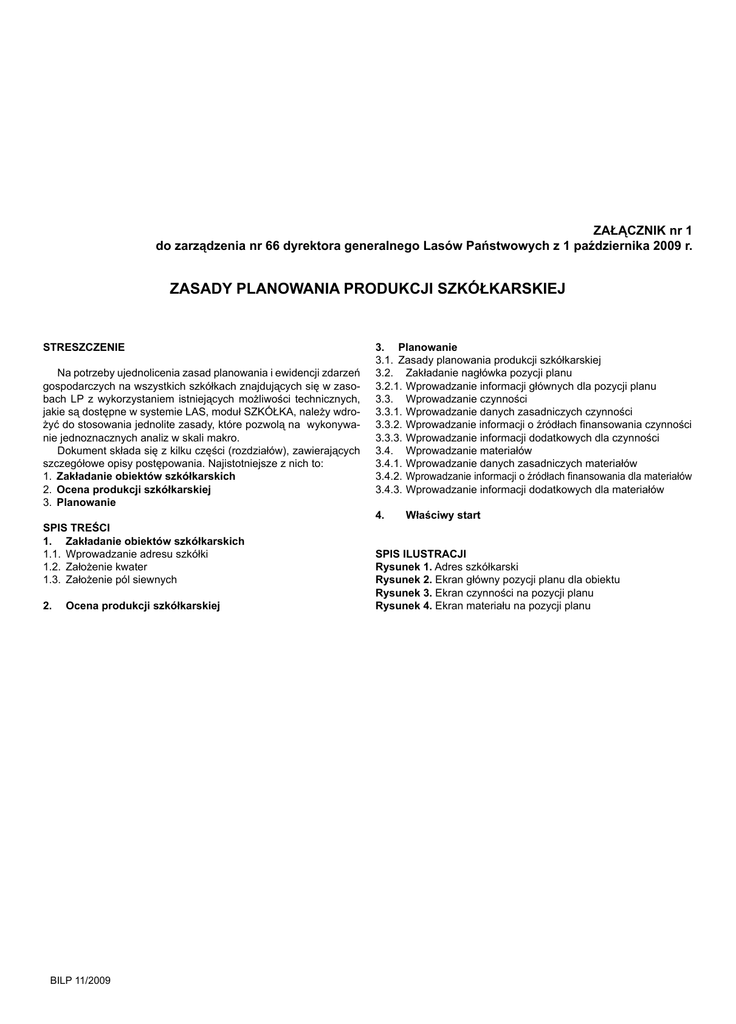 ZAŁĄCZNIK nr 1 do zarządzenia nr 66 dyrektora generalnego Lasów Państwowych z 1 października 2009 r. ZASADY PLANOWANIA PRODUKCJI SZKÓŁKARSKIEJ STRESZCZENIE Na potrzeby ujednolicenia zasad planowania i ewidencji zdarzeń gospodarczych na wszystkich szkółkach znajdujących się w zasobach LP z wykorzystaniem istniejących możliwości technicznych, jakie są dostępne w systemie LAS, moduł SZKÓŁKA, należy wdrożyć do stosowania jednolite zasady, które pozwolą na wykonywanie jednoznacznych analiz w skali makro. Dokument składa się z kilku części (rozdziałów), zawierających szczegółowe opisy postępowania. Najistotniejsze z nich to: 1. Zakładanie obiektów szkółkarskich 2. Ocena produkcji szkółkarskiej 3. Planowanie SPIS TREŚCI 1. Zakładanie obiektów szkółkarskich 1.1. Wprowadzanie adresu szkółki 1.2. Założenie kwater 1.3. Założenie pól siewnych 2. Ocena produkcji szkółkarskiej BILP 11/2009 3. Planowanie 3.1. Zasady planowania produkcji szkółkarskiej 3.2. Zakładanie nagłówka pozycji planu 3.2.1.Wprowadzanie informacji głównych dla pozycji planu 3.3. Wprowadzanie czynności 3.3.1.Wprowadzanie danych zasadniczych czynności 3.3.2.Wprowadzanie informacji o źródłach finansowania czynności 3.3.3.Wprowadzanie informacji dodatkowych dla czynności 3.4. Wprowadzanie materiałów 3.4.1.Wprowadzanie danych zasadniczych materiałów 3.4.2.Wprowadzanie informacji o źródłach finansowania dla materiałów 3.4.3.Wprowadzanie informacji dodatkowych dla materiałów 4. Właściwy start SPIS ILUSTRACJI Rysunek 1. Adres szkółkarski Rysunek 2. Ekran główny pozycji planu dla obiektu Rysunek 3. Ekran czynności na pozycji planu Rysunek 4. Ekran materiału na pozycji planu 1. ZAKŁADANIE OBIEKTÓW SZKÓŁKARSKICH 1.1. Wprowadzanie adresu szkółki W przypadku, gdy wcześniej nie założono szkółki w bazie, jest to pierwszy etap rejestracji, jaki należy wykonać. Adresy obiektów szkółkarskich zapisywane są w czterech polach adresu opisujących odpowiednio: Rysunek 1. Adres szkółkarski Nowo zakładana szkółka musi mieć podany numer szkółki, zapisywany w pierwszym polu adresu dla obiektów szkółkarskich. Pozostałe pola mają pozostać puste. Dla nowo zakładanej szkółki należy określić właściwy kod rodzaju szkółki. Kody rodzajów szkółki, dostępne do zastosowania: LEŚNA – szkółka leśna ZADRZEW – szkółka zadrzewieniowa KONTENER – szkółka kontenerowa TUNEL – szkółka tunelowa Kod rodzaju szkółki o kodzie „LEŚNA” należy interpretować jako „szkółka leśna polowa”, gdzie hoduje się sadzonki wyłącznie z odkrytym systemem korzeniowym. Kod rodzaju szkółki o kodzie „ZADRZEW” należy interpretować jako „szkółka zadrzewieniowa polowa”, gdzie produkuje się sadzonki wyłącznie z odkrytym systemem korzeniowym. Kod rodzaju szkółki o kodzie „KONTENER” należy interpretować jako „specjalistyczna szkółka kontenerowa”, gdzie produkuje się wyłącznie sadzonki z zakrytym systemem korzeniowym w doniczkach, pojemnikach, kasetach, balotach itp. Kod rodzaju szkółki o kodzie „TUNEL” należy interpretować jako „specjalistyczna szkółka leśna tunelowa”, gdzie produkuje się wyłącznie sadzonki z odkrytym systemem korzeniowym. Dla nowo zakładanej szkółki należy również określić powierzchnię całkowitą szkółki, podawaną w arach. Powierzchnia produkcyjna szkółki jest określona jako suma powierzchni kwater, na których są pola siewne dla danego roku. Dla nowo zakładanej szkółki można dodatkowo podać krótki opis szkółki, pozwalający na łatwiejszą jej identyfikację. Dla nowo zakładanej szkółki należy również określić nazwę szkółki. Będzie ona wykorzystana podczas zakładania grup powierzchni. Jeżeli nie poda się nazwy dla szkółki, nie będzie możliwe założenie grup powierzchni dla tej szkółki. W przypadku, gdy na szkółce znajduje się tunel foliowy, w którym produkuje się sadzonki, a który do tej pory traktowany był jako oddzielne pole siewne na szkółce o rodzaju „LEŚNA”, taki tunel należy opisać jako oddzielną szkółkę o rodzaju „TUNEL”. W przypadku, gdy szkółka ulega fizycznej likwidacji, w systemie nie wykonuje się żadnych specjalnych zapisów. Brak założonych dla tej szkółki pól siewnych niesie za sobą informację, że na tej szkółce nic nie rośnie w danym roku. Nie należy w żadnym wypadku zerować powierzchni takiej szkółki. W programie są założone blokady logiczne, niepozwalające na usunięcie adresów pól siewnych, jeśli zostały one użyte w innych tabelach, np. w systemie planów czy w historii szkółki. 1.2. Założenie kwater Założenie kwater polega na dodaniu numerów kwaterom i przypisaniu ich do wcześniej już założonej szkółki. Nie można założyć kwater dla nieistniejącej szkółki. Dla nowo zakładanej kwatery należy określić kod typu obiektu. Dopuszczalne wartości możliwe do użycia to: O – dla kwater przeznaczonych do produkcji na powierzchni otwartej (dla szkółek „LEŚNA” lub ZADRZEW”); K – dla kwater przeznaczonych do produkcji w warunkach kontrolowanych (dla szkółek „TUNEL” lub „KONTENER”). Dla nowo zakładanej kwatery należy również określić jej powierzchnię, podawaną w arach. Program sprawdza, czy suma powierzchni wszystkich kwater przypisanych do tego samego numeru szkółki nie przekracza jej całkowitej powierzchni. Dla nowo zakładanej kwatery można dodatkowo podać krótki jej opis, pozwalający na łatwiejszą identyfikację. 1.3. Założenie pół siewnych Założenie pól siewnych polega na dodaniu numerów pól siewnych i przypisaniu ich do już wcześniej założonych kwater na szkółce. Nie można założyć pól siewnych dla nieistniejącej kwatery. Adres pola siewnego składa się z numeru szkółki, numeru kwatery, roku pola siewnego planu, dla którego jest zakładane oraz numeru pola siewnego w ramach kw