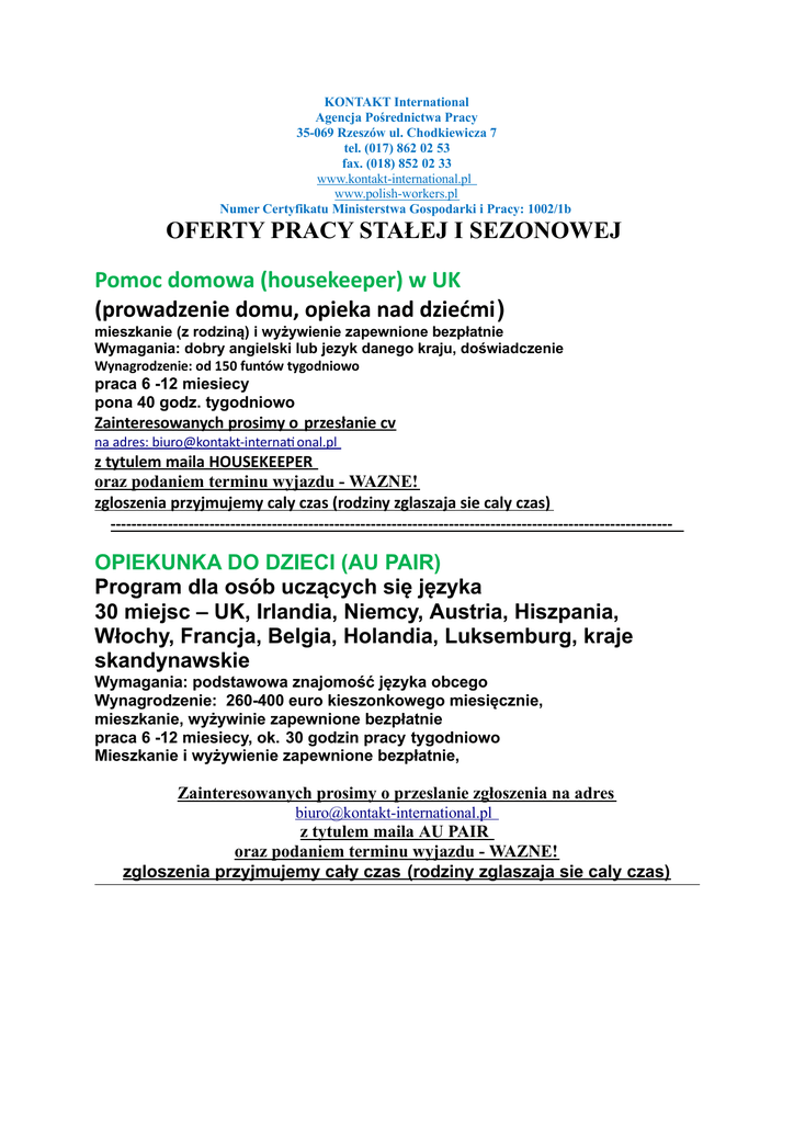 KONTAKT International Agencja Pośrednictwa Pracy 35-069 Rzeszów ul. Chodkiewicza 7 tel. (017) 862 02 53 fax. (018) 852 02 33 www.kontakt-international.pl www.polish-workers.pl Numer Certyfikatu Ministerstwa Gospodarki i Pracy: 1002/1b OFERTY PRACY STAŁEJ I SEZONOWEJ Pomoc domowa (housekeeper) w UK (prowadzenie domu, opieka nad dziećmi) mieszkanie (z rodziną) i wyżywienie zapewnione bezpłatnie Wymagania: dobry angielski lub jezyk danego kraju, doświadczenie Wynagrodzenie: od 150 funtów tygodniowo praca 6 -12 miesiecy pona 40 godz. tygodniowo Zainteresowanych prosimy o przesłanie cv na adres: biuro@kontakt-‐interna/ onal.pl z tytulem maila HOUSEKEEPER oraz podaniem terminu wyjazdu - WAZNE! zgloszenia przyjmujemy caly czas (rodziny zglaszaja sie caly czas) -‐-‐-‐-‐-‐-‐-‐-‐-‐-‐-‐-‐-‐-‐-‐-‐-‐-‐-‐-‐-‐-‐-‐-‐-‐-‐-‐-‐-‐-‐-‐-‐-‐-‐-‐-‐-‐-‐-‐-‐-‐-‐-‐-‐-‐-‐-‐-‐-‐-‐-‐-‐-‐-‐-‐-‐-‐-‐-‐-‐-‐-‐-‐-‐-‐-‐-‐-‐-‐-‐-‐-‐-‐-‐-‐-‐-‐-‐-‐-‐-‐-‐-‐-‐-‐-‐-‐-‐-‐-‐-‐-‐-‐-‐-‐-‐-‐-‐-‐-‐-‐-‐-‐-‐-‐-‐-‐-‐ OPIEKUNKA DO DZIECI (AU PAIR) Program dla osób uczących się języka 30 miejsc – UK, Irlandia, Niemcy, Austria, Hiszpania, Włochy, Francja, Belgia, Holandia, Luksemburg, kraje skandynawskie Wymagania: podstawowa znajomość języka obcego Wynagrodzenie: 260-400 euro kieszonkowego miesięcznie, mieszkanie, wyżywinie zapewnione bezpłatnie praca 6 -12 miesiecy, ok. 30 godzin pracy tygodniowo Mieszkanie i wyżywienie zapewnione bezpłatnie, Zainteresowanych prosimy o przeslanie zgłoszenia na adres [email protected] z tytulem maila AU PAIR oraz podaniem terminu wyjazdu - WAZNE! zgloszenia przyjmujemy cały czas (rodziny zglaszaja sie caly czas) OFERTY PRACY SEZONOWEJ SEZON 2010! 2-‐4 miesięcy w okresie czerwiec-‐wrzesień -‐ wakacje 2010 OPIEKUNKA DO DZIECI ( AU PAIR) 15 miejsc – UK, Irlandia, Niemcy, Austria, Hiszpania, Włochy sezon 2009 – wyjazdy w maju, czerwcu, lipcu Wymagania: komunikatywna znajomośc języka obcego Wynagrodzenie: 260-400 euro kieszonkowego miesięcznie 30 godzin pracy tygodniowo praca 2-4 miesiecy Mieszkanie i wyżywienie zapewnione bezpłatnie, często rodziny zabierają au pair na wspaniałe wakacje!!! Zainteresowanych prosimy o przeslanie zgłoszenia na adres [email protected] z tytulem maila AU PAIR WAKACJE 2009 zgloszenia przyjmujemy do wyczerpania sie miejsc! OSOBY DO ZBIORU TRUSKAWEK W NIEMCZECH SEZON 2010 BEZ ZNAJOMOŚCI JĘZYKA! stawki ok. 5 euro na rękę Sezon 20010 praca 8 tygodni Termin wyjazdu : od początku maja i lipca – dwa terminy praca zawsze na 2 miesiace Wymagania: dobry stan zdrowia, nie jest wymagana znajomość języka Wynagrodzenie: ok. 5 euro netto /godz. 40 godzin pracy tygodniowo plus nadgodziny Zainteresowanych prosimy o przeslanie cv na adres [email protected] z tytulem maila TRUSKAwki 2010 oraz podaniem terminu wyjazdu - WAZNE! zgloszenia przyjmujemy tylko do wyczerpania się miejsc!!!