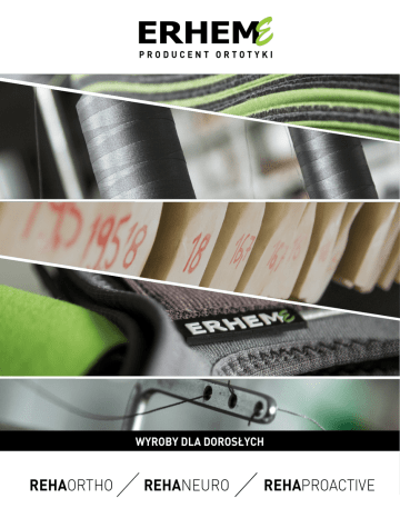 PRODUCENT ORTOTYKI WYROBY DLA DOROSŁYCH REHAORTHO REHANEURO REHAPROACTIVE KOMPLEKSOWOŚĆ I SAMODZIELNOŚĆ DZIAŁ SPRZEDAŻY Firma ERHEM jest producentem obecnym na rynku od kilkunastu lat. Umożliwi złożenie zamówienia oraz uzyskanie odpowiedzi związanych ze współpracą. Specjalizujemy się w projektowaniu i wykonawstwie wyrobów ortopedycznych, a także w produkcji elementów i podzespołów elektromechanicznych. Tel.: 14 681 23 80 506 010 330 Fax: 14 681 23 85 [email protected] Szerokie zaplecze techniczne oraz wciąż poszerzane doświadczenie dają nam możliwość realizacji seryjnych oraz nietypowych projektów dostosowanych do indywidualnych wymagań pacjentów. Wszystkie produkty, od najmniejszych elementów, wykonywane są w naszym zakładzie. IDEA Pomagamy w aktywizacji osób niepełnosprawnych. Działamy w sposób zintegrowany - w naszym zespole zatrudniamy osoby niepełnosprawne, co pozwala nam z większą empatią spojrzeć na potrzeby naszych klientów. BIURO OBSŁUGI KLIENTA Odpowie na pytania dotyczące produktów i zamówień. Tel.: 506 010 329 [email protected] OFERTA Stale doskonalimy proces produkcji i sprzedaży tak, aby finalnym efektem był produkt łączący innowacyjność z funkcjonalnym, a zarazem prostym działaniem. Nasze wyroby stanowią uzupełnienie procesu kompleksowej REHABILITACJI pacjentów o odmiennych potrzebach i problematyce klinicznej. NASZE produkty PODZIELILIŚMY NA TRZY GRUPY: REHAORTHO Wsparcie w procesie przywracania funkcji po znacznych urazach tkanek miękkich oraz kostnych. Zabezpieczenie w pierwszym okresie po zabiegu. WYTWÓRCA ERHEM Sp.j. 39-200 Dębica ul. Puszkina 6 www.erhem.pl REHANEURO REHAPROACTIVE Przeciwdziałanie powikłaniom. Profilaktyka urazów. Przywracanie mobilności oraz rozwijanie zdolności lokomocyjnych. Ochrona w trakcie aktywności rekreacyjnej i sportowej. Drobne urazy i przeciążenia. PRODUKT POLSKI WYRÓB INDYWIDUALNY W przypadku, w którym niemożliwe jest zastosowanie wyrobu seryjnego, proponujemy wykonanie wyrobu na zamówienie indywidualne. REHAORTHO REHAORTHO ERH 38/1 ERH 38 STABILIZATOR NADGARSTKA STABILIZATOR NADGARSTKA I KCIUKA ANATOMICZNE USZTYWNIENIA stabilizują staw od strony dłoniowej i grzbietowej. możliwość stopniowego usuwania usztywnień ANATOMICZNE WYPROFILOWANE USZTYWNIENIA stabilizują staw od strony dłoniowej, grzbietowej oraz od strony kości łokciowej. wyprofilowane USZTYWNIENIE od strony kości promieniowej unieruchamia również kciuk w wyproście. ZASTOSOWANIE DZIAŁANIE //Urazy i uszkodzenia struktur //Stabilizuje i unieruchamia staw w obrębie stawu. //Przeciążenia. //Złamania kości nadgarstka. //RZS. promieniowo-nadgarskowy w ułożeniu funkcjonalnym. ERH 38 ERH 38/1 ROZMIAR S M L XL ROZMIAR S M L XL OBWÓD NADGARSTKA 13-15 15-17 17-19 19-21 OBWÓD NADGARSTKA 13-15 15-17 17-19 19-21 WYSOKOŚĆ ORTEZY: 23 CM WYSOKOŚĆ ORTEZY: 23 CM WERSJA NA PRAWĄ LUB LEWĄ RĘKĘ WERSJA NA PRAWĄ LUB LEWĄ RĘKĘ NFZ /L.047 Orteza ręki stabilizująca lub korygująca. NFZ /L.048 Orteza na rękę i przedramię. 34 REHAORTHO: ERH 38 NFZ /L.047 ZASTOSOWANIE DZIAŁANIE //Urazy i uszkodzenia struktur //Stabilizuje i unieruchamia staw w obrębie stawu. //Złamania kości nadgarstka oraz kciuka. //Zespół Quervain’a. //Przeciążenia. //RZS. nadgarstkowy oraz kciuk. Orteza ręki stabilizująca lub korygująca. NFZ /L.048 Orteza na rękę i przedramię. REHAORTHO: ERH 38/1 35 REHAORTHO REHAORTHO ERH 47/1 ERH 50 STABILIZATOR STAWU NADGARSTKOWEGO - UNIWERSALNY SZYNA NA DŁOŃ I PRZEDRAMIĘ Z ODWIEDZIONYM KCIUKIEM Możliwość zmiany położenia usztywnień pozwala uniwersalnie stosować ortezę na prawą lub lewą rękę. Indywidualne formowaniE części dłoniowej Miękkie pasy dociągowe zapewniają optymalne dopasowanie. umożliwia korekcję ustawienia dłoni i palców. ERH 47 SZYNA NA DŁOŃ I PRZEDRAMIĘ Anatomicznie wyprofilowane usztywnienia stabilizują staw od strony dłoniowej, grzbietowej oraz od strony kości łokciowej. ZASTOSOWANIE DZIAŁANIE //Urazy i uszkodzenia struktur //Stabilizuje i unieruchamia staw w obrębie stawu. //Zespół cieśni nadgarstka. //Złamania kości nadgarstka. //RZS. ERH 50 ERH 47 | ERH 47/1 WYSOKOŚĆ ORTEZY: 23 CM ROZMIAR XS S M L ROZMIAR UNIWERSALNY OBWÓD NADGARSTKA 9-13 13-17 17-21 21-30 WERSJA UNIWERSALNA NA PRAWĄ I LEWĄ RĘKĘ DŁUGOŚĆ CAŁKOWITA 25 33 36 38 DŁUGOŚĆ NADGARSTEK-PALCE 14 17 18 19 promieniowo-nadgarstkowy w pozycji funkcjonalnej. NFZ /L.047 Orteza ręki stabilizująca lub korygująca. NFZ /L.048 Orteza na rękę i przedramię. 36 REHAORTHO: ERH 50 NFZ /L.047 Orteza ręki stabilizująca lub korygująca. ZASTOSOWANIE DZIAŁANIE //Złamania i pęknięcia kości ręki //Korygują ustawienie oraz dalszej nasady kości przedramienia. //Porażenia i niedowłady wiotkie oraz spastyczne. //Choroba zwyrodnieniowa stawów. //Przykurcz Dupuytrena. //RZS. oraz unieruchamiają staw nadgarstkowy, dłoń i palce w optymalnej pozycji. NFZ /L.048 Orteza na rękę i przedramię. REHAORTHO: ERH 47 | ERH 47/1 37 REHAPROACTIVE REHAORTHO ERH 42 ERH 42/1 APARAT NA RAMIĘ I PRZEDRAMIĘ SZYNOWO-OPASKOWY ORTEZA STAWU ŁOKCIOWEGO Cienkie szyny z ruchomym przegubem stabilizują bocznie staw łokciowy. Ruchome PRZEGUBY W szynACH bocznych umożliwiają unieruchomienie lub ograniczenie zakresu zgięcia i wyprostu stawu co 15°. Miękkie taśmy dociągowe ZMIANA długości taśm krzyżowych ogranicza wyprost stawu. ZASTOSOWANIE DZIAŁANIE // Przeprost w stawie łokciowym. // Niestabilność stawu. // Ból w okolicy stawu o charakterze // Stabilizuje oraz przeciwdziała przeciążeniowym. przeprostowi stawu łokciowego. zapewniają anatomiczne dopasowanie. ERH 42/1 ERH 42 ROZMIAR S M L XL ROZMIAR S M L OBWÓD PRZEZ STAW ŁOKCIOWY 23-25 25-28 28-31 31-34 DŁUGOŚĆ CAŁKOWITA ORTEZY 27 36 44 OBWÓD PRZEDRAMIENIA 5 CM PONIŻEJ STAWU 21-23 23-25 25-28 28-31 OBWÓD RAMIENIA I PRZEDRAMIENIA UNIWERSALNY WYSOKOŚĆ ORTEZY: 30 CM WERSJA UNIWERSALNA NA PRAWY I LE