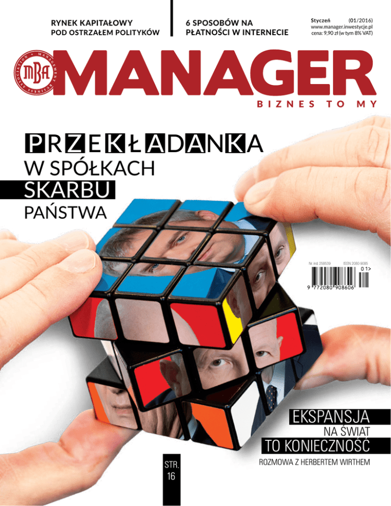 RYNEK KAPITAŁOWY 6 SPOSOBÓW NA PŁATNOŚCI W INTERNECIE POD OSTRZAŁEM POLITYKÓW Styczeń (01/2016) www.manager.inwestycje.pl cena: 9,90 zł (w tym 8% VAT) B I Z N E S T O M Y P R Z E K Ł ADANK A W SPÓŁKACH SKARBU PAŃSTWA Nr. ind. 258539 ISSN 2080-9085 EKSPANSJA NA ŒWIAT TO KONIECZNOŒÆ STR. 16 ROZMOWA Z HERBERTEM WIRTHEM TO BREAK THE RULES, YOU MUST FIRST MASTER THEM. THE VALLÉE DE JOUX. FOR MILLENNIA A HARSH, UNYIELDING ENVIRONMENT; AND SINCE 1875 THE HOME OF AUDEMARS PIGUET, IN THE VILLAGE OF LE B R A S S U S . T H E E A R LY WAT C H M A K E R S W E R E SHAPED HERE, IN AWE OF THE FORCE OF NATURE YET DRIVEN TO MASTER ITS MYSTERIES THROUGH THE COMPLEX MECHANICS OF THEIR CRAFT. STILL TODAY THIS PIONEERING SPIRIT INSPIRES US TO CONSTANTLY CHALLENGE THE CONVENTIONS OF FINE WATCHMAKING. ROYAL OAK PERPETUAL CALENDAR IN STAINLESS STEEL. HERMITAGE BOUTIQUE PLAC PIŁSUDSKIEGO 1 00-078 WARSZAWA [email protected] WWW.HERMITAGE.PL Edytorial CO SIĘ DZIEJE Karuzela kadrowa w spółkach Skarbu S pecjaliści nie są zgodni, ale liczbę stanowisk, na których w wyniku wyborów prezydenckich dokonuje się zmiana osoby, a bezpośredni wpływ na tę obsadę personalną ma prezydent Stanów Zjednoczonych, szacują na 3,5 tysiąca do 6 tysięcy. Inna sprawa, jakie to są osoby, ale... Ale kiedy uświadomimy sobie, że w Polsce w wyniku wyborów – co prawda nie prezydenckich, tylko parlamentarnych (sorry, taki mamy system) – dokonuje się zmiana na kilkudziesięciu tysiącach stanowisk (to w praktyce dotychczasowej), a po twórczym rozwinięciu tej zasady przez zwycięskie w ostatnich wyborach PiS, na kilkuset tysiącach stanowisk, to możliwości sprawcze prezydenta Stanów Zjednoczonych bledną. Co prawda, u nas jest to znacznie bardziej skomplikowane i rozłożone na większą liczbę dysponentów, ale liczby mówią same za siebie: powiedzmy 5 tysięcy w 320-milionowych Stanach i 500 tysięcy w 38-milionowej Polsce. Przedstawiający amerykański system prezydencki w krzywym zwierciadle twierdzili do niedawna, że tam sprawa jest prosta: wpłacasz na fundusz wyborczy kandydata na prezydenta 100 tysięcy dolarów, kandydat wygrywa, jesteś ambasadorem, powiedzmy, w Dżibuti, Burundi, może w... Polsce; wpłacasz milion lub więcej, jesteś ambasadorem w Rzymie, Kazimierz Krupa redaktor naczelny W Polsce nie mamy dojrzałej demokracji. Łup wyborczy dzielony jest po każdych wyborach Paryżu czy Londynie. Pewnie to przesada, ale coś w tym jest. U nas sprawa jest znacznie bardziej złożona. Ośrodek dyspozycyjny jest rozproszony choćby z tego powodu, że jedna osoba nie byłby w stanie ogarnąć zmiany na setkach tysięcy stanowisk. I tu zaczyna się istota problemu: spójność i styl zmian. W dojrzałych demokracjach nie ma problemu: zmienia się, powiedzmy, minister, za nim idzie kilku doradców i ekspertów, ale już dyrektorzy departamentów, że o naczelnikach nie wspomnę, pracują spokojnie. O wymianie prezesów kontrolowanych przez państwo firm nikt nawet nie myśli. W Polsce nie mamy dojrzałej demokracji. Łup wyborczy dzielony jest po każdych wyborach, ba, jego wizja jest siłą napędową kampanii. Tak mamy i już. Decydujące są zatem spójność i styl zmian. Ze stylem różnie bywa, bo niektórzy zwalniani przez nową władzę nie zdążyli nawet zakręcić słoika z herbatą, a już ich nie było. A co ze spójnością? Pierwsze sygnały nie są budujące: jednodniowy prezes PKP, polityczni, rozpoznawalni, ale bez biznesowego doświadczenia nominanci w kluczowych spółkach, „no name” w innych. A to przecież dopiero początek lawiny, zobaczymy co będzie dalej. I będziemy uważnie monitorowali. Po owocach zamierzamy ich poznawać. 2016 Styczeń fot.: Archiwum Mówi się, że prezydent Stanów Zjednoczonych może wszystko. No, prawie wszystko. Rzeczywiście, ma ogromne kompetencje (wszak ustrój polityczny w Ameryce nazywa się prezydenckim), ale przy naszych politykach to on... niewiele może 3 spis treści styczeń 2016 16 Przekładanka w spółkach Skarbu Państwa Ilu fachowców, ilu partyjnych nominatów CO SIĘ DZIEJE INWESTYCJE 12 40 Prognozy 2016 Pomiędzy mikro a makro Zmiany kadrowe 24Rynek kapitałowy pod ostrzałem polityków Inwestorzy nie wiedzą, co przyniesie jutro MANAGER 360˚ 94 Rośnie polski rynek fotografii kolekcjonerskiej 26 Herbert Wirth Ekspansja na świat to konieczność LUDZIE 48 Gregorz Ślak Jak przygotować sukcesora w firmie? RYNEK 32 Płatności mobilne 6 sposobów skutecznego działania 64 Human Resources Studia podyplomowe EMBA 36Outsourcing Polska do usług 66Kariera Manager do zadań specjalnych KGHM: ekspansja na świat to konieczność Styczeń 2016 Inteligentny dom E-mail do pralki 60 Bogusław Kott Projekty CSR i pasja fotografowania 26 Herbert Wirth 6 44 Dyrektor artystyczny Maja Hałko [email protected] Redaktor naczelny Kazimierz Krupa [email protected] Studio Jakub Waluchowski [email protected] Dział Ludzie Andrzej Mroziński [email protected] 68 Kapitał intelektualny Jak mieć wszystko nie mając nic 72 Startup Summit 2015 Mobilność ante portas 74 Wirtualizacja i bezpieczeństwo Technologie IT w biznesie 48 Sukcesja w polskich firmach Grzegorz Ślak o przygotowaniu dzieci do kariery managerskiej Dział IT, Nauka Wojciech Gryciuk [email protected] Webmaster Paweł Cegłowski [email protected] Manager.inwestycje.pl Wojciech Kwinta [email protected] Felietony, komentarze Dariusz Jarosz, Andrzej Nierychło, Wiktor Legowicz Manager Report Wojciech Gryciuk [email protected] Dział Foto Dariusz Breś www.dariuszbres.pl Bartosz Grzywna [email protected] Dział Moto Maciej Pertyński [email protected] Rynek, Inwestycje Piotr Stefański [email protected] Back Office Manager Anna Pietrzak [email protected] kom. 693 540 650 Dyrektor Handlowy Lidia Garbaczuk kom. 600 013 314 [email protected] Key Account Manager Joanna Biedrzycka kom. 501 373 813 [email protected] Dyrektor ds. Projektów Specjalnych Andrzej Stepanów kom. 600 013