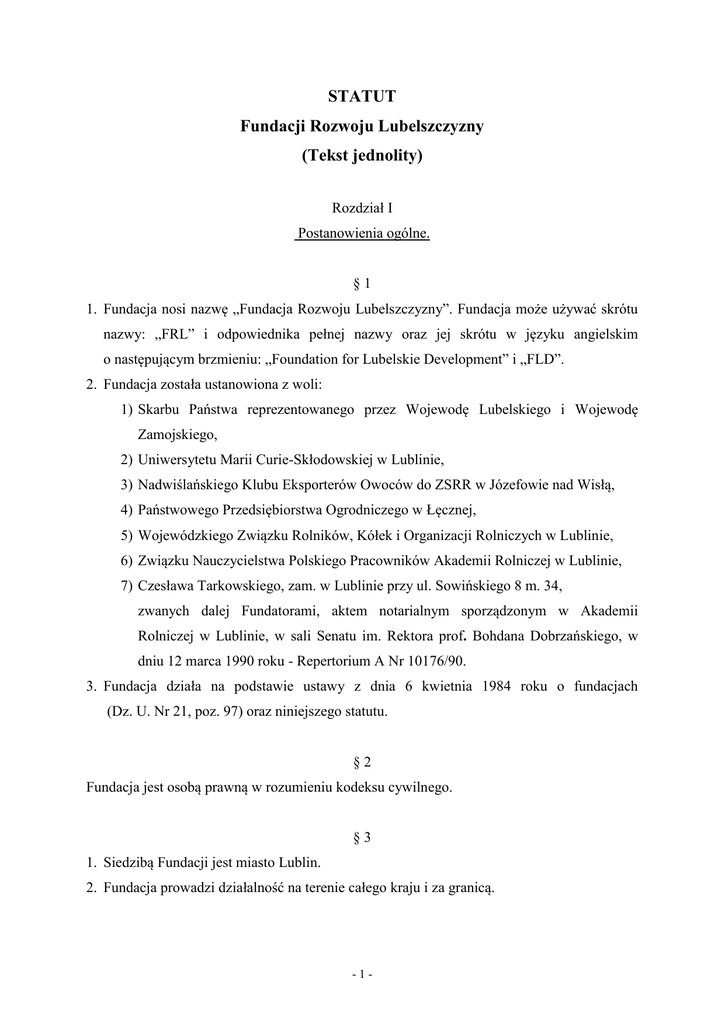 STATUT Fundacji Rozwoju Lubelszczyzny (Tekst jednolity) Rozdział I Postanowienia ogólne. §1 1. Fundacja nosi nazwę „Fundacja Rozwoju Lubelszczyzny”. Fundacja może używać skrótu nazwy: „FRL” i odpowiednika pełnej nazwy oraz jej skrótu w języku angielskim o następującym brzmieniu: „Foundation for Lubelskie Development” i „FLD”. 2. Fundacja została ustanowiona z woli: 1) Skarbu Państwa reprezentowanego przez Wojewodę Lubelskiego i Wojewodę Zamojskiego, 2) Uniwersytetu Marii Curie-Skłodowskiej w Lublinie, 3) Nadwiślańskiego Klubu Eksporterów Owoców do ZSRR w Józefowie nad Wisłą, 4) Państwowego Przedsiębiorstwa Ogrodniczego w Łęcznej, 5) Wojewódzkiego Związku Rolników, Kółek i Organizacji Rolniczych w Lublinie, 6) Związku Nauczycielstwa Polskiego Pracowników Akademii Rolniczej w Lublinie, 7) Czesława Tarkowskiego, zam. w Lublinie przy ul. Sowińskiego 8 m. 34, zwanych dalej Fundatorami, aktem notarialnym sporządzonym w Akademii Rolniczej w Lublinie, w sali Senatu im. Rektora prof. Bohdana Dobrzańskiego, w dniu 12 marca 1990 roku - Repertorium A Nr 10176/90. 3. Fundacja działa na podstawie ustawy z dnia 6 kwietnia 1984 roku o fundacjach (Dz. U. Nr 21, poz. 97) oraz niniejszego statutu. §2 Fundacja jest osobą prawną w rozumieniu kodeksu cywilnego. §3 1. Siedzibą Fundacji jest miasto Lublin. 2. Fundacja prowadzi działalność na terenie całego kraju i za granicą. -1- §4 Fundacja używa okrągłej pieczęci z napisem w otoku wskazującym jej nazwę i siedzibę. Pieczęć zawiera ponadto znak Fundacji. §5 Nadzór nad Fundacją sprawuje minister właściwy do spraw nauki. Rozdział II Cele, Środki i Zasady Działania Fundacji. §6 Celem statutowym Fundacji jest : 1) wspomaganie rozwoju przedsiębiorczości i gospodarki regionu, 2) promocja zatrudnienia oraz aktywizacja zawodowa osób bezrobotnych i zagrożonych bezrobociem, 3) wspieranie rozwoju rolnictwa i obszarów wiejskich oraz prowadzenie doradztwa rolniczego, 4) wspieranie rozwoju wspólnot i społeczności lokalnych, 5) popieranie rozwoju nauki, techniki i innowacji, 6) wspieranie rozwoju oświaty, edukacji i kształcenia ustawicznego oraz racjonalnego wykorzystania kadr, 7) działanie na rzecz integracji europejskiej oraz rozwijania kontaktów i współpracy międzynarodowej, 8) działanie na rzecz ochrony środowiska naturalnego i bezpiecznych warunków pracy, 9) działanie na rzecz rehabilitacji zawodowej osób niepełnosprawnych, integracji społecznej osób zagrożonych wykluczeniem oraz reintegracji zawodowej i społecznej osób wykluczonych, 10) promocja i organizacja wolontariatu, 11) wspieranie rozwoju kultury i sztuki oraz ochrona dziedzictwa narodowego, 12) popieranie rozwoju turystyki, sportu i rekreacji. §7 Fundacja w ograniczonym, lecz niezbędnym zakresie będzie prowadzić działalność gospodarczą, z której wpływy będą przeznaczane na realizację celów statutowych. -2- §8 Fundacja realizuje swoje cele, m.in. poprzez: 1) organizowanie i prowadzenie szkoleń, seminariów i konferencji, 2) organizowanie i prowadzenie doradztwa personalnego, poradnictwa zawodowego i pośrednictwa pracy, 3) organizowanie i prowadzenie doradztwa gospodarczego, rolniczego, prawnego i finansowego, 4) opracowywanie ekspertyz, raportów i analiz związanych z realizacją celów statutowych, 5) rozwijanie kontaktów i współpracy z organizacjami i instytucjami działającymi na rzecz umacniania społeczeństwa obywatelskiego, 6) finansowanie prac naukowych, badawczych i wdrożeniowych związanych z nowymi technologiami i zarządzaniem, 7) przyznawanie, szczególnie wyróżniającym się studentom i pracownikom naukowym stypendiów na prowadzenie prac badawczych i naukowych w kraju i za granicą, 8) przyznawanie nagród studentom i pracownikom naukowym za wybitne osiągnięcia naukowe, 9) udzielanie pomocy w zaopatrywaniu Biblioteki Głównej Uniwersytetu Przyrodniczego w Lublinie w zagraniczne książki, czasopisma i wydawnictwa fachowe, 10) organizowanie wydawania prac naukowych, w tym finansowanie tłumaczeń z literatury obcojęzycznej, 11) uruchamianie i prowadzenie inkubatorów przedsiębiorczości i parków technologicznych, 12) rozwijanie idei clusteringu oraz tworzenie klastrów i koordynacja ich działalności. §9 Fundacja może wspierać działalność innych osób prawnych i fizycznych, które prowadzą działalność zbieżną z działalnością statutową Fundacji. § 10 Fundacja realizując swoje cele współpracuje z jednostkami samorządu terytorialnego, szkołami wyższymi, organizacjami przedsiębiorców oraz innymi partnerami społecznymi. -3- § 11 1. Fundacja realizuje swoje cele zgodnie z podstawowymi interesami Rzeczypospolitej Polskiej oraz z obowiązującym prawem. 2. Zakres działalności gospodarczej oraz zasady gospodarki finansowej i ewidencji księgowej określają załączniki do Statutu. Rozdział III Organy i Organizacja Fundacji. § 12 Organami Fundacji są: Zarząd Fundacji i Rada Fundacji. § 13 Zarząd kieruje działalnością Fundacji i reprezentuje ją na zewnątrz. § 14 1. Zarząd Fundacji składa się z jednej do trzech osób. 2. Członków Zarządu pierwszej kadencji powołują Fundatorzy, natomiast Członków Zarządu następnych kadencji powołuje Rada Fundacji. 3. W akcie powołania ustala się, który z powołanych Członków Zarządu zajmuje stanowisko Prezesa Zarządu oraz Wiceprezesa Zarządu. 4. Członkowie Zarządu powoływani są na kadencje trzyletnie. 5. Mandaty Członków Zarządu wygasają z datą: 1) upływu kadencji, 2) śmierci, 3) odwołania. 6. Odwołania Członka Zarządu może dokonać Rada Fundacji w przypadku: 1) złożenia przez Członka Zarządu rezygnacji z pełnienia funkcji w Zarządzie, 2) istotnego naruszenia postanowień Statutu, 3) nienależytego wykonywania funkcji Członka Zarządu. 4) Zarząd Fundacji w całości lub jego poszczególni członkowie mogą być odwołani przez Radę Fundacji przed upł