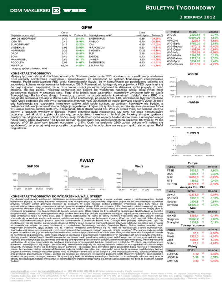 BIULETYN TYGODNIOWY o 3 SIERPNIA 2012 GPW Największe wzrosty* JHM DEVELOPMENT IDEA TFI EUROIMPLANT VINDEXUS HERKULES DROP BOMI MAKARONPL PGODLEW MO-BRUK * dotyczy spółek z indeksu WIG Cena zamknięcia 0,30 2,40 0,11 3,92 0,25 8,30 0,40 2,80 2,03 63,00 Zmiana % 30,43% 26,98% 22,22% 20,99% 19,05% 18,57% 17,65% 16,18% 14,69% 14,55% Cena zamknięcia 0,38 0,70 0,39 0,23 13,25 2,16 0,73 3,60 4,93 5,63 Największe spadki* ENERGOPLD AWBUD IDM MIRACULUM SYGNITY TUP ZASTAL UNIBEP ENERGOPOL SELENA FM Zmiana % -39,68% -20,45% -17,02% -14,81% -14,46% -13,60% -13,10% -11,98% -11,81% -11,76% KOMENTARZ TYGODNIOWY Mijający tydzień należał do banków centralnych. Środowe posiedzenie FED, a zwłaszcza czwartkowe posiedzenie EBC rozpaliły oczekiwania inwestorów i spowodowały, że zmienność na rynkach finansowych zdecydowanie wzrosła. Przed posiedzeniem FED wielu komentatorów liczyło, że w komunikacie po posiedzeniu pojawią się zapowiedzi kolejnej rundy luzowania ilościowego QE 3. Ponieważ nic takiego się nie pojawiło, a FED ograniczył się do zwyczajowych zapewnień, że w razie konieczności podejmie odpowiednie działania, rynki przyjęły to dość chłodno, ale bez paniki. Ponieważ komunikat ten pojawił się wieczorem naszego czasu, nasz rynek mógł zareagować dopiero w czwartek rano. Tego dnia jednak oczy wszystkich inwestorów zwrócone były na szefa Europejskiego Banku Centralnego. Inwestorzy czekali na przedstawienie konkretnych działań, które EBC ma podjąć dla ratowania sytuacji w strefie euro. Przed konferencją po posiedzeniu EBC oczekiwania były bardzo duże nasz rynek podobnie jak inne rynki europejskie zyskiwał. WIG 20 znalazł się nawet powyżej poziomu 2200. Jednak gdy konferencja się rozpoczęła inwestorzy szybko zdali sobie sprawę, że żadnych konkretów nie będzie, a zwłaszcza deklaracji na temat skupu obligacji zagrożonych krajów. Na rynkach rozpoczęła się silna przecena, która w Europie średnio przekraczała 2%, a hiszpański IBEX stracił ponad 5%. WIG 20 stracił mniej niż procent, co było jednym z lepszych wyników w Europie. Piątek przyniósł dużą niepewność czy rynki nie będą kontynuowały przeceny. Jednak dość szybko okazało się, ze optymizmu inwestorom nie brakuje. Indeksy akcyjne zyskiwały praktycznie od godzin porannych do końca sesji. Dodatkowo rynki wsparły bardzo dobre dane z amerykańskiego rynku pracy, gdzie stworzono 163 tysiące nowych miejsc pracy przy oczekiwaniach na poziomie 100 tysięcy. W ten sposób WIG 20 zakończył tydzień wzrostem o 2,8%. Opór na poziomie 2200 został pokonany i można się spodziewać, że przynajmniej na początku przyszłego tygodnia optymizm na naszym rynku się utrzyma. Rafał Bogusławski Indeks WIG 20 WIG mWIG40 WIG-Banki WIG-Budowl WIG-Dewel WIG-Info WIG-Media WIG-Paliwa WIG-Spoż. WIG-Chemia 03.08. 2222,64 40594,36 2226,1 5785,32 1470,12 1159,54 1051,58 2301,57 2727,18 3634,95 8615,39 Zmiana 2,77% 1,65% -1,63% 3,61% -2,40% -0,84% -1,99% 0,12% 3,35% 2,48% -2,75% WIG 20 3200 2700 2200 1700 1200 01-2011 07-2011 01-2012 07-2012 mWIG40 3250 2500 1750 1000 01-2011 07-2011 01-2012 07-2012 EURPLN 5 4,5 4 3,5 3 01-2011 ŚWIAT S&P 500 Miedź Ropa Indeks FTSE DAX BUX RTS ISE 100 150 1300 7750 110 6000 900 70 500 01-2011 4250 30 07-2011 01-2012 07-2012 01-2011 2500 07-2011 01-2012 07-2012 01-2011 07-2011 01-2012 07-2012 KOMENTARZ TYGODNIOWY DO WYDARZEŃ NA WALL STREET Po ubiegłotygodniowych werbalnych działaniach przedstawicieli EBC, inwestorzy z coraz większą uwagą i zainteresowaniem śledzili doniesienia płynące ze strony Rezerwy Federalnej oraz europejskiego odpowiednika. Poprzedni piątek na fali rozbudzonych oczekiwań przyniósł wyraźny wzrost głównych indeksów za oceanem. W dobre nastroje będące pokłosiem wypowiedzi szefa EBC wpisał się symbolicznie przekraczający oczekiwania odczyt dynamiki amerykańskiego PKB na poziomie 1,5%. Poprzedni tydzień zakończył się więc popytowym akcentem dającym wiarę w kolejne wzrosty na rynkach. Poniedziałek można uznać za sukces byków, które nie złożyły broni w rynkowych zmaganiach, nie dopuszczając do korekty kursów akcji, której można się było naturalnie spodziewać. Nadchodząca w oczach i umysłach wielu inwestorów skoordynowana akcja banków centralnych przyniosła wyciszenie nastrojów i ograniczenie zmienności. Wtorkowa sesja przedłużyła flautę na rynku akcji, stąd w obliczu oczekiwania na ruchu ze strony Rezerwy Federalnej oraz EBC główne indeksy poruszały się w wąskich korytarzach wahań, ostatecznie kończąc dzień symbolicznymi stratami. Choć na rynek napłynęło kilka dobrych danych makroekonomicznych (indeks zaufania konsumentów Conference Board oraz Chicago PMI powyżej konsensusu), byki nie zmobilizowały się do bardziej agresywnego działania. Kolejny dzień ponownie przyniósł bezruch głównych indeksów, jednakże taka sytuacja utrzymywała się jedynie do czasu konferencji po posiedzeniu Federalnego Komitetu Otwartego Rynku. Środa bowiem rozwiała część wątpliwości inwestorów, gdyż okazało się, że Rezerwa Federalna powstrzymuje się na razie od dodatkowych działań stymulujących. Końcówka sesji nieco rozruszała rynek, gdyż część uczestników rynkowych zmagań po prostu „liczyła na więcej”. W czwartek podjęta została w pełni oczekiwana decyzja w kwestii pozostawienia bez zmian stóp procentowych w strefie euro. Uwaga inwestorów skupiona jednak została na konferencji po posiedzeniu, która miała przynieść informacje o potencjalnych niestandardowych rozwiązaniach szykowanych przez EBC. Niestety również Mario Draghi zawiódł inwestorów, co zaowocowało gwałtowną reakcją rynku walutowego oraz przeceną na rynkach akcji. Piątkowa sesja domykająca tydzień może znaleźć się pod wpływem publikowanych danych z amerykańskiego rynku pracy. Rynki są wyraźnie rozchwiane, do czego przyczyniają się werbalne interwencje przedst