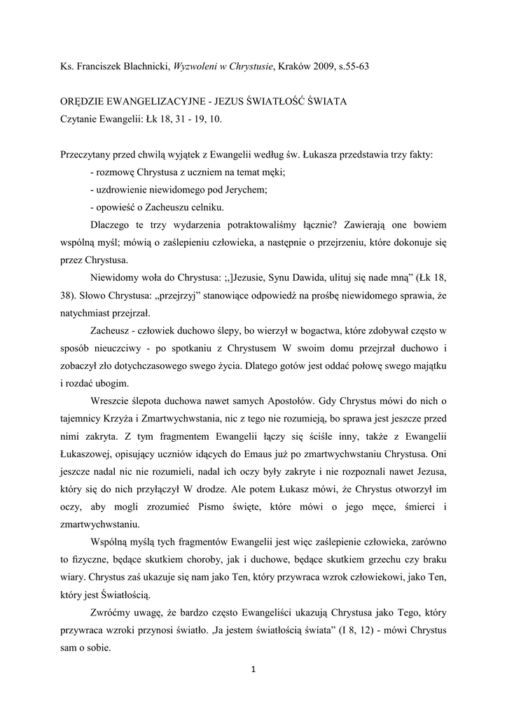 Ks. Franciszek Blachnicki, Wyzwoleni w Chrystusie, Kraków 2009, s.55-63 ORĘDZIE EWANGELIZACYJNE - JEZUS ŚWIATŁOŚĆ ŚWIATA Czytanie Ewangelii: Łk 18, 31 - 19, 10. Przeczytany przed chwilą wyjątek z Ewangelii według św. Łukasza przedstawia trzy fakty: - rozmowę Chrystusa z uczniem na temat męki; - uzdrowienie niewidomego pod Jerychem; - opowieść o Zacheuszu celniku. Dlaczego te trzy wydarzenia potraktowaliśmy łącznie? Zawierają one bowiem wspólną myśl; mówią o zaślepieniu człowieka, a następnie o przejrzeniu, które dokonuje się przez Chrystusa. Niewidomy woła do Chrystusa: ;,]Jezusie, Synu Dawida, ulituj się nade mną” (Łk 18, 38). Słowo Chrystusa: „przejrzyj” stanowiące odpowiedź na prośbę niewidomego sprawia, że natychmiast przejrzał. Zacheusz - człowiek duchowo ślepy, bo wierzył w bogactwa, które zdobywał często w sposób nieuczciwy - po spotkaniu z Chrystusem W swoim domu przejrzał duchowo i zobaczył zło dotychczasowego swego życia. Dlatego gotów jest oddać połowę swego majątku i rozdać ubogim. Wreszcie ślepota duchowa nawet samych Apostołów. Gdy Chrystus mówi do nich o tajemnicy Krzyża i Zmartwychwstania, nic z tego nie rozumieją, bo sprawa jest jeszcze przed nimi zakryta. Z tym fragmentem Ewangelii łączy się ściśle inny, także z Ewangelii Łukaszowej, opisujący uczniów idących do Emaus już po zmartwychwstaniu Chrystusa. Oni jeszcze nadal nic nie rozumieli, nadal ich oczy były zakryte i nie rozpoznali nawet Jezusa, który się do nich przyłączył W drodze. Ale potem Łukasz mówi, że Chrystus otworzył im oczy, aby mogli zrozumieć Pismo święte, które mówi o jego męce, śmierci i zmartwychwstaniu. Wspólną myślą tych fragmentów Ewangelii jest więc zaślepienie człowieka, zarówno to fizyczne, będące skutkiem choroby, jak i duchowe, będące skutkiem grzechu czy braku wiary. Chrystus zaś ukazuje się nam jako Ten, który przywraca wzrok człowiekowi, jako Ten, który jest Światłością. Zwróćmy uwagę, że bardzo często Ewangeliści ukazują Chrystusa jako Tego, który przywraca wzroki przynosi światło. ,Ja jestem światłością świata” (I 8, 12) - mówi Chrystus sam o sobie. 1 W Ewangelii według św. Jana znajdujemy takie słowa: ,Jeżeli będziecie trwać w nauce mojej, będziecie prawdziwie moimi uczniami i poznacie prawdę, a prawda was wyzwoli” (I 8, 31). Chrystus zapowiada nasze wyzwolenie przez prawdę. Prawda to jest właśnie światło. Dzięki prawdzie dokonuje się nasze przejrzenie, które jest równocześnie naszym pragnieniem wyzwolenia. Człowiek jest wtedy wolny, kiedy kieruje się w swoim życiu światłem, czyli prawdą. Taką wolność może przy- nieść człowiekowi jedynie Chrystus Światłość świata, Ten, który jest prawdziwym przejrzeniem niewidomych! Chcemy dzisiaj spotkać Chrystusa jako Tego, który jest naszym Światłem i chcemy jak ten niewidomy z Ewangelii wołać: ,,Jezusie, Synu Dawida, zmiłuj się nade mną, spraw abym przejrzał”. Każdy z nas jest mniej lub więcej ślepy duchowo; jeszcze nie ma w nas w pełni światła Chrystusowego. Nieraz stawiamy sobie pytanie: dlaczego nie ma w nas pełni światła, dlaczego jest w nas tyle ciemności, jakie siły działające w naszym życiu sprawiają, iż pogrążamy się w mroku? Musimy sobie jasno uświadomić, jakie czynniki wpływają na to, że człowiek pogrąża się w mroku. W pierwszej nauce rekolekcyjnej mówiliśmy, że Chrystus jest pełen Ducha Świętego, że zsyła Ducha Świętego do naszych serc i uwalnia nas od złego ducha, od ducha nieczystego. Mówiliśmy, że jest to walka między Duchem Świętym, którego udziela Chrystus, a duchem nieczystym, który zdobywa nad nami panowanie przede wszystkim przez alkohol. Przytaczaliśmy różne przykłady z naszego życia, kiedy to w momentach, gdy Kościół przez sakramenty udziela Ducha Świętego, szatan dołącza się ze swoim planem i przez wódkę od razu chce nam odebrać łaskę Ducha Świętego otrzymaną poprzez te sakramenty. Działanie złego ducha poprzez alkohol możemy również przeanalizować w kontekście dzisiejszego fragmentu Ewangelii, w kontekście tajemnicy Chrystusa - Światłości świata. W języku polskim jest takie słowo, które bardzo trafnie określa zjawisko pijaństwa, mianowicie zamroczenie alkoholowe. Słowo to pochodzi od pojęcia mroku, ciemności. Zamroczenie to pozbawienie człowieka światła. Alkohol właśnie w ten sposób działa na człowieka, że pozbawia go światła i pogrąża w coraz większym mroku. Wystarczy jeden kieliszek wódki, żeby umysł człowieka nie działał tak sprawnie, jak przedtem. Wiadomo, że wystarczy jeden kieliszek wódki, żeby już było tyle alkoholu we krwi, że kierowca może spowodować wypadek, za który będzie karany. Już taka mała ilość alkoholu sprawia, że wzrok nie jest już taki sprawny, że człowiek już nie ma takiego szybkiego refleksu. Gdy człowiek pije troszkę więcej, to mówimy, że ma mętny wzrok, spojrzenie zamglone, że widzi podwójnie, wszystko mu się zlewa. Takie jest właśnie działanie alkoholu, które pogrąża człowieka w mroku, aż dochodzi do tego, że człowiek zupełnie traci świadomość i nie wie, co 2 robi, nie zdaje sobie sprawy ze swoich uczynków. Traci zdolność, która odróżnia człowieka od zwierzęcia, mianowicie świadomość refleksyjną, czyli zdolność do kontrolowania samego siebie w świetle rozumu i sumienia. Tego właśnie światła pozbawia człowieka alkohol. Św. Jan Vianney, proboszcz z Ars, w jednym ze swoich kazań na temat pijaństwa przytaczał taki przykład. Starożytni Spartanie nie używali alkoholu i wychowywali swoją młodzież w abstynencji i trzeźwości. Spartanie byli jednym z naj- dzielniejszych narodów w czasach starożytnych. Ażeby młodzież od- straszyć od pijaństwa i używania alkoholu, raz w roku specjalnie upijali niewolnika i przyprowadzali go do młodzieży. Mło