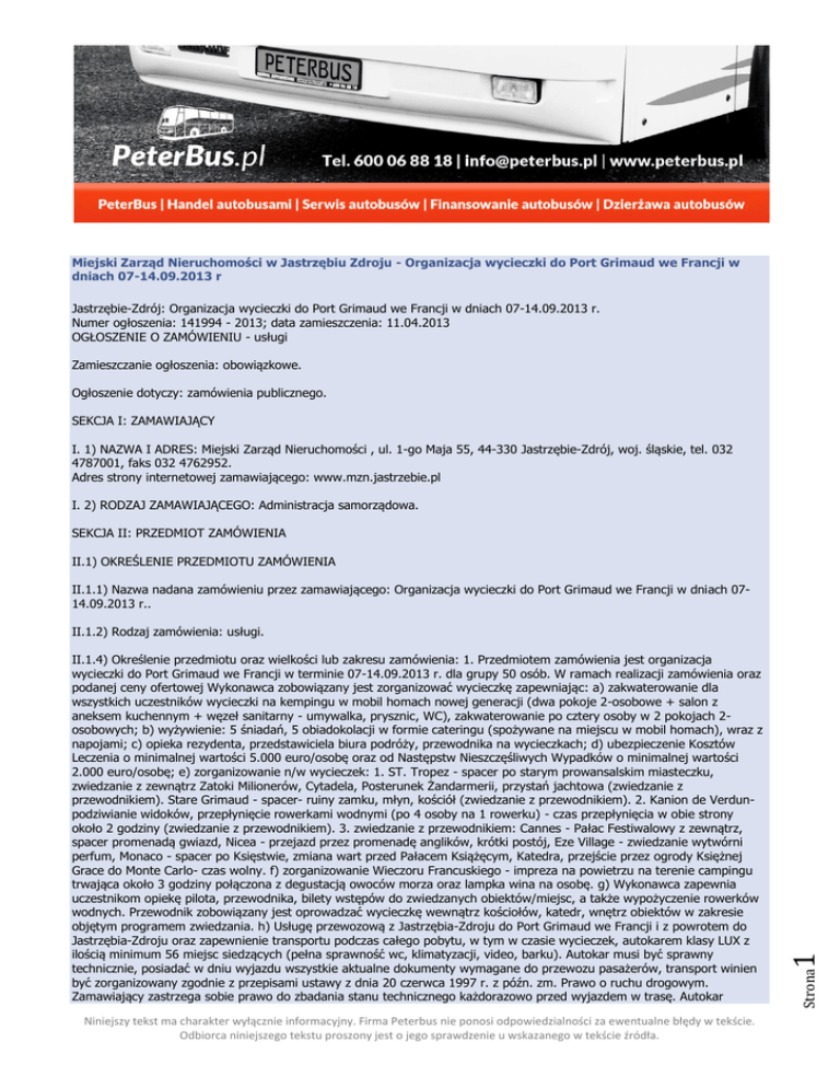 Miejski Zarząd Nieruchomości w Jastrzębiu Zdroju - Organizacja wycieczki do Port Grimaud we Francji w dniach 07-14.09.2013 r Jastrzębie-Zdrój: Organizacja wycieczki do Port Grimaud we Francji w dniach 07-14.09.2013 r. Numer ogłoszenia: 141994 - 2013; data zamieszczenia: 11.04.2013 OGŁOSZENIE O ZAMÓWIENIU - usługi Zamieszczanie ogłoszenia: obowiązkowe. Ogłoszenie dotyczy: zamówienia publicznego. SEKCJA I: ZAMAWIAJĄCY I. 1) NAZWA I ADRES: Miejski Zarząd Nieruchomości , ul. 1-go Maja 55, 44-330 Jastrzębie-Zdrój, woj. śląskie, tel. 032 4787001, faks 032 4762952. Adres strony internetowej zamawiającego: www.mzn.jastrzebie.pl I. 2) RODZAJ ZAMAWIAJĄCEGO: Administracja samorządowa. SEKCJA II: PRZEDMIOT ZAMÓWIENIA II.1) OKREŚLENIE PRZEDMIOTU ZAMÓWIENIA II.1.1) Nazwa nadana zamówieniu przez zamawiającego: Organizacja wycieczki do Port Grimaud we Francji w dniach 0714.09.2013 r.. Niniejszy tekst ma charakter wyłącznie informacyjny. Firma Peterbus nie ponosi odpowiedzialności za ewentualne błędy w tekście. Odbiorca niniejszego tekstu proszony jest o jego sprawdzenie u wskazanego w tekście źródła. Strona II.1.4) Określenie przedmiotu oraz wielkości lub zakresu zamówienia: 1. Przedmiotem zamówienia jest organizacja wycieczki do Port Grimaud we Francji w terminie 07-14.09.2013 r. dla grupy 50 osób. W ramach realizacji zamówienia oraz podanej ceny ofertowej Wykonawca zobowiązany jest zorganizować wycieczkę zapewniając: a) zakwaterowanie dla wszystkich uczestników wycieczki na kempingu w mobil homach nowej generacji (dwa pokoje 2-osobowe + salon z aneksem kuchennym + węzeł sanitarny - umywalka, prysznic, WC), zakwaterowanie po cztery osoby w 2 pokojach 2osobowych; b) wyżywienie: 5 śniadań, 5 obiadokolacji w formie cateringu (spożywane na miejscu w mobil homach), wraz z napojami; c) opieka rezydenta, przedstawiciela biura podróży, przewodnika na wycieczkach; d) ubezpieczenie Kosztów Leczenia o minimalnej wartości 5.000 euro/osobę oraz od Następstw Nieszczęśliwych Wypadków o minimalnej wartości 2.000 euro/osobę; e) zorganizowanie n/w wycieczek: 1. ST. Tropez - spacer po starym prowansalskim miasteczku, zwiedzanie z zewnątrz Zatoki Milionerów, Cytadela, Posterunek Żandarmerii, przystań jachtowa (zwiedzanie z przewodnikiem). Stare Grimaud - spacer- ruiny zamku, młyn, kościół (zwiedzanie z przewodnikiem). 2. Kanion de Verdunpodziwianie widoków, przepłynięcie rowerkami wodnymi (po 4 osoby na 1 rowerku) - czas przepłynięcia w obie strony około 2 godziny (zwiedzanie z przewodnikiem). 3. zwiedzanie z przewodnikiem: Cannes - Pałac Festiwalowy z zewnątrz, spacer promenadą gwiazd, Nicea - przejazd przez promenadę anglików, krótki postój, Eze Village - zwiedzanie wytwórni perfum, Monaco - spacer po Księstwie, zmiana wart przed Pałacem Książęcym, Katedra, przejście przez ogrody Księżnej Grace do Monte Carlo- czas wolny. f) zorganizowanie Wieczoru Francuskiego - impreza na powietrzu na terenie campingu trwająca około 3 godziny połączona z degustacją owoców morza oraz lampka wina na osobę. g) Wykonawca zapewnia uczestnikom opiekę pilota, przewodnika, bilety wstępów do zwiedzanych obiektów/miejsc, a także wypożyczenie rowerków wodnych. Przewodnik zobowiązany jest oprowadzać wycieczkę wewnątrz kościołów, katedr, wnętrz obiektów w zakresie objętym programem zwiedzania. h) Usługę przewozową z Jastrzębia-Zdroju do Port Grimaud we Francji i z powrotem do Jastrzębia-Zdroju oraz zapewnienie transportu podczas całego pobytu, w tym w czasie wycieczek, autokarem klasy LUX z ilością minimum 56 miejsc siedzących (pełna sprawność wc, klimatyzacji, video, barku). Autokar musi być sprawny technicznie, posiadać w dniu wyjazdu wszystkie aktualne dokumenty wymagane do przewozu pasażerów, transport winien być zorganizowany zgodnie z przepisami ustawy z dnia 20 czerwca 1997 r. z późn. zm. Prawo o ruchu drogowym. Zamawiający zastrzega sobie prawo do zbadania stanu technicznego każdorazowo przed wyjazdem w trasę. Autokar 1 II.1.2) Rodzaj zamówienia: usługi. powinien również spełniać standardy wymagane do przewozów na trasie objętej zamówieniem. W przypadku awarii środka transportowego Wykonawca zapewni zastępczy środek transportu, spełniający warunki zamówienia, w taki sposób aby nie powodować opóźnień czasowych. Wykonawca zobowiązany jest do pokrycia wszelkich niezbędnych kosztów związanych z realizacją usługi transportowej, w tym ewentualnych opłat drogowych, kosztów paliwa. Wyjazd do docelowego miejsca zakwaterowania w dniu 07.09.2013 o godzinie 14.00 z przystanku autobusowego przy ul. Broniewskiego w JastrzębiuZdroju. Wyjazd do Jastrzębia-Zdroju w dniu 13.09.2013 około godziny 10.00 spod miejsca zakwaterowania. 2. Zamawiający zastrzega sobie możliwość zmiany liczby uczestników wycieczki, przy czym minimalna ilość uczestników wynosi 35 osób, a maksymalna 50 osób. Zmiana liczby uczestników nie powoduje zmiany ceny jednostkowej podanej przez Wykonawcę w formularzu ofertowym. Ostateczna ilość uczestników wycieczki podana zostanie najpóźniej w dniu 26.08.2013 r. 3. W przypadku uczestnictwa w wycieczce mniejszej niż określona w pkt. 2 ilości osób (tj. uczestnictwo mniej niż 35 osób) Zamawiający zobowiązuje się do pokrycia pełnych kosztów za te osoby wg ceny jednostkowej określonej w formularzu ofertowym przez Wykonawcę. 4. Wykonawca zobowiązuje się zapewnić uczestnikom wycieczki w autokarze wrzątek niezbędny do zaparzenia ciepłych napoi. Zapewnienie kawy, herbaty, kubków itp. spoczywa po stronie uczestników wycieczki (we własnym zakresie). 5. Szczegółowe warunki realizacji przedmiotu zamówienia zawarte są we wzorze umowy stanowiącym załącznik nr 2 do SIWZ.. II.1.6) Wspólny Słownik Zamówień (CPV): 55.27.00.00-3. II.1.7) Czy dopuszcza się złożenie oferty częściowej: nie. II.1.8) Czy dopuszcza się złożenie oferty wariant