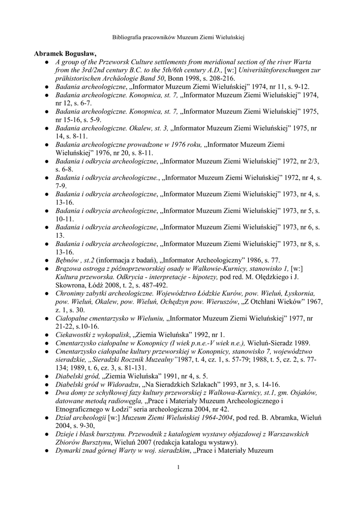 Bibliografia pracowników Muzeum Ziemi Wieluńskiej Abramek Bogusław, A group of the Przeworsk Culture settlements from meridional section of the river Warta from the 3rd/2nd century B.C. to the 5th/6th century A.D., [w:] Univeritätsforeschungen zur prähistorischen Archäologie Band 50, Bonn 1998, s. 208-216. Badania archeologiczne, „Informator Muzeum Ziemi Wieluńskiej” 1974, nr 11, s. 9-12. Badania archeologiczne. Konopnica, st. 7, „Informator Muzeum Ziemi Wieluńskiej” 1974, nr 12, s. 6-7. Badania archeologiczne. Konopnica, st. 7, „Informator Muzeum Ziemi Wieluńskiej” 1975, nr 15-16, s. 5-9. Badania archeologiczne. Okalew, st. 3, „Informator Muzeum Ziemi Wieluńskiej” 1975, nr 14, s. 8-11. Badania archeologiczne prowadzone w 1976 roku, „Informator Muzeum Ziemi Wieluńskiej” 1976, nr 20, s. 8-11. Badania i odkrycia archeologiczne, „Informator Muzeum Ziemi Wieluńskiej” 1972, nr 2/3, s. 6-8. Badania i odkrycia archeologiczne., „Informator Muzeum Ziemi Wieluńskiej” 1972, nr 4, s. 7-9. Badania i odkrycia archeologiczne, „Informator Muzeum Ziemi Wieluńskiej” 1973, nr 4, s. 13-16. Badania i odkrycia archeologiczne, „Informator Muzeum Ziemi Wieluńskiej” 1973, nr 5, s. 10-11. Badania i odkrycia archeologiczne, „Informator Muzeum Ziemi Wieluńskiej” 1973, nr 6, s. 13. Badania i odkrycia archeologiczne, „Informator Muzeum Ziemi Wieluńskiej” 1973, nr 8, s. 13-16. Bębnów , st.2 (informacja z badań), „Informator Archeologiczny” 1986, s. 77. Brązowa ostroga z późnoprzeworskiej osady w Walkowie-Kurnicy, stanowisko 1, [w:] Kultura przeworska. Odkrycia - interpretacje - hipotezy, pod red. M. Olędzkiego i J. Skowrona, Łódź 2008, t. 2, s. 487-492. Chronimy zabytki archeologiczne. Województwo Łódzkie Kurów, pow. Wieluń, Łyskornia, pow. Wieluń, Okalew, pow. Wieluń, Ochędzyn pow. Wieruszów, „Z Otchłani Wieków” 1967, z. 1, s. 30. Ciałopalne cmentarzysko w Wieluniu, „Informator Muzeum Ziemi Wieluńskiej” 1977, nr 21-22, s.10-16. Ciekawostki z wykopalisk, „Ziemia Wieluńska” 1992, nr 1. Cmentarzysko ciałopalne w Konopnicy (I wiek p.n.e.-V wiek n.e.), Wieluń-Sieradz 1989. Cmentarzysko ciałopalne kultury przeworskiej w Konopnicy, stanowisko 7, województwo sieradzkie, „Sieradzki Rocznik Muzealny”1987, t. 4, cz. 1, s. 57-79; 1988, t. 5, cz. 2, s. 77134; 1989, t. 6, cz. 3, s. 81-131. Diabelski gród, „Ziemia Wieluńska” 1991, nr 4, s. 5. Diabelski gród w Widoradzu, „Na Sieradzkich Szlakach” 1993, nr 3, s. 14-16. Dwa domy ze schyłkowej fazy kultury przeworskiej z Walkowa-Kurnicy, st.1, gm. Osjaków, datowane metodą radiowęgla, „Prace i Materiały Muzeum Archeologicznego i Etnograficznego w Łodzi” seria archeologiczna 2004, nr 42. Dział archeologii [w:] Muzeum Ziemi Wieluńskiej 1964-2004, pod red. B. Abramka, Wieluń 2004, s. 9-30, Dzieje i blask bursztynu. Przewodnik z katalogiem wystawy objazdowej z Warszawskich Zbiorów Bursztynu, Wieluń 2007 (redakcja katalogu wystawy). Dymarki znad górnej Warty w woj. sieradzkim, „Prace i Materiały Muzeum 1 Bibliografia pracowników Muzeum Ziemi Wieluńskiej Archeologicznego i Etnograficznego w Łodzi” seria archeologiczna 1987, nr 34, s. 107-115. Fortyfikacje obronne miasta Wielunia, „Na Sieradzkich Szlakach” 1988, nr 3, s. 7-8. Grodzisko średniowieczne w Widoradzu pod Rudą koło Wielunia, st.1. Wstępne podsumowania wyników badań, „Sieradzki Rocznik Muzealny” 1995, t. 10, s. 103-119. Grób wojownika brązownika ze Strobina nad Wartą w woj. sieradzkim (st.4), „Sieradzki Rocznik Muzealny” 1985, t. 1, s. 55-67. Grupa osad kultury przeworskiej znad południkowego odcinka Warty datowanych od III-II w. p.n.e. do V-VI w. n.e., „Sieradzki Rocznik Muzealny” 1994, t. 9, s. 49-68. Hieronim z Wielunia, „Na Sieradzkich Szlakach” 1992, nr 1, s. 20-21. Historyczne kobiety złote myśli, „Ziemia Wieluńska” 1993, nr 8, s. 5. Historia magistra vitae, „Ziemia Wieluńska” 1991, nr 1, s. 4. Importy rzymskie w Polsce środkowej w Muzeum Ziemi Wieluńskiej, „Biuletyn Informacyjny” 1987, nr 166, s. 36. Importy znalezione na obszarze górnej Prosny i Warty, „Informator Muzeum Ziemi Wieluńskiej” 1974, nr 10, s. 9-18. Jeszcze o wizycie w-ce ministra kultury i sztuki, „Ziemia Wieluńska” 1992, s. 4. Jubileusz Muzeum, Miasto Wieluń. Miejski Informator Aktualności. Lato '99, Wieluń 1999, s. 49-52. Kamienna buława z Madeł gm. Pątnów, „Informator Muzeum Ziemi Wieluńskiej” 1977, nr 23-24, s. 118-19. Kamienne buławy z Madeł i Bębnowa w woj. sieradzkim, „Sieradzki Rocznik Muzealny” 1995, t.10, s. 149-152. Kamienne konstrukcje ze Strobina, pow. Wieluń (część II), „Informator Muzeum Ziemi Wieluńskiej” 1974, nr 9, 19–23. Kamienne buławy z Madeł i Bębnowa w woj. sieradzkim, „Sieradzki Rocznik Muzealny” 1995, t.10, s. 149-152. Kącik mody pradziejowej, „Ziemia Wieluńska”, 1991, nr 30, s.5; 1991, nr 34, s. 8. Kim byli Wenedowie, „Na Sieradzkich Szlakach” 2001, nr 2, s. 13-14. Kobiety polskie wg F.S. Kolińskiego, „Ziemia Wieluńska” 1993, nr 9, s. 7. KsiąŜęta i Ŝelazo, „Ziemia Wieluńska” 1991, nr 7, s. 5. Kubek sprzed 3 tys. lat, „Dziennik Łódzki” 1989, nr 52, s. 6. Kultura na obszarze Załęczańskiego Parku Krajobrazowego, Sieradz 1996 (mapa). Kultura przeworska nad górną Wartą, „Prace i Materiały Muzeum Archeologicznego i Etnograficznego w Łodzi” seria archeologiczna 1985, nr 32, s. 87-107. Madonna wieluńska, „Na Sieradzkich Szlakach” 1993, nr 1, s. 11. Magia Ŝelaza, „Na Sieradzkich Szlakach” 1991, nr 2, s. 14-15. Militaria z grodziska średniowiecznego w Widoradzu pod Rudą koło Wielunia, „Acta Historica Polona Studia z dziejów wojskowości, budownictwa, kultury” 2007, t. 17, s.95111. Misy romańskie z wieluńskiego, „Na Sieradzkich Szlakach” 1994, nr 1, s. 15-17. Młodzi wandale z Rudy, „Ziemia Wieluńska” 1991, nr 17, s. 8. M/S Wieluń, „Ziemi