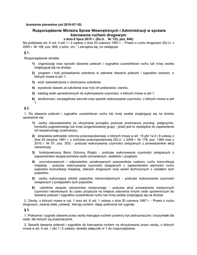 brzmienie pierwotne (od 2010-07-10) Rozporządzenie Ministra Spraw Wewnętrznych i Administracji w sprawie kierowania ruchem drogowym z dnia 6 lipca 2010 r. (Dz.U. Nr 123, poz. 840) Na podstawie art. 6 ust. 4 pkt 1 i 2 ustawy z dnia 20 czerwca 1997 r. - Prawo o ruchu drogowym (Dz.U. z 1 2005 r. Nr 108, poz. 908, z późn. zm. ) zarządza się, co następuje: § 1. Rozporządzenie określa: 1) organizację oraz sposób dawania poleceń i sygnałów uczestnikowi ruchu lub innej osobie znajdującej się na drodze; 2) program i tryb prowadzenia szkolenia w zakresie dawania poleceń i sygnałów osobom, o których mowa w pkt 1; 3) wzór zaświadczenia o ukończeniu szkolenia; 4) wysokość stawek za szkolenia oraz tryb ich pobierania i zwrotu; 5) katalog osób upoważnionych do wykonywania czynności, o których mowa w pkt 1; 6) okoliczności, szczegółowe warunki oraz sposób wykonywania czynności, o których mowa w pkt 1. § 2. 1. Do dawania poleceń i sygnałów uczestnikowi ruchu lub innej osobie znajdującej się na drodze upoważnia się: 1) osoby odpowiedzialne za utrzymanie porządku podczas przemarszu procesji, pielgrzymki, konduktu pogrzebowego lub innej zorganizowanej grupy - jeżeli jest to niezbędne do zapewnienia ich bezpiecznego przemarszu; 2) strażaków jednostek ochrony przeciwpożarowej, o których mowa w art. 15 pkt 1a-5 i 8 ustawy z dnia 24 sierpnia 1991 r. o ochronie przeciwpożarowej (Dz.U. z 2009 r. Nr 178, poz. 1380 oraz z 2010 r. Nr 57, poz. 353) - podczas wykonywania czynności związanych z prowadzeniem akcji ratowniczej; 3) funkcjonariuszy Biura Ochrony Rządu - podczas wykonywania czynności związanych z zapewnieniem bezpieczeństwa osób ochranianych, obiektów i urządzeń; 4) umundurowanych i odpowiednio oznakowanych pracowników nadzoru ruchu komunikacji miejskiej - podczas wykonywania czynności związanych z zapewnieniem płynności ruchu pojazdów komunikacji miejskiej, zdarzeń drogowych oraz awarii technicznych z udziałem tych pojazdów; 5) osoby wykonujące pilotaż pojazdów nienormatywnych - podczas wykonywania czynności związanych z przejazdem tych pojazdów; 6) członków zespołu ratownictwa medycznego - podczas akcji prowadzenia medycznych czynności ratunkowych do czasu przybycia na miejsce zdarzenia innych osób uprawnionych do dawania poleceń i sygnałów uczestnikowi ruchu lub innej osobie znajdującej się na drodze. 2. Osoby, o których mowa w ust. 1 oraz art. 6 ust. 1 ustawy z dnia 20 czerwca 1997 r. - Prawo o ruchu drogowym, zwanej dalej „ustawą”, kierują ruchem, dając polecenia lub sygnały. § 3. 1. Polecenia i sygnały dawane przez osoby kierujące ruchem powinny być jednoznaczne i zrozumiałe dla osób, dla których są przeznaczone. 2. Sposób dawania poleceń i sygnałów do kierowania ruchem na skrzyżowaniu przez osoby, o których mowa w art. 6 ust. 1 pkt 1 i 2 ustawy, określa załącznik nr 1 do rozporządzenia. § 4. 1. Polecenia i sygnały, o których mowa w § 3, uprawniona osoba daje za pomocą postawy i ruchu rąk, tarczy do zatrzymywania pojazdów, a w warunkach niedostatecznej widoczności - latarki wyposażonej w światło czerwone lub światło czerwone i zielone albo tarczy do zatrzymywania pojazdów ze światłem odblaskowym lub światłem czerwonym. 2. Przepis ust. 1 nie dotyczy: 1) osób, o których mowa w art. 6 ust. 1 pkt 1, 2 i 4 ustawy, kierujących ruchem na skrzyżowaniu i w obrębie przejazdu kolejowego; osoby te, kierując ruchem na skrzyżowaniu w warunkach niedostatecznej widoczności, mogą używać latarki wyposażonej w światło czerwone lub światło czerwone i zielone albo tarczy do zatrzymywania pojazdów ze światłem odblaskowym lub światłem czerwonym; 2) osoby nadzorującej bezpieczne przejście dzieci przez jezdnię w wyznaczonym miejscu. § 5. Pracownik kolejowy na przejeździe kolejowym, dla zwrócenia uwagi na dawane za pomocą tarczy do zatrzymywania pojazdów lub latarki ze światłem czerwonym polecenia i sygnały, może dodatkowo używać trąbki sygnalizacyjnej lub gwizdka. § 6. 1. Osoba nadzorująca bezpieczne przejście dzieci przez jezdnię w wyznaczonym miejscu powinna być podczas dawania poleceń i sygnałów wyposażona w kwadratową tarczę barwy żółtej fluorescencyjnej z umieszczonym w polu ośmiokątnym znakiem barwy czerwonej z napisem „STOP”. 2. Polecenia i sygnały dla kierujących pojazdami osoba nadzorująca bezpieczne przejście dzieci przez jezdnię daje za pomocą tarczy, o której mowa w ust. 1. 3. Osoba, o której mowa w ust. 1, przed podaniem sygnału do wstrzymania ruchu pojazdów jest obowiązana: 1) wejść na przejście dla pieszych z uniesioną tarczą, w sposób niezmuszający kierujących do gwałtownego hamowania; płaszczyzna tarczy powinna być skierowana w stronę jadących pojazdów; 2) zezwolić pieszym na przejście przez jezdnię dopiero po upewnieniu się, że pojazdy się zatrzymały; 3) zejść z przejścia dopiero po opuszczeniu jezdni przez pieszych; oznacza to zezwolenie na kontynuowanie jazdy pojazdów. 4. Szczegółową specyfikację techniczną tarczy znaku, o której mowa w ust. 1, określa załącznik nr 2 do rozporządzenia. § 7. 1. Osoby, o których mowa w art. 6 ust. 1 pkt 1-3c ustawy oraz § 2 ust. 1 pkt 3, powinny być podczas dawania poleceń i sygnałów w zakresie kierowania ruchem na drodze wyposażone w kamizelki barwy żółtej z elementami odblaskowymi oraz wyróżnikiem określającym formację, do której przynależą. 2. Osoby, o których mowa w § 2 ust. 1 pkt 1, 2, 4 i 5 oraz art. 6 ust. 1 pkt 7 i 8 ustawy, powinny być podczas dawania poleceń i sygnałów w zakresie kierowania ruchem na drodze wyposażone w kamizelki barwy pomarańczowej z elementami odblaskowymi oraz wyróżnikiem określającym odpowiednio przedsiębiorcę, którego są pracownikami, lub rodzaj wykonywanych czynności na drodze albo służbę, do której przynależą. 3. Przepis ust. 2 nie ma zastosowania do osoby, o której mow
