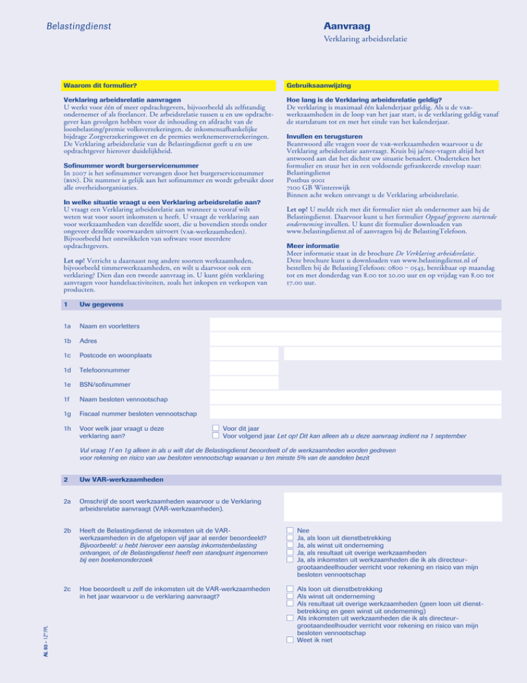 Aanvraag 12345 Verklaring arbeidsrelatie Waarom dit formulier? Gebruiksaanwijzing Verklaring arbeidsrelatie aanvragen Hoe lang is de Verklaring arbeidsrelatie geldig? U werkt voor één of meer opdrachtgevers, bijvoorbeeld als zelfstandig ondernemer of als freelancer. De arbeidsrelatie tussen u en uw opdrachtgever kan gevolgen hebben voor de inhouding en afdracht van de loonbelasting/premie volksverzekeringen, de inkomensafhankelijke bijdrage Zorgverzekeringswet en de premies werknemersverzekeringen. De Verklaring arbeidsrelatie van de Belastingdienst geeft u en uw opdrachtgever hierover duidelijkheid. De verklaring is maximaal één kalenderjaar geldig. Als u de werkzaamheden in de loop van het jaar start, is de verklaring geldig vanaf de startdatum tot en met het einde van het kalenderjaar. Sofinummer wordt burgerservicenummer In is het sofinummer vervangen door het burgerservicenummer (). Dit nummer is gelijk aan het sofinummer en wordt gebruikt door alle overheidsorganisaties. Invullen en terugsturen Beantwoord alle vragen voor de -werkzaamheden waarvoor u de Verklaring arbeidsrelatie aanvraagt. Kruis bij ja/nee-vragen altijd het antwoord aan dat het dichtst uw situatie benadert. Onderteken het formulier en stuur het in een voldoende gefrankeerde envelop naar: Belastingdienst Postbus GB Winterswijk Binnen acht weken ontvangt u de Verklaring arbeidsrelatie. In welke situatie vraagt u een Verklaring arbeidsrelatie aan? U vraagt een Verklaring arbeidsrelatie aan wanneer u vooraf wilt weten wat voor soort inkomsten u heeft. U vraagt de verklaring aan voor werkzaamheden van dezelfde soort, die u bovendien steeds onder ongeveer dezelfde voorwaarden uitvoert (-werkzaamheden). Bijvoorbeeld het ontwikkelen van software voor meerdere opdrachtgevers. Let op! Verricht u daarnaast nog andere soorten werkzaamheden, bijvoorbeeld timmerwerkzaamheden, en wilt u daarvoor ook een verklaring? Dien dan een tweede aanvraag in. U kunt géén verklaring aanvragen voor handelsactiviteiten, zoals het inkopen en verkopen van producten. 1 Uw gegevens 1a Naam en voorletters 1b Adres 1c Postcode en woonplaats 1d Telefoonnummer 1e BSN/sofinummer 1f Naam besloten vennootschap 1g Fiscaal nummer besloten vennootschap 1h Voor welk jaar vraagt u deze verklaring aan? ■ ■ Let op! U meldt zich met dit formulier niet als ondernemer aan bij de Belastingdienst. Daarvoor kunt u het formulier Opgaaf gegevens startende onderneming invullen. U kunt dit formulier downloaden van www.belastingdienst.nl of aanvragen bij de BelastingTelefoon. Meer informatie Meer informatie staat in de brochure De Verklaring arbeidsrelatie. Deze brochure kunt u downloaden van www.belastingdienst.nl of bestellen bij de BelastingTelefoon: ‒ , bereikbaar op maandag tot en met donderdag van . tot . uur en op vrijdag van . tot . uur. Voor dit jaar Voor volgend jaar Let op! Dit kan alleen als u deze aanvraag indient na 1 september Vul vraag 1f en 1g alleen in als u wilt dat de Belastingdienst beoordeelt of de werkzaamheden worden gedreven voor rekening en risico van uw besloten vennootschap waarvan u ten minste 5% van de aandelen bezit 2 Uw VAR-werkzaamheden 2a Omschrijf de soort werkzaamheden waarvoor u de Verklaring arbeidsrelatie aanvraagt (VAR-werkzaamheden). 2b Heeft de Belastingdienst de inkomsten uit de VARwerkzaamheden in de afgelopen vijf jaar al eerder beoordeeld? Bijvoorbeeld: u hebt hierover een aanslag inkomstenbelasting ontvangen, of de Belastingdienst heeft een standpunt ingenomen bij een boekenonderzoek ■ ■ ■ ■ ■ Nee Ja, als loon uit dienstbetrekking Ja, als winst uit onderneming Ja, als resultaat uit overige werkzaamheden Ja, als inkomsten uit werkzaamheden die ik als directeurgrootaandeelhouder verricht voor rekening en risico van mijn besloten vennootschap 2c Hoe beoordeelt u zelf de inkomsten uit de VAR-werkzaamheden in het jaar waarvoor u de verklaring aanvraagt? ■ ■ ■ Als loon uit dienstbetrekking Als winst uit onderneming Als resultaat uit overige werkzaamheden (geen loon uit dienstbetrekking en geen winst uit onderneming) Als inkomsten uit werkzaamheden die ik als directeurgrootaandeelhouder verricht voor rekening en risico van mijn besloten vennootschap Weet ik niet AL 93 - 1Z*7PL ■ ■ Vermeld uw BSN/sofinummer 2 Uw VAR-werkzaamheden (vervolg) 2d Hoeveel uur verwacht u aan de VAR-werkzaamheden te besteden in het jaar waarvoor u de verklaring aanvraagt? ■ ■ ■ Minder dan 200 uur 200 tot 700 uur 700 uur of meer 2e Hoeveel opdrachtgevers verwacht u voor de VAR-werkzaamheden in het jaar waarvoor u de verklaring aanvraagt? ■ ■ ■ Minder dan drie opdrachtgevers Drie tot zeven opdrachtgevers Zeven of meer opdrachtgevers 2f Hoeveel opdrachtgevers had u vorig jaar voor de VARwerkzaamheden ■ ■ ■ ■ Minder dan drie opdrachtgevers Drie tot zeven opdrachtgevers Zeven of meer opdrachtgevers Niet van toepassing, ik start dit jaar met de VAR-werkzaamheden 2g Kunt u de VAR-werkzaamheden meestal zonder toestemming van een opdrachtgever door iemand anders laten uitvoeren? Wanneer bent u met de VAR-werkzaamheden begonnen? ■ Ja ■ ■ Dit jaar Vermeld de startdatum Vorig jaar of eerder Is het risico voor u als een opdrachtgever niet tevreden is over het resultaat van uw werk? Verwacht u de VAR-werkzaamheden te verrichten voor opdrachtgevers bij wie u voorheen soortgelijke werkzaamheden in loondienst heeft verricht? Verwacht u de VAR-werkzaamheden meestal te verrichten voor opdrachtgevers waar dezelfde werkzaamheden ook in loondienst worden verricht? ■ Ja ■ Nee ■ Ja ■ Nee ■ Ja ■ Nee 2l Verwacht u de VAR-werkzaamheden te verrichten via detachering, uitzending of bemiddeling? ■ ■ ■ Nee of voor minder dan 50% Ja, voor 50% of meer via bemiddeling Ja, voor 50% of meer via uitzending en/of detachering 3 Uw inkomsten 3a Wat zijn uw geschatte jaarinkomsten voor de VARwerkzaamheden in het jaar waarvoor u de verklaring aanvraagt? ■ ■ ■ Minder dan E 10.000 E 10.000 tot E 25.000 E 25.000 of meer 3