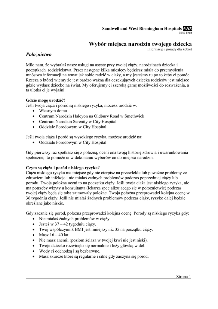 Sandwell and West Birmingham Hospitals NHS NHS Trust Wybór miejsca narodzin twojego dziecka Informacje i porady dla kobiet Położnictwo Miło nam, że wybrałaś nasze usługi na asystę przy twojej ciąży, narodzinach dziecka i początkach rodzicielstwa. Przez następne kilka miesięcy będziesz miała do przemyślenia mnóstwo informacji na temat jak sobie radzić w ciąży, a my jesteśmy tu po to żeby ci pomóc. Rzeczą o której wiemy że jest bardzo ważna dla oczekujących dziecka rodziców jest miejsce gdzie wydasz dziecko na świat. My oferujemy ci szeroką gamę możliwości do rozważenia, a ta ulotka ci je wyjaśni. Gdzie mogę urodzić? Jeśli twoja ciąża i poród są niskiego ryzyka, możesz urodzić w: Własnym domu Centrum Narodzin Halcyon na Oldbury Road w Smethwick Centrum Narodzin Serenity w City Hospital Oddziale Porodowym w City Hospital Jeśli twoja ciąża i poród są wysokiego ryzyka, możesz urodzić na: Oddziale Porodowym w City Hospital Gdy pierwszy raz spotkasz się z położną, oceni ona twoją historię zdrowia i uwarunkowania społeczne; to pomoże ci w dokonaniu wyborów co do miejsca narodzin. Czym są ciąża i poród niskiego ryzyka? Ciąża niskiego ryzyka ma miejsce gdy nie cierpisz na przewlekłe lub poważne problemy ze zdrowiem lub infekcje i nie miałaś żadnych problemów podczas poprzedniej ciąży lub porodu. Twoja położna oceni to na początku ciąży. Jeśli twoja ciąża jest niskiego ryzyka, nie ma potrzeby wizyty u konsultanta (lekarza specjalizującego się w położnictwie) podczas twojej ciąży będą się tobą zajmowały położne. Twoja położna przeprowadzi kolejna ocenę w 36 tygodniu ciąży. Jeśli nie miałaś żadnych problemów podczas ciąży, ryzyko dalej będzie określane jako niskie. Gdy zacznie się poród, położna przeprowadzi kolejna ocenę. Porody są niskiego ryzyka gdy: Nie miałaś żadnych problemów w ciąży. Jesteś w 37 – 42 tygodniu ciąży. Twój współczynnik BMI jest mniejszy niż 35 na początku ciąży. Masz 16 – 40 lat. Nie masz anemii (poziom żelaza w twojej krwi nie jest niski). Twoje dziecko rozwinęło się normalnie i leży główką w dół. Wody ci odchodzą i są bezbarwne. Masz skurcze które są regularne i silne gdy zaczyna się poród. Strona 1 Sandwell and West Birmingham Hospitals NHS NHS Trust Wybór miejsca narodzin twojego dziecka Informacje i porady dla kobiet Położnictwo Czym są ciąża i poród wysokiego ryzyka? Ciąże i porody przedstawiają wysokie ryzyko gdy w ciąży lub podczas porodu występuje problem który wymaga leczenia. Jeśli twoja położna uważa że ponosisz wysokie ryzyko przedyskutuje to z tobą i może poprosić cię o odwiedzenie konsultanta w celu zasięgnięcia opinii. Konsultant może wtedy zdecydować, ze ryzyko jest niskie i opiekę nad tobą może w dalszym ciągu sprawować położna, lub może zdecydować ze ryzyko jest wysokie i potrzebujesz być pod specjalistyczna opieka konsultanta. Poród w domu Są dowody na to że dla zdrowej kobiety bez komplikacji w ciąży poród w domu jest równie bezpieczny jak w szpitalu; oraz że są mniejsze szanse nacięcia krocza i cesarskiego cięcia. Dla większości kobiet i ich partnerów główną wątpliwością co do porodu w domu jest to że może dojść do sytuacji wymagającej doraźnej pomocy medycznej. Możesz przedyskutować ze swoimi położnymi jakie środki mają zastosowanie gdy pojawia się problem. Położna jest przeszkolona i wyposażona żeby zająć się większością problemów; dla przykładu, będzie miała leki żeby zatrzymać silne krwawienie po porodzie i może resuscytować dziecko które wolno oddycha. Najpowszechniejszym problemem jest długi poród, gdy matka lub dziecko męczą się i postęp spowalnia. Przewiezienie do szpitala może być konieczne. Ale kobiety które zaczęły rodzić w domu i potrzebowały przewiezienia mówią że dużą wartość miało spędzenie nawet części porodu w domu. Z pierwszym dzieckiem matka ma 70% szans powodzenia urodzenia w domu (jednakże waha się to znacznie w zależności od obszaru). U kobiet które już miały dziecko, szanse są dużo większe – miedzy 88 a 99% kobiet. Jest mała szansa (około 1 na 30) ze może zajść potrzeba przetransportowania do szpitala po urodzeniu dziecka, zazwyczaj z powodu problemów z wydaleniem łożyska, lub czasem z powodu obaw o oddychanie dziecka. Gdy decydujesz się rodzić w domu, położna odwiedzi cię w domu gdy będziesz w 36 tygodniu ciąży żeby upewnić się że jesteś dobrze przygotowana i masz wszelkie informacje których potrzebujesz. Da ci numery kontaktowe do położnej i wyjaśni czego możesz oczekiwać podczas porodu. Wyjaśni również czego możesz używać w celu uśmierzenia bólu i jak to otrzymać. Gdy będzie ci się wydawać, że poród się zaczyna, zadzwonisz do położnej a ona oceni i potwierdzi który to etap porodu. Twoja położna zostanie z tobą, gdy będzie pewna że jesteś w aktywnej fazie porodu, monitorując ciebie i dziecko. Wezwie jeszcze jedna osobę do asysty przy porodzie i obie zostaną z tobą aż i ty i ona uznacie że wszystko jest tak jak być powinno. Po urodzeniu będziesz miała kolejne wizyty położnej i doradzi ci ona w jakim ty i dziecko jesteście stanie. Inni ludzie mogą zapewniać usługi jak badanie słuchu, porada na temat karmienia piersią i ogólna opieka poporodowa. Strona 2 Sandwell and West Birmingham Hospitals NHS NHS Trust Wybór miejsca narodzin twojego dziecka Informacje i porady dla kobiet Położnictwo Jeśli wystąpi problem z tobą lub twoim dzieckiem w trakcie porodu lub po urodzeniu, położna wezwie karetkę i pojedzie z tobą do City Hospital. Jakie są korzyści z rodzenia w domu? Będziesz miała poczucie większej kontroli nad porodem i doświadczenie narodzin będzie bardziej pozytywne. Prędzej będą z powodzeniem karmiły piersią kobiety, które miały pozytywne doświadczenia podczas porodu. 
