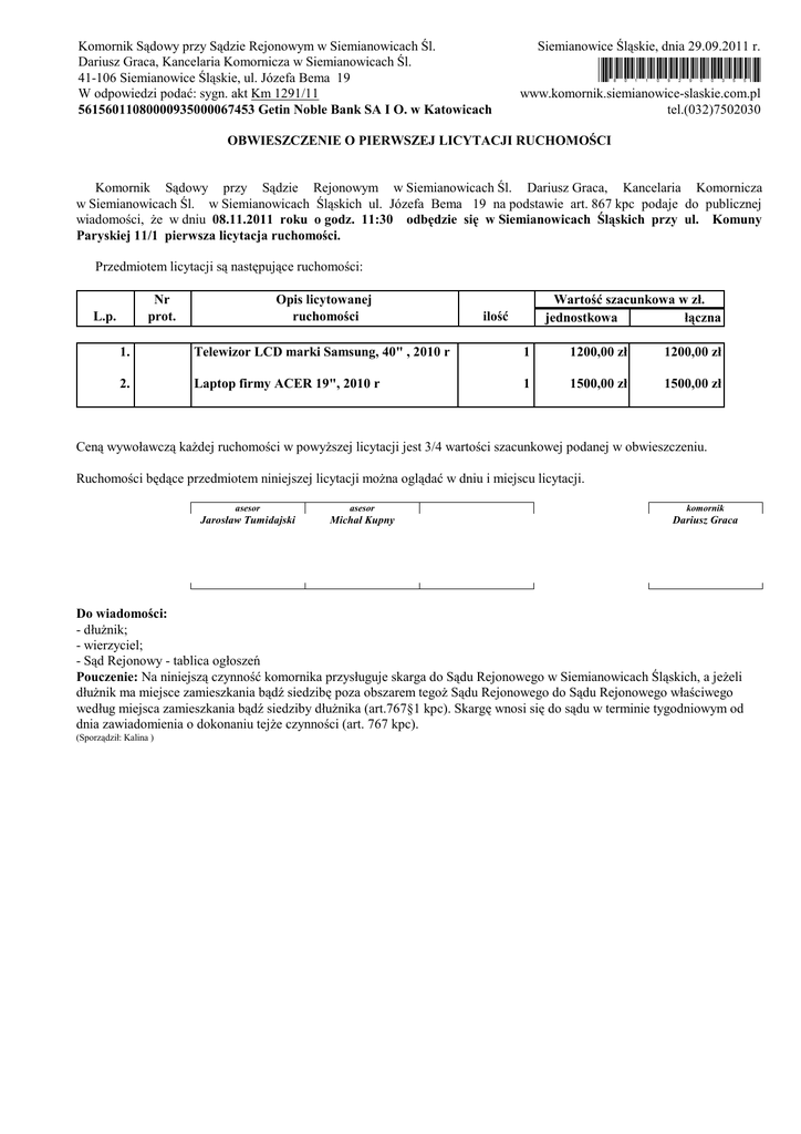 Komornik Sądowy przy Sądzie Rejonowym w Siemianowicach Śl. Dariusz Graca, Kancelaria Komornicza w Siemianowicach Śl. 41-106 Siemianowice Śląskie, ul. Józefa Bema 19 W odpowiedzi podać: sygn. akt Km 1291/11 56156011080000935000067453 Getin Noble Bank SA I O. w Katowicach Siemianowice Śląskie, dnia 29.09.2011 r. *8011092900355* www.komornik.siemianowice-slaskie.com.pl tel.(032)7502030 OBWIESZCZENIE O PIERWSZEJ LICYTACJI RUCHOMOŚCI Komornik Sądowy przy Sądzie Rejonowym w Siemianowicach Śl. Dariusz Graca, Kancelaria Komornicza w Siemianowicach Śl. w Siemianowicach Śląskich ul. Józefa Bema 19 na podstawie art. 867 kpc podaje do publicznej wiadomości, że w dniu 08.11.2011 roku o godz. 11:30 odbędzie się w Siemianowicach Śląskich przy ul. Komuny Paryskiej 11/1 pierwsza licytacja ruchomości. Przedmiotem licytacji są następujące ruchomości: Nr prot. L.p. Opis licytowanej ruchomości Wartość szacunkowa w zł. jednostkowa łączna ilość 1. Telewizor LCD marki Samsung, 40" , 2010 r 1 1200,00 zł 1200,00 zł 2. Laptop firmy ACER 19", 2010 r 1 1500,00 zł 1500,00 zł Ceną wywoławczą każdej ruchomości w powyższej licytacji jest 3/4 wartości szacunkowej podanej w obwieszczeniu. Ruchomości będące przedmiotem niniejszej licytacji można oglądać w dniu i miejscu licytacji. asesor asesor komornik Jarosław Tumidajski Michał Kupny Dariusz Graca Do wiadomości: - dłużnik; - wierzyciel; - Sąd Rejonowy - tablica ogłoszeń Pouczenie: Na niniejszą czynność komornika przysługuje skarga do Sądu Rejonowego w Siemianowicach Śląskich, a jeżeli dłużnik ma miejsce zamieszkania bądź siedzibę poza obszarem tegoż Sądu Rejonowego do Sądu Rejonowego właściwego według miejsca zamieszkania bądź siedziby dłużnika (art.767§1 kpc). Skargę wnosi się do sądu w terminie tygodniowym od dnia zawiadomienia o dokonaniu tejże czynności (art. 767 kpc). (Sporządził: Kalina )