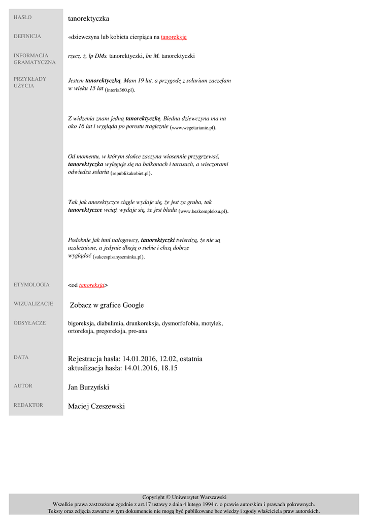 HASŁO tanorektyczka DEFINICJA «dziewczyna lub kobieta cierpiąca na tanoreksję» INFORMACJA GRAMATYCZNA rzecz. ż, lp DMs. tanorektyczki, lm M. tanorektyczki PRZYKŁADY UŻYCIA Jestem tanorektyczką. Mam 19 lat, a przygodę z solarium zaczęłam w wieku 15 lat (interia360.pl). Z widzenia znam jedną tanorektyczkę. Biedna dziewczyna ma na oko 16 lat i wygląda po porostu tragicznie (www.wegetarianie.pl). Od momentu, w którym słońce zaczyna wiosennie przygrzewać, tanorektyczka wyleguje się na balkonach i tarasach, a wieczorami odwiedza solaria (republikakobiet.pl). Tak jak anorektyczce ciągle wydaje się, że jest za gruba, tak tanorektyczce wciąż wydaje się, że jest blada (www.bezkompleksu.pl). Podobnie jak inni nałogowcy, tanorektyczki twierdzą, że nie są uzależnione, a jedynie dbają o siebie i chcą dobrze wyglądać (sukcespisanyszminka.pl). ETYMOLOGIA WIZUALIZACJE <od tanoreksja> Zobacz w grafice Google ODSYŁACZE bigoreksja, diabulimia, drunkoreksja, dysmorfofobia, motylek, ortoreksja, pregoreksja, pro-ana DATA Rejestracja hasła: 14.01.2016, 12.02, ostatnia aktualizacja hasła: 14.01.2016, 18.15 AUTOR Jan Burzyński REDAKTOR Maciej Czeszewski Copyright © Uniwersytet Warszawski Wszelkie prawa zastrzeżone zgodnie z art.17 ustawy z dnia 4 lutego 1994 r. o prawie autorskim i prawach pokrewnych. Teksty oraz zdjęcia zawarte w tym dokumencie nie mogą być publikowane bez wiedzy i zgody właściciela praw autorskich. Powered by TCPDF (www.tcpdf.org)