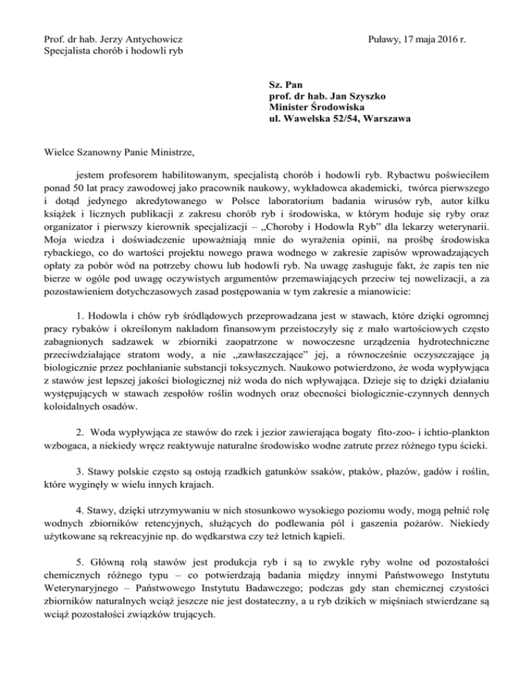 Prof. dr hab. Jerzy Antychowicz Specjalista chorób i hodowli ryb Puławy, 17 maja 2016 r. Sz. Pan prof. dr hab. Jan Szyszko Minister Środowiska ul. Wawelska 52/54, Warszawa Wielce Szanowny Panie Ministrze, jestem profesorem habilitowanym, specjalistą chorób i hodowli ryb. Rybactwu poświeciłem ponad 50 lat pracy zawodowej jako pracownik naukowy, wykładowca akademicki, twórca pierwszego i dotąd jedynego akredytowanego w Polsce laboratorium badania wirusów ryb, autor kilku książek i licznych publikacji z zakresu chorób ryb i środowiska, w którym hoduje się ryby oraz organizator i pierwszy kierownik specjalizacji – „Choroby i Hodowla Ryb” dla lekarzy weterynarii. Moja wiedza i doświadczenie upoważniają mnie do wyrażenia opinii, na prośbę środowiska rybackiego, co do wartości projektu nowego prawa wodnego w zakresie zapisów wprowadzających opłaty za pobór wód na potrzeby chowu lub hodowli ryb. Na uwagę zasługuje fakt, że zapis ten nie bierze w ogóle pod uwagę oczywistych argumentów przemawiających przeciw tej nowelizacji, a za pozostawieniem dotychczasowych zasad postępowania w tym zakresie a mianowicie: 1. Hodowla i chów ryb śródlądowych przeprowadzana jest w stawach, które dzięki ogromnej pracy rybaków i określonym nakładom finansowym przeistoczyły się z mało wartościowych często zabagnionych sadzawek w zbiorniki zaopatrzone w nowoczesne urządzenia hydrotechniczne przeciwdziałające stratom wody, a nie „zawłaszczające” jej, a równocześnie oczyszczające ją biologicznie przez pochłanianie substancji toksycznych. Naukowo potwierdzono, że woda wypływjąca z stawów jest lepszej jakości biologicznej niż woda do nich wpływająca. Dzieje się to dzięki działaniu występujących w stawach zespołów roślin wodnych oraz obecności biologicznie-czynnych dennych koloidalnych osadów. 2. Woda wypływjąca ze stawów do rzek i jezior zawierająca bogaty fito-zoo- i ichtio-plankton wzbogaca, a niekiedy wręcz reaktywuje naturalne środowisko wodne zatrute przez różnego typu ścieki. 3. Stawy polskie często są ostoją rzadkich gatunków ssaków, ptaków, płazów, gadów i roślin, które wyginęły w wielu innych krajach. 4. Stawy, dzięki utrzymywaniu w nich stosunkowo wysokiego poziomu wody, mogą pełnić rolę wodnych zbiorników retencyjnych, służących do podlewania pól i gaszenia pożarów. Niekiedy użytkowane są rekreacyjnie np. do wędkarstwa czy też letnich kąpieli. 5. Główną rolą stawów jest produkcja ryb i są to zwykle ryby wolne od pozostałości chemicznych różnego typu – co potwierdzają badania między innymi Państwowego Instytutu Weterynaryjnego – Państwowego Instytutu Badawczego; podczas gdy stan chemicznej czystości zbiorników naturalnych wciąż jeszcze nie jest dostateczny, a u ryb dzikich w mięśniach stwierdzane są wciąż pozostałości związków trujących. 6. Niektóre wyspecjalizowane stawy odgrywają bardzo istotną rolę w podchowie materiału zarybieniowego dla zbiorników naturalnych – jezior i rzek. Działanie to jest niezbędne dla ratowania zanikających w naszych wodach naturalnych, niektórych gatunków dzikich ryb. 7. Każdego roku znaczna część dochodów Gospodarstw Rybackich przeznaczana jest na remonty stawów, dzięki którym utrzymywana jest ich właściwa kultura rybacka i dobry smak mięsa pochodzących z nich ryb. Oprócz tego finanse Gospodarstw Rybackich przeznacza się na pozyskiwanie materiału obsadowego i leczenie ryb – część zysków pochłaniają każdego roku śnięcia ryb wywoływane zatruciami i chorobami inwazyjnymi i zakaźnymi, kłusownicy i zwierzęta drapieżne. 8. Gospodarstwa Rybackie dają zatrudnienie mieszkańcom wielu zakątków Polskich położonych z dala od centrów przemysłowych. Wprowadzenie jakichkolwiek opłat obciążających Gospodarstwa Rybackie będzie miało następujące skutki: Niektóre gospodarstwa zaprzestaną produkcji ryb lub ją ograniczą redukując załogę „przestawiając się” na produkcję rolniczą lub ogrodniczą - chociaż większość obiektów rybackich położona jest na mało urodzajnych glebach. Pozostałe przestawią się na ekstensywną produkcję niewielkiej ilości mało wartościowych, niedożywionych ryb hodowanych w zamulonych niedoinwestowanych stawach. Kultura hodowlana stawów obniży się, a część z nich zarośnie trzciną i roślinnością bagienną, a w końcu drzewami i krzewami wodno-lądowymi. W następstwie tego nastąpi lokalnie redukcja ilości i liczebności dotychczas żyjących wokół stawów lub w stawach gatunków ssaków, gadów, płazów, ryb, zoo- i fito- planktonu; innymi słowy dojdzie do jałowienia terenów rybackich a kilkusetletnia praca hodowlana i naukowa dotycząca racjonalnej hodowli ryb zostanie zaprzepaszczona. Konkurencyjność ryb polskich obniży się do zera a równocześnie wzrośnie import ryb śródlądowych do Polski z krajów sąsiednich oraz odległych krajów azjatyckich. Zdrowotność ryb i związana z prymitywnymi warunkami ich hodowli pogorszy się w takim stopniu, że eksport ich, przynajmniej do krajów zachodnich, może obniżyć się do zera. WNIOSKI. Przedstawione tu korzyści uzyskiwane ze stawów dzięki temu, że występujące od wieków w Polsce warunki przyrodnicze są prawidłowo użytkowane dla celów rybackich oraz zgodnie z zasadami natury (co rzadko ludziom się udaje) sugerują, że Gospodarstwa Rybackie powinny raczej otrzymywać dotacje, które pomogą im rozwinąć się i konkurować z produkcją rybacką innych krajów i nie być obciążane nierealnymi podatkami za użytkowanie wody! Zdrowa, prawidłowo doinwestowana hodowla polskich ryb powinna zredukować import do naszego kraju mało wartościowych ryby hodowanych w różnych krajach azjatyckich metodą superintensywną (w małych zbiornikach bez zachowania podstawowych zasad higieny i leczonych intensywnie szkodliwymi dla człowieka substancjami chemicznym