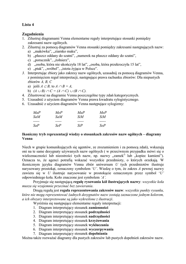 1. Zilustruj diagramami Venna elementarne reguły interpretujące stosunki pomiędzy