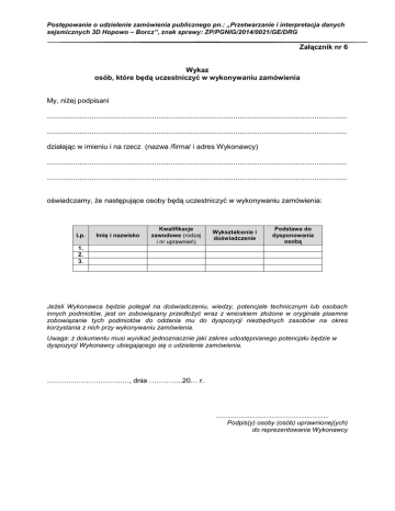 Postępowanie o udzielenie zamówienia publicznego pn.: „Przetwarzanie i interpretacja danych sejsmicznych 3D Hopowo – Borcz”, znak sprawy: ZP/PGNIG/2014/0021/GE/DRG Załącznik nr 6 Wykaz osób, które będą uczestniczyć w wykonywaniu zamówienia My, niżej podpisani .................................................................................................................................................... .................................................................................................................................................... działając w imieniu i na rzecz (nazwa /firma/ i adres Wykonawcy) .................................................................................................................................................... .................................................................................................................................................... oświadczamy, że następujące osoby będą uczestniczyć w wykonywaniu zamówienia: Lp. Imię i nazwisko Kwalifikacje zawodowe (rodzaj i nr uprawnień) Wykształcenie i doświadczenie Podstawa do dysponowania osobą 1. 2. 3. Jeżeli Wykonawca będzie polegał na doświadczeniu, wiedzy, potencjale technicznym lub osobach innych podmiotów, jest on zobowiązany przedłożyć wraz z wnioskiem złożone w oryginale pisemne zobowiązanie tych podmiotów do oddania mu do dyspozycji niezbędnych zasobów na okres korzystania z nich przy wykonywaniu zamówienia. Uwaga: z dokumentu musi wynikać jednoznacznie jaki zakres udostępnianego potencjału będzie w dyspozycji Wykonawcy ubiegającego się o udzielenie zamówienia. ……………………………., dnia …………..20… r. ............................................................. Podpis(y) osoby (osób) uprawnionej(ych) do reprezentowania Wykonawcy