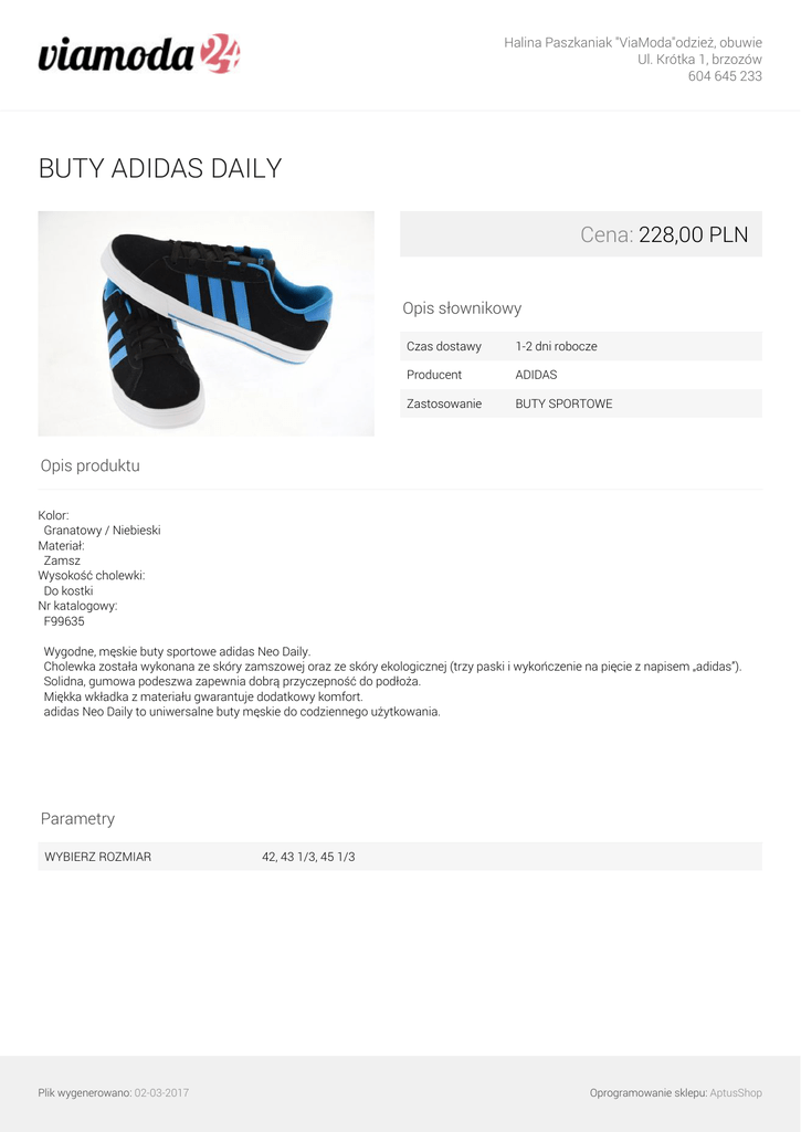 Halina Paszkaniak "ViaModa"odzież, obuwie Ul. Krótka 1, brzozów 604 645 233 BUTY ADIDAS DAILY Cena: 228,00 PLN Opis słownikowy Czas dostawy 1-2 dni robocze Producent ADIDAS Zastosowanie BUTY SPORTOWE Opis produktu Kolor: Granatowy / Niebieski Materiał: Zamsz Wysokość cholewki: Do kostki Nr katalogowy: F99635 Wygodne, męskie buty sportowe adidas Neo Daily. Cholewka została wykonana ze skóry zamszowej oraz ze skóry ekologicznej (trzy paski i wykończenie na pięcie z napisem „adidas”). Solidna, gumowa podeszwa zapewnia dobrą przyczepność do podłoża. Miękka wkładka z materiału gwarantuje dodatkowy komfort. adidas Neo Daily to uniwersalne buty męskie do codziennego użytkowania. Parametry WYBIERZ ROZMIAR Plik wygenerowano: 02-03-2017 42, 43 1/3, 45 1/3 Oprogramowanie sklepu: AptusShop Halina Paszkaniak "ViaModa"odzież, obuwie Ul. Krótka 1, brzozów 604 645 233 Galeria Plik wygenerowano: 02-03-2017 Powered by TCPDF (www.tcpdf.org) Oprogramowanie sklepu: AptusShop