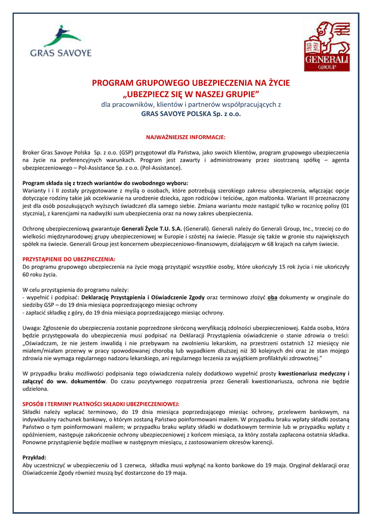 PROGRAM GRUPOWEGO UBEZPIECZENIA NA ŻYCIE „UBEZPIECZ SIĘ W NASZEJ GRUPIE” dla pracowników, klientów i partnerów współpracujących z GRAS SAVOYE POLSKA Sp. z o.o. NAJWAŻNIEJSZE INFORMACJE: Broker Gras Savoye Polska Sp. z o.o. (GSP) przygotował dla Państwa, jako swoich klientów, program grupowego ubezpieczenia na życie na preferencyjnych warunkach. Program jest zawarty i administrowany przez siostrzaną spółkę – agenta ubezpieczeniowego – Pol-Assistance Sp. z o.o. (Pol-Assistance). Program składa się z trzech wariantów do swobodnego wyboru: Warianty I i II zostały przygotowane z myślą o osobach, które potrzebują szerokiego zakresu ubezpieczenia, włączając opcje dotyczące rodziny takie jak oczekiwanie na urodzenie dziecka, zgon rodziców i teściów, zgon małżonka. Wariant III przeznaczony jest dla osób poszukujących wyższych świadczeń dla samego siebie. Zmiana wariantu może nastąpić tylko w rocznicę polisy (01 stycznia), z karencjami na nadwyżki sum ubezpieczenia oraz na nowy zakres ubezpieczenia. Ochronę ubezpieczeniową gwarantuje Generali Życie T.U. S.A. (Generali). Generali należy do Generali Group, Inc., trzeciej co do wielkości międzynarodowej grupy ubezpieczeniowej w Europie i szóstej na świecie. Plasuje się także w gronie stu największych spółek na świecie. Generali Group jest koncernem ubezpieczeniowo-finansowym, działającym w 68 krajach na całym świecie. PRZYSTĄPIENIE DO UBEZPIECZENIA: Do programu grupowego ubezpieczenia na życie mogą przystąpić wszystkie osoby, które ukończyły 15 rok życia i nie ukończyły 60 roku życia. W celu przystąpienia do programu należy: - wypełnić i podpisać: Deklarację Przystąpienia i Oświadczenie Zgody oraz terminowo złożyć oba dokumenty w oryginale do siedziby GSP – do 19 dnia miesiąca poprzedzającego miesiąc ochrony - zapłacić składkę z góry, do 19 dnia miesiąca poprzedzającego miesiąc ochrony. Uwaga: Zgłoszenie do ubezpieczenia zostanie poprzedzone skróconą weryfikacją zdolności ubezpieczeniowej. Każda osoba, która będzie przystępowała do ubezpieczenia musi podpisać na Deklaracji Przystąpienia oświadczenie o stanie zdrowia o treści: „Oświadczam, że nie jestem inwalidą i nie przebywam na zwolnieniu lekarskim, na przestrzeni ostatnich 12 miesięcy nie miałem/miałam przerwy w pracy spowodowanej chorobą lub wypadkiem dłuższej niż 30 kolejnych dni oraz że stan mojego zdrowia nie wymaga regularnego nadzoru lekarskiego, ani regularnego leczenia za wyjątkiem profilaktyki zdrowotnej.” W przypadku braku możliwości podpisania tego oświadczenia należy dodatkowo wypełnić prosty kwestionariusz medyczny i załączyć do ww. dokumentów. Do czasu pozytywnego rozpatrzenia przez Generali kwestionariusza, ochrona nie będzie udzielona. SPOSÓB I TERMINY PŁATNOŚCI SKŁADKI UBEZPIECZENIOWEJ: Składki należy wpłacać terminowo, do 19 dnia miesiąca poprzedzającego miesiąc ochrony, przelewem bankowym, na indywidualny rachunek bankowy, o którym zostaną Państwo poinformowani mailem. W przypadku braku wpłaty składki zostaną Państwo o tym poinformowani mailem; w przypadku braku wpłaty składki w dodatkowym terminie lub w przypadku wpłaty z opóźnieniem, następuje zakończenie ochrony ubezpieczeniowej z końcem miesiąca, za który została zapłacona ostatnia składka. Ponowne przystąpienie będzie możliwe w następnym miesiącu, z zastosowaniem okresów karencji. Przykład: Aby uczestniczyć w ubezpieczeniu od 1 czerwca, składka musi wpłynąć na konto bankowe do 19 maja. Oryginał deklaracji oraz Oświadczenie Zgody również muszą być dostarczone do 19 maja. Wariant 1 Zakres ubezpieczenia Wariant 2 Wariant 3 Karencje ZAKRES UBEZPIECZENIA I WYSOKOŚCI POSZCZEGÓLNYCH ŚWIADCZEŃ: Ubezpieczenie ważne jest 24 godziny na dobę, w pracy oraz w życiu prywatnym, na całym świecie. 6 miesięcy Suma ubezpieczenia Śmierć Ubezpieczonego Śmierć Ubezpieczonego wskutek nieszczęśliwego wypadku *łącznie ze świadczeniem z tytułu śmierci Ubezpieczonego Śmierć Ubezpieczonego wskutek nieszczęśliwego wypadku komunikacyjnego *łącznie ze świadczeniem z tytułu śmierci Ubezpieczonego i śmierci wskutek nieszczęśliwego wypadku Śmierć Ubezpieczonego wskutek zawału serca lub udaru mózgu *łącznie ze świadczeniem z tytułu śmierci Ubezpieczonego Trwały uszczerbek na zdrowiu Ubezpieczonego wskutek nieszczęśliwego wypadku (100%) *świadczenie za 1% uszczerbku 25 000 zł 25 000 zł 50 000 zł 40 000 zł 40 000 zł 80 000 zł 100 000 zł 100 000 zł 200 000 zł - 40 000 zł 50 000 zł 50 000 zł 120 000 zł 250 000 zł 25 000 zł 50 000 zł 30 000 zł 70 000 zł 50 000 zł 150 000 zł 25 000 zł 40 000 zł 50 000 zł 250 zł 400 zł 500 zł Poważne zachorowanie Ubezpieczonego 5 000 zł 10 000 zł 20 000 zł 80 zł / 40 zł 100 zł / 50 zł 150 zł / 75 zł 40 zł 50 zł 75 zł 3 miesiące 80 zł 1 000 zł 2 700 zł 1 000 zł 2 000 zł 2 000 zł 7 000 zł 8 000 zł 15 000 zł 1 300 zł 1 300 zł Tak 100 zł 2 000 zł 3 000 zł 1 300 zł 2 500 zł 4 000 zł 10 000 zł 10 000 zł 20 000 zł 1 700 zł 1 700 zł Tak 150 zł 3 500 zł - 3 miesiące 6 miesięcy 9 miesięcy 9 miesięcy 6 miesięcy 6 miesięcy - - Tak Tak 6 miesięcy 6 miesięcy - 44,50 zł 59,00 zł 58,00 zł Pobyt Ubezpieczonego w szpitalu (za dzień hospitalizacji): - wskutek nieszczęśliwego wypadku do 14 dni / od 15 do 120 dnia (minimalna liczba dni pobytu: 3) - wskutek choroby od 1 do 120 dnia (minimalna liczba dni pobytu: 4) - dodatkowo za dzień pobytu na OIOM – max. 5 dni Leczenie specjalistyczne Osierocenie dziecka przez Ubezpieczonego Urodzenie Dziecka Urodzenie Dziecka martwego Śmierć Dziecka Śmierć Współmałżonka/ Partnera Śmierć Współmałżonka/ Partnera wskutek nieszczęśliwego wypadku *łącznie ze świadczeniem z tytułu śmierci Współmałżonka/ Partnera Śmierć Rodziców Śmierć Teściów Druga opinia medyczna Usługi ass
