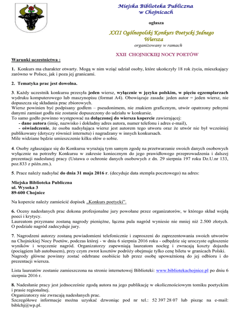 Miejska Biblioteka Publiczna w Chojnicach ogłasza XXII Ogólnopolski Konkurs Poetycki Jednego Wiersza organizowany w ramach XXII CHOJNICKIEJ NOCY POETÓW Warunki uczestnictwa : 1. Konkurs ma charakter otwarty. Mogą w nim wziąć udział osoby, które ukończyły 18 rok życia, mieszkający zarówno w Polsce, jak i poza jej granicami. 2. Tematyka prac jest dowolna. 3. Każdy uczestnik konkursu przesyła jeden wiersz, wyłącznie w języku polskim, w pięciu egzemplarzach wydruku komputerowego lub maszynopisu (format A4). Obowiązuje zasada: jeden autor = jeden wiersz, nie dopuszcza się składania prac zbiorowych. Wiersz powinien być podpisany godłem – pseudonimem, nie znakiem graficznym, utwór opatrzony pełnymi danymi zamiast godła nie zostanie dopuszczony do udziału w konkursie. To samo godło powinno występować na dołączonej do wiersza kopercie zawierającej: - dane autora (imię, nazwisko i dokładny adres autora, numer telefonu i adres e-mail), - oświadczenie, że osoba nadsyłająca wiersz jest autorem tego utworu oraz że utwór nie był wcześniej publikowany (dotyczy również internetu) i nagradzany w innych konkursach. Mile widziane będzie umieszczenie kilku słów o sobie. 4. Osoby zgłaszające się do Konkursu wyrażają tym samym zgodę na przetwarzanie swoich danych osobowych wyłącznie na potrzeby Konkursu w zakresie koniecznym do jego prawidłowego przeprowadzenia i dalszej prezentacji nadesłanej pracy (Ustawa o ochronie danych osobowych z dn. 29 sierpnia 197 roku Dz.U.nr 133, poz.833 z późn.zm.). 5. Prace należy nadsyłać do dnia 31 maja 2016 r. (decyduje data stempla pocztowego) na adres: Miejska Biblioteka Publiczna ul. Wysoka 3 89-600 Chojnice Na kopercie należy zamieścić dopisek „Konkurs poetycki”. 6. Oceny nadesłanych prac dokona profesjonalne jury powołane przez organizatorów, w którego skład wejdą poeci i krytycy. Laureatom przyznane zostaną nagrody pieniężne, łączna pula nagród wyniesie nie mniej niż 2.500 złotych. O podziale nagród zadecyduje jury. 7. Nagrodzeni autorzy zostaną powiadomieni telefonicznie i zaproszeni do zaprezentowania swoich utworów na Chojnickiej Nocy Poetów, podczas której - w dniu 6 sierpnia 2016 roku - odbędzie się uroczyste ogłoszenie wyników i wręczenie nagród. Organizatorzy zapewniają laureatom nocleg i zwracają koszty dojazdu (pociągiem lub autobusem), przy czym zwrot kosztów podróży obejmuje tylko cenę biletu w granicach Polski. Nagrody główne powinny zostać odebrane osobiście lub przez osobę upoważnioną do jej odbioru i do prezentacji wiersza. Lista laureatów zostanie zamieszczona na stronie internetowej Biblioteki: www.bibliotekachojnice.pl po dniu 6 sierpnia 2016 r. 8. Nadesłanie pracy jest jednocześnie zgodą autora na jego publikację w okolicznościowym tomiku poetyckim i prasie regionalnej. Organizatorzy nie zwracają nadesłanych prac. Szczegółowe informacje można uzyskać dzwoniąc pod nr tel.: 52 397 28 07 lub pisząc na e-mail: [email protected].