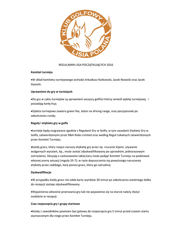 REGULAMIN LIGA POCZĄTKUJĄCYCH 2016 Komitet turnieju W skład komitetu turniejowego wchodzi Arkadiusz Rutkowski, Jacek Nowicki oraz Jacek Gazecki. Uprawnieni do gry w turniejach Do gry w cyklu turniejów są uprawnieni wszyscy golfiści którzy wnieśli opłatę turniejową i posiadają kartę hcp; Opłata turniejowa zawiera green fee, żeton na driving range, oraz poczęstunek po zakończeniu rundy; Reguły i etykieta gry w golfa turnieje będą rozgrywane zgodnie z Regułami Gry w Golfa, w tym zasadami Etykiety Gry w Golfa, zatwierdzonymi przez R&A Rules Limited oraz według Reguł Lokalnych zatwierdzonych przez Komitet Turnieju; każdy gracz, który rażąco naruszy etykietę gry przez np. rzucanie kijami, używanie wulgarnych wyrażeń, itp., może zostać zdyskwalifikowany po uprzednim, jednorazowym ostrzeżeniu. Decyzję o zastosowaniu takiej kary może podjąć Komitet Turnieju na podstawie własnej oceny sytuacji (reguła 33-7); w razie dopuszczenia się powyższego naruszenia etykiety przez caddiego, karę ponosi gracz, który go zatrudnia; Dyskwalifikacje W przypadku kiedy gracz nie odda karty wyników 30 minut po zakończeniu ostatniego dołka do recepcji zostaje zdyskwalifikowany. Wyjaśnienia odnośnie przerwania gry lub nie pojawienia się na starcie należy złożyć osobiście w recepcji. Czas rozpoczęcia gry i grupy startowe Każdy z zawodników powinien być gotowy do rozpoczęcia gry 5 minut przed czasem startu wyznaczonym dla niego przez Komitet Turnieju. zawodnik musi ukończyć rundę w tej samej grupie startowej, w jakiej rundę rozpoczął. Samowolna zmiana lub łączenie grup startowych przez zawodników są niedozwolone. Karą za złamanie niniejszej reguły jest dyskwalifikacja. Reg. 6-2 b. Zgłoszenia przyjmowane wyłącznie w recepcji klubowej; Opóźnianie gry. Wolne tempo gry Czas na uderzenie nie powinien przekroczyć: dla pierwszego gracza z grupy – 50 sekund na strzał do greenu, chip lub putt, oraz 40 sekund na strzał z tee lub uderzenie drugiego, trzeciego lub czwartego gracza. Poza putting green’em czas na uderzenie rozpoczyna się od momentu, gdy zawodnik miał wystarczającą ilość czasu na dojście do piłki, jest to jego kolej gry i może wykonać uderzenie bez zakłóceń zewnętrznych. Czas spędzony na pomiarze odległości zaliczany jest do czasu na uderzenie. Na putting green’ie czas na uderzenie rozpoczyna się od momentu gdy zawodnik miał wystarczającą ilość czasu na podniesienie, oczyszczenie i odłożenie piłki, naprawienie śladów po piłkach i starych dołkach, usunięcie naturalnych utrudnień ruchomych na swojej linii puttingu. Czas spędzony na odczytywaniu linii puttingu zaliczany jest do czasu na uderzenie. Jeżeli którykolwiek z graczy przekroczy ten czas, będzie on uważany za opóźniającego grę i otrzyma odpowiednią karę od sędziego. Karą za opóźnianie gry jest: pierwsze wykroczenie: jedno uderzenie karne, drugie wykroczenie: dwa uderzenia karne, trzecie wykroczenie: dyskwalifikacja, Zawieszenie gry Jeżeli Komitet Turnieju stwierdzi, że istnieją powody uniemożliwiające grę, może zarządzić czasowe zawieszenie gry lub unieważnić grę i wszystkie wyniki danej rundy. a) natychmiastowe przerwanie gry: jeden długi sygnał syreny: Jeżeli zawodnicy znajdują się między dołkami, nie wolno im rozpocząć gry do czasu wznowienia jej przez Komitet Turnieju. Jeżeli zawodnicy są w trakcie rozgrywania dołka, muszą niezwłocznie przerwać grę i postąpić zgodnie z Reg. 6-8.c. Jeżeli zawodnik nie przerwie gry natychmiast, zostanie zdyskwalifikowany, chyba, że okoliczności dadzą podstawy do odstąpienia od takiej kary, zgodnie z Reg. 33-7. b) przerwanie gry: trzy następujące po sobie sygnały syreny: Jeżeli zawodnicy znajdują się między dołkami, nie wolno im rozpocząć gry do czasu wznowienia jej przez Komitet Turnieju. Jeżeli zawodnicy są w trakcie rozgrywania dołka, mogą przerwać grę natychmiast lub kontynuować ją, pod warunkiem, ze zrobią to bez opóźniania. Jeżeli zdecydują się na kontynuowanie gry danego dołka, mogą ją przerwać w dowolnym momencie przed zakończeniem dołka, zgodnie z Reg.6-8. c )w każdym przypadku gra musi być przerwana po zakończeniu danego dołka . Gracze muszą wznowić grę, gdy Komitet Turnieju ogłosi jej wznowienie. Zdawanie kart wyników jeżeli gracz nie zda swojej karty 30 minut po zakończeniu ostatniego dołka, może zostać zdyskwalifikowany, chyba, że okoliczności dadzą podstawy do odstąpienia od takiej kary (reguła 6-6b). marker zobowiązany jest do wpisania wyników brutto na kartę wyników swoich i gracza którego kartę posiada. Odpowiedzialność za podanie poprawnych i kompletnych wyników oraz za złożenie poprawnych podpisów na kartach ponosi gracz i marker. Zasady dogrywek oraz rozstrzygania remisów Rozstrzyganie remisów odbywa się na podstawie uzyskanych wyników na następujących dołkach: lepszy wynik na 6 ostatnich dołkach, lepszy wynik na 3 ostatnich dołkach, lepszy wynik na ostatnim dołku, HCP turniejowy Maksymalny hcp turniejowy to 54 dla mężczyzn i dla kobiet. Minimalny hcp turniejowy to 30 dla mężczyzn i kobiet. W sytuacji kiedy komitet turniejowy nie jest w stanie znaleźć w systemie zapisu dotyczącego aktualnego hcp gracza i sam grający nie wiem jaki ma aktualny hcp, wówczas na podstawie zebranych informacji przez komitet zostaje mu przyznany hcp 0. Piłki oraz kije golfowe Piłki oraz kije używane w turniejach muszą być dopuszczone do rozgrywek amatorskich przez R&A (www.randa.org/rules/equipment). Sprzęt elektroniczny Używanie krótkofalówek, telefonów komórkowych oraz pagerów w trakcie gry jest zabronione. Używanie telefonów komórkowych dozwolone jest wyłącznie w celu skontaktowania się z sędzią lub Komitetem Turnieju. Dozwolone jest korzystanie z mierników odległości, pod warunkiem że mają wyłączoną funkcje pomiaru różnic wysokości, temperatury, prędkoś