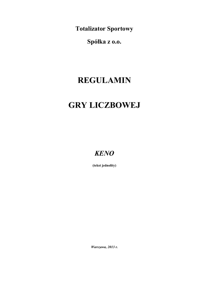 Totalizator Sportowy Spółka z o.o. REGULAMIN GRY LICZBOWEJ KENO (tekst jednolity) Warszawa, 2013 r. POSTANOWIENIA OGÓLNE §1 1. Na podstawie niniejszego regulaminu Totalizator Sportowy Spółka z o.o. z siedzibą w Warszawie przy ul. Targowej 25, wpisana do rejestru przedsiębiorców prowadzonego przez Sąd Rejonowy dla m. st. Warszawy XIII Wydział Gospodarczy pod numerem KRS 0000007411, NIP 525-00-10-982, o kapitale zakładowym w wysokości 115.000.000 zł, zwana dalej TS, organizuje na obszarze całego kraju grę liczbową KENO typu keno, w uproszczeniu dalej zwaną także „grą KENO” lub „KENO”. 2. KENO polega na zawarciu przez grającego zakładu, zgodnie z postanowieniami § 4 ust. 1, 2, 6 i § 5 ust. 1 i 2, przeprowadzeniu przez TS losowania 20 liczb ze zbioru liczb od 1 do 70, wypłacie stwierdzonej wygranej. 3. W grze KENO mogą brać udział wyłącznie osoby, które ukończyły 18 lat. 4. W przypadku wątpliwości co do wieku uczestnika gry KENO, osoba sprzedająca kupony jest upoważniona do żądania okazania dokumentu potwierdzającego tożsamość i wiek uczestnika gry. 5. Zawierającym zakład nie może być osoba, wobec której sąd orzekł zakaz uczestnictwa w grach hazardowych. §2 1. Zawieranie zakładów odbywa się w terminach ustalonych przez TS i podanych do publicznej wiadomości. 2. Zmiany terminów zawierania zakładów KENO podawane są w terminach ustalonych przez TS i podanych do publicznej wiadomości, co najmniej na 3 dni przed ich wprowadzeniem. 3. Możliwość zawierania zakładów w punktach sprzedaży wprowadzona zostanie w terminie określonym przez TS i podanym do publicznej wiadomości, co najmniej na 2 dni przed ich wprowadzeniem. 4. TS uprawniony jest do podjęcia decyzji o zakończeniu organizacji gry KENO, co zobowiązany jest podać do publicznej wiadomości, na co najmniej 3 dni przed ustalonym terminem zakończenia organizacji gry. 1 SZCZEGÓŁOWE WARUNKI I ZASADY GRY PRZYSTĄPIENIE DO GRY I ZAWARCIE ZAKŁADU §3 1. Zawarcie zakładu w grze KENO w kolekturze lub punkcie sprzedaży następuje poprzez złożenie przez grającego dyspozycji określonej w § 4 ust. 1, 2 i 6, wpłacenie odpowiedniej stawki za każdy zakład oraz dokonanie 25% dopłaty do stawki. 2. Po dokonaniu czynności wymienionych w ust. 1 grający otrzymuje kupon KENO. 3. Dokonanie czynności wymienionych w ust.1 - 2 równoznaczne jest z wyrażeniem przez grającego zgody na określone niniejszym regulaminem warunki organizacji i uczestnictwa w grze liczbowej KENO. §4 1. W KENO grający określa ilość typowanych liczb (od 1 do 10), typuje wskazaną ilość liczb ze zbioru od 1 do 70 lub zleca dokonanie losowego wyboru tych liczb metodą chybił-trafił. 2. Grający określa krotność stawki za zakład. 3. Ilość możliwych krotności stawki, na jaką można zawierać zakłady, jest ustalana przez TS. 4. Zmiana możliwych krotności stawki, o których mowa w ust. 3, jest podawana do publicznej wiadomości na co najmniej 3 dni przed jej wprowadzeniem. 5. Grający może zawrzeć zakład na jedno lub większą liczbę losowań (zakład wielolosowaniowy). 6. Grający określa liczbę kolejno po sobie następujących losowań, dla których zawarty zakład pozostaje ważny. 7. Liczba kolejno następujących po sobie losowań, na które można zawierać zakłady wielolosowaniowe, jest ustalana przez TS. 8. Zmiana liczby losowań, o której mowa w ust.7, jest podawana do publicznej wiadomości na co najmniej 3 dni przed jej wprowadzeniem. 9. Zakłady KENO ważne na dane losowanie grający może zawierać do momentu jego rozpoczęcia. 10. Grający nie może zawrzeć zakładu KENO po ostatnim losowaniu KENO w danym dniu. §5 1. Zawarcie zakładu w grze KENO następuje z chwilą wniesienia opłaty za każdy zakład określony w § 4 ust. 1 z uwzględnieniem zadeklarowanej przez grającego, zgodnie z § 4 ust. 2, krotności stawki za zakład. 2 2. Zawarcie zakładu wielolosowaniowego KENO następuje z chwilą wpłacenia kwoty stanowiącej iloczyn liczby losowań, na które zakład jest zawierany, zgodnie z § 4 ust. 6 i opłaty określonej w ust. 1. §6 1. Dowodem udziału w KENO jest wyłącznie kupon wydrukowany zgodnie z § 20 przez terminal lub inne urządzenie potwierdzające zawarcie zakładu. OPŁATA ZA JEDEN ZAKŁAD §7 1. Stawka za jeden zakład w KENO ustalana jest przez TS i podawana do publicznej wiadomości. 2. Zmiana ustalonej stawki za jeden zakład w KENO podawana jest przez TS do publicznej wiadomości na co najmniej 3 dni przed jej wprowadzeniem. 3. Do stawki, o której mowa w ust. 1, grający dokonuje dopłaty w wysokości 25% stawki. 4. TS może wprowadzić stawkę promocyjną za określoną liczbę zakładów, liczbę losowań oraz wielokrotności stawki. Informacja o promocyjnym cenniku zakładów oraz czasie trwania promocji ustalana jest przez TS i podawana do publicznej wiadomości na co najmniej 3 dni przed jej wprowadzeniem. LOSOWANIE WYNIKÓW GRY §8 1. Losowanie wyników KENO przeprowadza się w terminie i czasie ustalonym przez TS i podanym do publicznej wiadomości. 2. Zmiana ustalonego terminu losowania wyników KENO podawana jest przez TS do publicznej wiadomości na co najmniej 3 dni przed jej wprowadzeniem. 3. W przypadku zawarcia przez grającego zakładu na jedno losowanie KENO, zakład taki bierze udział w najbliższym losowaniu KENO. 4. W przypadku zawarcia przez grającego zakładu wielolosowaniowego losowania wyników dla tego zakładu następują zgodnie z zadysponowaną przez grającego liczbą losowań, począwszy od najbliższego losowania KENO oznaczonego numerem wydrukowanym na kuponie jako pierwszy, a skończywszy na losowaniu KENO oznaczonym numerem wydrukowanym na kuponie jako drugi. 3 §9 1. Jeżeli losowanie wyników KENO nie może się odbyć wskutek zaistnienia siły wyższej bądź awarii urządzenia losującego przed lub w trakcie losowania, informację o niniejszym fakcie podaje się do wiadomości, w szczególnośc