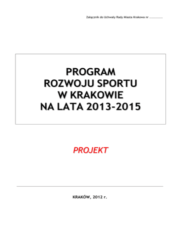 Załącznik do Uchwały Rady Miasta Krakowa nr ............ PROGRAM ROZWOJU SPORTU W KRAKOWIE NA LATA 2013-2015 PROJEKT KRAKÓW, 2012 r. Program rozwoju sportu w Krakowie na lata 2013-2015 I. WSTĘP Kraków ma bogatą sportową historię. Rok 1885 jest szczególną datą w dziejach krakowskiego sportu, kiedy powstało Towarzystwo Gimnastyczne „Sokół". W roku 1889 dr Henryk Jordan założył nieopodal Błoń pierwszy europejski park dla dzieci i młodzieży, w którym mieściły się liczne obiekty sportowe. Cieszył się on dużą popularnością i można zaryzykować stwierdzenie, iż krakowskie życie sportowe koncentrowało się właśnie na Błoniach. W roku 1894 rozegrano pierwszy mecz futbolowy. Pierwsze w Polsce zawody lekkoatletyczne w roku 1897 odbyły się również w Krakowie. Kilkanaście lat później, w 1906 roku, powstały jedne z najbardziej znanych polskich klubów tj. Klub Sportowy Cracovia, Towarzystwo Sportowe Wisła Kraków oraz Rzemieślniczy Klub Sportowy Juvenia Kraków. Również w Krakowie w 1909 roku założony został Akademicki Związek Sportowy, jedna z najstarszych organizacji sportowych w Polsce. To właśnie w Krakowie 12 października 1919 roku odbył się zjazd założycielski Polskiego Komitetu Olimpijskiego. Z Krakowa i krakowskich klubów sportowych wywodzi się wielu wybitnych sportowców, uczestników i medalistów igrzysk olimpijskich, mistrzostw świata czy Europy (m.in. Helena Rakoczy, Barbara Sobottowa, Czesław Łaksa, Kazimierz Kmiecik, Alfred Kałuziński, Robert Korzeniowski, Robert Kubica, Agnieszka Radwańska, Radosław Zawrotniak, Katarzyna Rogowiec i wielu innych znakomitych sportowców). I.1. KIERUNKI ROZWOJU SPORTU W POLSCE Sport jest składową polityki społecznej nowoczesnego państwa. Nakłady poniesione na rozwój sportu, na edukację sportową i promowanie dobrych nawyków aktywności fizycznej są nakładami skierowanymi na promowanie zdrowego i sprawnego społeczeństwa. Z tych względów Państwo jest żywotnie zainteresowane rozwojem i upowszechnieniem sportu. 23 stycznia 2007 roku Rada Ministrów przyjęła Strategię rozwoju sportu w Polsce do roku 2015, w której określone zostały priorytety i jednoznaczna wizja rozwojowa. Głównym celem strategicznym jest „Aktywne i Sprawne Społeczeństwo”. Zostały w niej wyznaczone trzy priorytety określające pola działania państwa w tym zakresie: 1. Popularyzacja sportu dla wszystkich. 2. Wzrost poziomu wyników sportowych. 3. Rozwój infrastruktury sportowo – rekreacyjnej. Każdemu z priorytetów przypisane zostały konkretne zadania. Po kilku latach realizacji Strategii widoczne są efekty tych działań. Są to z jednej strony akcje promujące aktywność fizyczną, a z drugiej - inwestycje infrastrukturalne będące często wspólnym zadaniem państwa i samorządu. 2 Program rozwoju sportu w Krakowie na lata 2013-2015 I.2. KIERUNKI ROZWOJU SPORTU W KRAKOWIE Działania podejmowane przez Państwo w zakresie rozwoju sportu są jednocześnie wytycznymi kierunków w tej dziedzinie na terenie województwa czy gminy. Każda jednostka samorządu terytorialnego posiada swoją specyfikę i uwarunkowania, które stanowią o jej wyjątkowości również w zakresie sportowych zainteresowań mieszkańców. Ważne jest, aby program rozwoju sportu w Krakowie korelował z działaniami na poziomie województwa i kraju. Rodzi to możliwość przy zachowaniu specyfiki charakterystycznej dla Krakowa, wykorzystania narzędzi stworzonych przez Państwo dla rozwoju sportu. Przyjęta w dniu 13 kwietnia 2005 roku przez Radę Miasta Krakowa Strategia Rozwoju Krakowa zakreśliła długoterminowy plan rozwoju społeczno – gospodarczego Miasta. Dla urzeczywistnienia wizji rozwoju wskazane zostały cele strategiczne, w tym Cel strategiczny III: Kraków europejską metropolią o ważnych funkcjach nauki, kultury i sportu oraz wyodrębniony cel operacyjny III – 6: Tworzenie warunków dla rozwoju sportu, kultury fizycznej i rekreacji. Narzędziem realizacji wskazanych celów jest Program Rozwoju Sportu w Krakowie na lata 2013-2015 (zwany dalej „Programem”), będący kontynuacją w zmodyfikowanej formie Programu Rozwoju Sportu i Rekreacji w Krakowie na lata 2010-2012(…), który nawiązuje do wizji Krakowa, określonej w w.w. Strategii: „Kraków miastem obywatelskim, zapewniającym wysoką jakość życia mieszkańców i zrównoważony rozwój (...). Miasto popularyzuje rekreację ruchową, organizuje zajęcia, zawody i wydarzenia sportowo - rekreacyjne, wspiera szkolenia kadry instruktorów, tworzy, utrzymuje i udostępnia bazę sportowo-rekreacyjną”. Program określa kierunki realizacji przez władze samorządowe głównego założenia: sport służyć ma powszechnie rozwojowi społeczeństwa poprzez zachowanie sprawności fizycznej i zdrowia, zagospodarowaniu czasu wolnego, szczególnie dzieci i młodzieży. Działalność ta ma być podstawą budowy wizerunku Krakowa jako ośrodka sportu. Dla właściwej realizacji zadań bieżących w zakresie upowszechniania sportu wśród dzieci i młodzieży (działalność szkoleniowa, realizacja miejskich programów sportowych, stypendia sportowe) zakłada się narastający udział wydatków przeznaczanych corocznie na ten cel w 2013 roku na poziomie 0,30% całości wydatków budżetu Miasta, w 2014 roku na poziomie 0,40% całości wydatków budżetu Miasta, w 2015 roku na poziomie 0,50% całości wydatków budżetu Miasta. 3 Program rozwoju sportu w Krakowie na lata 2013-2015 II. WARUNKI REALIZACJI PROGRAMU II.1. ZADANIA SAMORZĄDU Konstytucja Rzeczpospolitej Polskiej w artykule 68 ust. 5 stanowi: „Władze publiczne popierają rozwój kultury fizycznej, zwłaszcza wśród dzieci i młodzieży”. Miasto Kraków jako gmina na prawach powiatu zobowiązana jest do zaspokajania zbiorowych potrzeb wspólnoty mieszkańców, realizując zadania publiczne zarówno o charakterze gminnym jak i ponadgminnym. Akty prawne regulujące ustrój takiej j