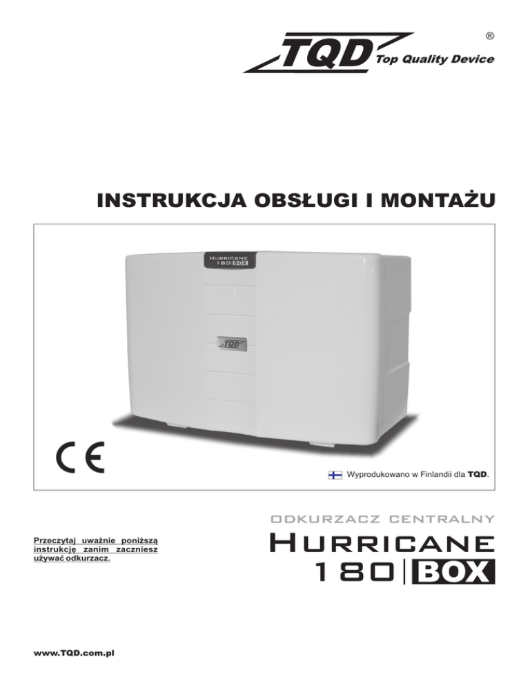 ® INSTRUKCJA OBS£UGI I MONTA¯U Wyprodukowano w Finlandii dla TQD. odkurzacz centralny Przeczytaj uwa¿nie poni¿sz¹ instrukcjê zanim zaczniesz u¿ywaæ odkurzacz. www.TQD.com.pl Hurricane 180 odkurzacz centralny Hurricane 180 ® Instrukcja obs³ugi i monta¿u SPIS TREŒCI Instrukcje bezpieczeñstwa / Dane techniczne.........................................................................2 Budowa odkurzacza i elementy sk³adowe...............................................................................3 Instrukcja monta¿u / konserwacji odkurzacza.........................................................................4 Rozwi¹zywanie problemów.......................................................................................5 P³yta g³ówna - opis w³asciwoœci systemu SMART CHECK....................................................6 INSTRUKCJE BEZPIECZEÑSTWA Przeczytaj uwa¿nie wszystkie instrukcje bezpieczeñstwa zanim zaczniesz u¿ywaæ odkurzacz. - Nie odkurzaj ostrych przedmiotów takich jak szk³o, ig³y, poniewa¿ mog¹ one uszkodziæ w¹¿. - Odkurzacz przeznaczony jest do odkurzania suchego. Nie u¿ywaj odkurzacza do p³ynów. - Nie zakrywaj odkurzacza ¿adnymi przedmiotami - Postêpuj zgodnie z instrukcja obs³ugi - Nie u¿ywaj odkurzacza w pobli¿u Ÿród³a dymu, ognia, ¿aru, popio³u. - Przegl¹d serwisowy mo¿e byæ dokonany tylko przez specjalistê. U¿ywaj akcesoriów i czêœci zamiennych rekomendowanych tylko przez producenta. Nigdy nie modyfikuj urz¹dzenie w ¿aden sposób. - Nie u¿ywaj odkurzacza w pomieszczeniach gdzie jest obecnoœæ substancji ³atwopalnych. - Nigdy nie u¿ywaj urz¹dzenia kiedy posiada uszkodzone przewody elektryczne. Odkurzacz wyposa¿ony jest w specjalny przewód, który jeœli jest taka potrzeba musi byæ wymieniony na taki sam zamówiony z autoryzowanego sklepu. - Zawsze kiedy zmieniasz worek na œmieci lub dokonujesz czynnoœci konserwacyjnych od³¹cz odkurzacz od zasilania elektrycznego. - Od³¹czaj¹c zasilanie elektryczne zawsze chwytaj za wtyczkê. Nigdy nie ci¹gnij za przewód. - Pamiêtaj, ¿e odkurzacz nie jest zabawk¹ - Elektryczne gniazdo zasilaj¹ce i wtyczka powinny znajdowaæ siê w widocznym miejscu. - Nigdy nie u¿ywaj odkurzacza bez worka na kurz - G³ówny bezpiecznik: 10A - Szczególnie zabronione jest odkurzanie zanieczyszczeñ budowlanych w tym py³u budowlanego, gipsu oraz popio³u. - Nie montuj odkurzacza w niewielkiej przestrzeni zamkniêtej. Minimalne wymagania przestrzenne (mm): 490 x 570 x 700 (sz / g³ / wys). DANE TECHNICZNE Obudowa Wymiary szer / wys / g³ [mm] Moc max / nominalna [W] Napiêcie, min-max [V] Podciœnienie [kPa] Przep³yw powietrza [m3/h] Moc ss¹ca [AirWatt] System filtracji Zapasowy worek na œmieci Zabezpieczenie silnika Pojemnoœæ zbiornika [l] Waga [kg] Bezpiecznik (auto) Poziom ha³asu [db(A)] Max. powierzchnia sprz¹tania [m2] Max. odleg³oœæ od najdalszego gniazda [m] Przybli¿ona max. iloœæ gniazd ss¹cych Gwarancja 2 Hurricane 180 BOX tworzywo sztuczne 460 / 310 / 240 1800 / 1400 210-244V, 50Hz 33 200 635 filtr silnika + worek TAK TAK 5 5 10A 68 350 35 10 3 lata www.TQD.com.pl odkurzacz centralny Hurricane 180 ® Instrukcja obs³ugi i monta¿u Budowa odkurzacza i elementy sk³adowe SILNIK FILTR ZGRUBNY STELA¯ WORKA WOREK WOREK ZAPASOWY ZAWIESIA GNIAZDO ZASILANIA ELEKTRYCZNEGO ZABEZPIECZENIE PRZECI¥¯ENIOWE PRZYCISK “SMART CHECK” DIODA SYGNALIZACYJNA GNIAZDO NISKIEGO NAPIÊCIA AUTOMATYCZNY ZAWÓR BEZPIECZEÑSTWA www.TQD.com.pl 3 odkurzacz centralny Hurricane 180 ® Instrukcja obs³ugi i monta¿u Monta¿ odkurzacza centralnego Konserwacja i wymiana worka Monta¿ œciennej konsoli mocuj¹cej Konsola mocuj¹ca przymocowana jest do œciany za pomoc¹ 4 wkrêtów. W przypadku montowania lub instalacji na wykoñczonych powierzchniach zaleca siê u¿ywaæ dostêpnych wsporników mocuj¹cych. Wymiana worka: 1. Wyci¹gnij (poci¹gaj¹c do siebie) stela¿ mocuj¹cy worek z urz¹dzenia. Przytrzymaj jedna rêk¹ urz¹dzenie jeœli poczujesz, ¿e stela¿ nie daje siê zdemontowac. 2. Zdemontuj worek ze stala¿a. 3. Zamontuj nowy worek na stela¿u. Wsuñ tekturowy ko³nierz worka w przeznaczone do tego prowadnice na stela¿u. Monta¿ odkurzacza na konsoli mocuj¹cej Odkurzacz montuje siê na konsoli mocuj¹cej za pomoc¹ zawiesi znajduj¹cych siê z ty³u urz¹dzenia. 4. Wsuñ stela¿ z zamontowanym workiem z powrotem do urz¹dzenia. Wyczuj za pomoc¹ d³oni poprzez zainstalowany worek czy rura odkurzacza znajduje siê wewn¹trz worka. Jeœli stela¿ jest zamontowany niew³aœciwie pokrywa odkurzacza nie zamknie siê. Filtr zgrubny Filtr zgrubny jest ostatnim etapem filtracji zabezpieczaj¹cym silnik. Jeœli z jakiejkolwiek przyczyny worek jest uszkodzony filtr zgrubny zabezpieczy dostanie siê kurzu do silnika. W razie potrzeby mo¿na czyœcic filtr zgrubny pod czysta bie¿¹c¹ wod¹. Po umyciu filtra dok³adnie go wysusz przed ponownym zainstalowaniem. Monta¿ odkurzacza na konsoli mocuj¹cej Umieœc urz¹dzenie na konsoli. SprawdŸ czy zawiesia znajduj¹ce siê z ty³u urz¹dzenia s¹ równo na gumowych czêœciach konsoli. Zablokuj zatrzaski zawiesi. Pod³¹cz przewody niskiego napiêcia z instalacji do urz¹dzenia. 4 www.TQD.com.pl odkurzacz centralny Hurricane 180 ® Instrukcja obs³ugi i monta¿u Rozwi¹zywanie problemów Odkurzacz nie w³¹cza siê Moc ss¹ca jest s³aba ? Czy odkurzacz jest pod³¹czony do zasilania ? Czy wszystkie gniazda ss¹ce s¹ s¹ w³aœciwie elektrycznego? Czy wtyczka przewodu zasilaj¹cego odkurzacz jest pod³¹czona do gniazda zasilaj¹cego? zamkniête? ? Czy nic nie utknê³o w gnie¿dzie? ? Czy jest napiêcie(230V) w gniazdku zasilaj¹cym? ? Czy worek na œmieci jest pe³ny? ? Czy do odkurzacza pod³¹czony jest przewód niskiego ? Czy drzwiczki rewizyjne odkurzacza s¹ w³asciwie napiêcia? domkniête? ? Czy odkurzacz w³¹cza siê jeœli próbujesz go ? Czy zatkana jest rura ss¹ca? uruchomic z innego gniazda ss¹cego? Jeœli odkurza