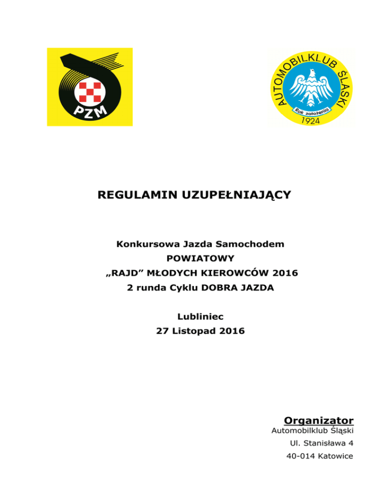 REGULAMIN UZUPEŁNIAJĄCY Konkursowa Jazda Samochodem POWIATOWY „RAJD” MŁODYCH KIEROWCÓW 2016 2 runda Cyklu DOBRA JAZDA Lubliniec 27 Listopad 2016 Organizator Automobilklub Śląski Ul. Stanisława 4 40-014 Katowice SPIS TREŚCI 1. USTALENIA OGÓLNE 3 2. PROGRAM 3 3. ORGANIZACJA 3 4. ZGŁOSZENIA 5 5. UBEZPIECZENIE 6 6. NUMERY IDENTYFIKACYJNE 6 7. REKLAMA 6 8. ODBIÓR ADMINISTRACYJNY 6 9. ZAPOZNANIE Z TRASĄ 8 10. BADANIA KONTROLNE 8 11. OPONY 8 13. ODPRAWA UCZESTNIKÓW 8 14. PRZEBIEG IMPREZY 8 15. PROCEDURA STARTU 9 16. POMIAR CZASU 9 17. META 9 18. BEZPIECZEŃSTWO 9 19. IDENTYFIKACJA OSÓB OFICJALNYCH 9 20. NAGRODY 10 21. PROTESTY 10 22. KARY 10 23. POSTANOWIENIA KOŃCOWE 10 Strona 2 z 14 USTALENIA OGÓLNE Konkursowa Jazda Samochodem zostanie przeprowadzona zgodnie z postanowieniami: • Międzynarodowego Kodeksu Sportowego, • Regulaminu Sportowego Rajdów Regionalnych FIA wraz z załącznikami, • Regulaminu Konkursowej Jazdy Samochodem na rok 2016, • Regulaminu Ochrony Środowiska PZM, • Ustawy „Prawo o Ruchu Drogowym RP” • niniejszego regulaminu uzupełniającego. Modyfikacje, zmiany i/lub uzupełnienia do niniejszego Regulaminu Uzupełniającego będą publikowane wyłącznie w numerowanych i datowanych komunikatach ogłaszanych przez organizatora lub ZSS. Otwarcie listy zgłoszeń 11.11.2016 Zamknięcie listy zgłoszeń 25.11.2016 Odbiór administracyjny 27.11.2016 godz. 7:30-8:30 Badanie kontrolne BK1 27.11.2016 godz. 7:45-9:00 Zapoznanie z trasą 27.11.2016 godz. 8:00-10:30 Pierwsze posiedzenie ZSS 27.11.2016 godz. 10:00 Publikacja listy załóg dopuszczonych do startu 27.11.2016 godz. 10:45 Odprawa uczestników 27.11.2016 godz. 10:45 Start 27.11.2016 godz. 11:00 Meta 27.11.2016 godz. 15:37 Badanie kontrolne BK2 27.11.2016 godz. 15:37 Opublikowanie końcowej klasyfikacji prowizorycznej 27.11.2016 godz. 17:30 Rozdanie nagród 27.11.2016 godz. 18:15 1. USTALENIA OGÓLNE 1.1 Miejsce i termin imprezy Impreza odbędzie się w dniu 27.11.2016r na terenie powiatu lublinieckiego. 1.2 Nazwa i ranga imprezy Konkursowa Jazda Samochodem: RAJD MŁODYCH KIEROWCÓW 2016 i stanowi 2 rundę Cyklu DOBRA JAZDA o Puchar Prezesa Automobilklubu Śląskiego. 1.3 Numer wizy ZO PZM Numer wizy 35 / KJS / 2016 wydana przez OKSS w Katowicach w dniu 8 listopada 2016r. 1.4 Lokalizacja Biura Biuro znajdować się będzie do dnia 25.11.2016r pod adresem: Automobilklub Śląski w Katowicach, ulica Stanisława 4 w godzinach 8:00 – 16:00. W dniu imprezy: Ośrodek Szkoleniowo-Rekreacyjny STRZELNICA, ul. Lubliniecka 9, Kochcice, 42-713 Kochanowice. 1.5 Lokalizacja startu, mety i parku zamkniętego Start – Lubliniec, parking przy ośrodku STRZELNICA, Meta – Lubliniec, parking przy ośrodku STRZELNICA, Park zamknięty – Lubliniec, parking przy ośrodku STRZELNICA. Strona 3 z 14 1.6 Charakterystyka Impreza zostanie przeprowadzona w ciągu jednego dnia i składa z 3 sekcji. Na trasie zlokalizowane będzie 9 prób poprzedzonych PKC. Nawierzchnia trasy i prób : asfalt. Długość trasy: 97.65km (w tym 10.20km prób) Trasa imprezy jest obowiązkowa i została opisana w książce drogowej. 1.7 Ukończenie KJS – u daje 1/6 części uprawnień do uzyskania licencji sportu samochodowego stopnia RN. 2. ORGANIZACJA 2.1 Nazwa organizatora Automobilklub Śląski 2.2 Adres Ul. Stanisława 4 40 – 014 Katowice tel. (32) 254-88-74, 693-340-374 strona: www.auto-slaski.katowice.pl e-mail: [email protected] 2.3. Władze KJS 2.3.1. Zespół Sędziów Sportowych Przewodniczący Dominik Ochojski Członek Adrian Szafert Członek Marcjanna Grenda 2.3.2. Osoby oficjalne Dyrektor Imprezy Andrzej Szkuta Asystent ds. Sportowych Robert Szkuta Asystent ds. Organizacyjnych Jolanta Michałek Kierownik Biura Krystyna Bywalec Kierownik Komisji Obliczeń Michał Szkuta Kierownik Badań Kontrolnych Bartłomiej Urbański Kierownik Komasacji Andrzej Tomanek 3. ZGŁOSZENIA 3.1 Załoga 3.1.1. Załogę stanowią wyłącznie dwie osoby, określani jako kierowca i pilot. Kierowca musi mieć prawo jazdy kat. B, a pilot ukończone 17 lat. 3.1.2. Kierowca nie może posiadać jakiejkolwiek licencji kierowcy sportu samochodowego w rozumieniu przepisów Polskiego Związku Motorowego, za wyjątkiem zawodników posiadających licencję, wymienionych w punkcie 1.1 Regulaminu Ramowego KJS. 3.1.3.Pilot nie może prowadzić samochodu podczas imprezy. W przypadku stwierdzenia prowadzenia samochodu przez pilota, załoga zostanie wykluczona. Strona 4 z 14 3.2 Obowiązki załogi Do obowiązków załogi należy: 3.2.1 Obecność na badaniu kontrolnym BK1. 3.2.2. Obecność na odprawie uczestników. 3.2.3. Przejazd trasy imprezy z pobraniem wiz na wszystkich PKC w podanej przez organizatora kolejności i kierunku zgodnym z książką drogową. 3.2.4. Odbycie wszystkich prób w zapiętych pasach bezpieczeństwa, zapiętych kaskach ochronnych, z włączonymi światłami mijania i zamkniętymi szybami. Nieprzestrzeganie powyższych przepisów pociągnie za sobą karę do wykluczenia włącznie. 3.3 Procedura zgłoszeń 3.3.1. Uczestnik zamierzający wziąć udział w KJS – POWIATOWY „RAJD” MŁODYCH KIEROWCÓW 2016 musi przesłać do dnia 25.11.2016r do godz. 24:00 wypełnione zgłoszenie na adres: e-mail: [email protected] 3.3.2. Jeżeli zgłoszenie wysłane jest pocztą e-mail, oryginał musi dotrzeć do organizatora najpóźniej w dniu odbioru administracyjnego. Oryginał zgłoszenia musi być czytelny i podpisany przez obydwu członków załogi. 3.3.3. Zgłoszenie zostanie przyjęte tylko w przypadku, gdy towarzyszyć mu będzie pokwitowanie wpłaty pełnej kwoty wpisowego. 3.3.4 Przez fakt podpisania zgłoszenia załoga przyjmuje do wiadomości, że startuje w imprezie na własną odpowiedzialność i zrzeka się wszelkich praw do odszkodowań za straty wynikłe podczas imprezy. Zrzeczenie to dotyczy FIA, PZM, Organizatora, osób oficjalnych występujących w imprezie i innych uczestników. 3.3.5 Organizator ma prawo nie przyjęcia zgłosze