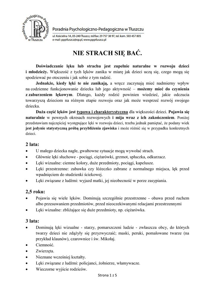 NIE STRACH SIĘ BAĆ. Doświadczanie lęku lub strachu jest zupełnie naturalne w rozwoju dzieci i młodzieży. Większość z tych lęków zanika w miarę jak dzieci uczą się, czego mogą się spodziewać po otoczeniu i jak sobie z tym radzić. Jednakże, kiedy lęki te nie zanikają, a wręcz zaczynają mieć nadmierny wpływ na codzienne funkcjonowanie dziecka lub jego aktywność – możemy mieć do czynienia z zaburzeniem lękowym. Dlatego, każdy rodzić powinien wiedzieć, jakie odczucia towarzyszą dzieciom na różnym etapie rozwoju oraz jak może wesprzeć rozwój swojego dziecka. Duża część lęków jest typowa i charakterystyczna dla większości dzieci. Pojawia się naturalnie w pewnych okresach rozwojowych i mija wraz z ich zakończeniem. Poniżej przedstawiam najczęściej występujące lęki w rozwoju dzieci, trzeba jednak pamiętać, że podany wiek jest jedynie statystyczną próbą przybliżenia zjawiska i może różnić się w przypadku konkretnych dzieci. 2 lata: U małego dziecka nagłe, gwałtowne sytuacje mogą wywołać strach. Głównie lęki słuchowe - pociągi, ciężarówki, grzmot, spłuczka, odkurzacz. Lęki wizualne: ciemne kolory, duże przedmioty, pociągi, kapelusze. Lęki przestrzenne: zabawka czy łóżeczko zabrane z normalnego miejsca, lęk przed wpadnięciem do studzienki ściekowej. Lęki związane z ludźmi: wyjazd matki, jej nieobecność w porze zasypiania. 2,5 roku: Pojawia się wiele lęków. Dominują szczególnie przestrzenne - obawa przed ruchem albo przesuwaniem przedmiotów, przed nieoczekiwanymi relacjami przestrzennymi Lęki wizualne: zbliżające się duże przedmioty, np. ciężarówka. 3 lata: Dominują lęki wizualne - starzy, pomarszczeni ludzie - zwłaszcza obcy, do których twarzy dzieci nie zdążyły się przyzwyczaić; maski, peruki, pomalowane twarze (na przykład klaunów), czarownice i św. Mikołaj. Ciemność. Zwierzęta. Nieznane wcześniej kształty. Lęki związane z ludźmi: policjanci, żołnierze, włamywacze. Wieczorne wyjście rodziców. Strona 1 z 5 4 lata: Powracają lęki słuchowe, szczególnie odgłosy silników. Lęki wizualne: ciemność, dzikie zwierzęta. Lęki związane z ludźmi: wyjście matki, szczególnie wieczorem. 5 lat: Niewiele lęków w porównaniu z poprzednimi okresami. Przeważają wizualne - ciemność. Mniej obaw przed zwierzętami, złymi ludźmi, czarodziejami. Konkretne obawy związane z nabytymi doświadczeniami życiowymi, czyli lęki o potłuczenie się przy upadku, pogryzienie przez psa, użądlenie przez osę itp. Lęki związane z ludźmi: obawa, że matka nie wróci do domu. 6 lat: Pojawiają się stany lękowe związane z sytuacjami zasłyszanymi, obejrzanymi w telewizji, poznanymi z bajek. Duże natężenie stanów lękowych, wywołanych przede wszystkim przez bodźce dźwiękowe - dzwonek do drzwi, telefon, spłukiwanie wody w ubikacji, odgłosy wydawane przez ptaki i owady. Obawy przed światem nadprzyrodzonym - duchy, wiedźmy. Lęk, że ktoś chowa się pod łóżkiem. Przestrzenne - obawa przed zgubieniem się. Dziecko boi się iść do lasu. Obawa przed żywiołami - ogień, woda, grzmot, błyskawica. Dziecko boi się zasypiać, kiedy jest samo w pokoju; lęka się również samo zostać w domu. Obawa, że matki nie będzie w domu, kiedy wróci, że coś się jej stanie, że może umrzeć. Lęk przed pobiciem przez innych. 7 lat Dużo lęków, przede wszystkim wizualnych – ciemność, strych, piwnice. Cienie stają się duchami i wiedźmami, ludźmi chowającymi się w szafach albo pod łóżkiem. Strach bywa stymulowany przez radio, kino, lekturę. Lęk przed spóźnieniem się do szkoły, przed brakiem akceptacji ze strony innych ludzi. 8-9 lat Mniej lęków i nie tak intensywne. Dziecko już nie boi się wody; mniej obawia się ciemności. Lepsza umiejętność oceny sytuacji, obawy mają swoje uzasadnienie – dotyczą własnych zdolności i możliwości porażki, szczególnie w szkole. Strona 2 z 5 10 lat Dużo lęków, choć mniej, niż w wieku, który nastąpi. Największe obawy związane są ze zwierzętami – szczególnie dzikimi – i wężami. Niektóre dzieci boją się ciemności, a także wysokich pomieszczeń, ognia, przestępców, „morderców”, włamywaczy. Niektóre same wymieniają, czego się już nie boją: głównie ciemności, psów, nie boją się również zostać same w domu. 11-13 lat Lęki związane z okresem dojrzewania: „Nie sprostam nowym wymaganiom” „Jestem do niczego” „Nikt mnie nie polubi w nowej klasie” 14-16 lat: Dużo lęków związanych z relacjami z płcią przeciwną i własnym wyglądem (tutaj może się pojawić dosmorfofobia); lęki dotyczące rozpoczęcia pożycia seksualnego; lęki i relacje w grupie rówieśniczą; sytuacja oceny w grupie rówieśniczej i u płci przeciwnej. PODSUMOWUJĄC: Okres przedszkolny: separacja od opiekuna, ciemność, zwierzęta, duchy i potwory. Okres szkolny: zawstydzenie, zranienie, odrzucenie przez rówieśników. Okres dorastania: ocena, sytuacje społeczne, wygląd. Podstawowe zasady jak wesprzeć rozwój dziecka i pomóc mu przezwyciężyć lęki: Okazuj dziecku akceptację, miłość i zrozumienie: Staraj się stosować komunikaty okazujące zrozumienie: „Widzę, że się boisz, że jest ci trudno. To niełatwa sytuacja. To normalne, że ludzie się boją. Każdy może się bać”. Nie zaprzeczanie uczuciom: „Masz prawo do takich emocji …”, „Masz prawo do strachu …”, „Widzę, że jesteś zaniepokojony, że ... Czy chcesz, żebym usiadła przy tobie i dotrzymała Ci towarzystwa?”, „Kocham Cię i nie pozwolę, żeby stało Ci się coś złego”. Użycie słów np. boisz się, odczuwasz strach (w tej sytuacji) w komunikacie okazującym zrozumienie i akceptację jest dozwolone. Należy unikać komunikatów oceniających i zaprzeczających emocjom dziecka, gdyż mogą one powodować poczucie niższej wartości oraz poczucie, że nic nie da się z tym 