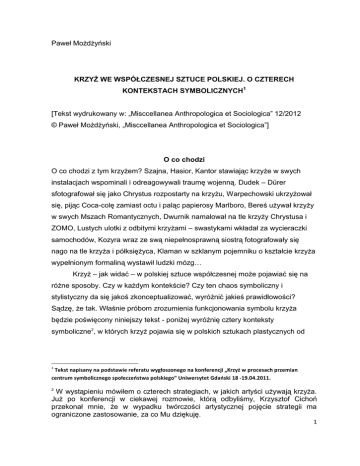 Paweł Możdżyński KRZYŻ WE WSPÓŁCZESNEJ SZTUCE POLSKIEJ. O CZTERECH KONTEKSTACH SYMBOLICZNYCH1 [Tekst wydrukowany w: „Misccellanea Anthropologica et Sociologica” 12/2012 © Paweł Możdżyński, „Misccellanea Anthropologica et Sociologica”] O co chodzi O co chodzi z tym krzyżem? Szajna, Hasior, Kantor stawiając krzyże w swych instalacjach wspominali i odreagowywali traumę wojenną. Dudek – Dürer sfotografował się jako Chrystus rozpostarty na krzyżu, Warpechowski ukrzyżował się, pijąc Coca-colę zamiast octu i paląc papierosy Marlboro, Bereś używał krzyży w swych Mszach Romantycznych, Dwurnik namalował na tle krzyży Chrystusa i ZOMO, Lustych ulotki z odbitymi krzyżami – swastykami wkładał za wycieraczki samochodów, Kozyra wraz ze swą niepełnosprawną siostrą fotografowały się nago na tle krzyża i półksiężyca, Klaman w szklanym pojemniku o kształcie krzyża wypełnionym formaliną wystawił ludzki mózg… Krzyż – jak widać – w polskiej sztuce współczesnej może pojawiać się na różne sposoby. Czy w każdym kontekście? Czy ten chaos symboliczny i stylistyczny da się jakoś zkonceptualizować, wyróżnić jakieś prawidłowości? Sądzę, że tak. Właśnie próbom zrozumienia funkcjonowania symbolu krzyża będzie poświęcony niniejszy tekst - poniżej wyróżnię cztery konteksty symboliczne2, w których krzyż pojawia się w polskich sztukach plastycznych od 1 Tekst napisany na podstawie referatu wygłoszonego na konferencji „Krzyż w procesach przemian centrum symbolicznego społeczeństwa polskiego” Uniwersytet Gdański 18 -19.04.2011. W wystąpieniu mówiłem o czterech strategiach, w jakich artyści używają krzyża. Już po konferencji w ciekawej rozmowie, którą odbyliśmy, Krzysztof Cichoń przekonał mnie, że w wypadku twórczości artystycznej pojęcie strategii ma ograniczone zastosowanie, za co Mu dziękuję. 2 1 1945 roku do dziś3. Zaznaczam, że interesować mnie będzie tu autonomiczne pole sztuk plastycznych w rozumieniu Pierre’a Bourdieu (Bourdieu 2001, Bourdieu 2005) – pozostawię poza moim zainteresowaniem dzieła spoza tego pola np. funkcjonujące w ramach sztuki naiwnej czy sakralnej (tworzonej na zamówienie organizacji religijnych). Nie będę też zapuszczać się na teren teatru czy kina, oczywiście mając świadomość nieklarowności (braku?) granic oddzielających poszczególne sztuki, zwłaszcza w przypadku nowych mediów, np. performansu czy też sztuki wideo. Nie opowiem też o wszystkich dziełach polskiego pola sztuki, w których występuje krzyż, byłoby to zresztą niemożliwe, odwołam się do wybranych obrazów, grafik czy performansów. Mam też świadomość, że opisywane niżej dzieła sztuki można zaliczyć do wielu kontekstów jednocześnie, a moje wybory będą dyskusyjne - zdaję sobie sprawę z tego, że moja propozycja uporządkowania materiału w postaci czterech kontekstów jest obciążona sporą dozą subiektywności. Nie będę stronił od dzielenia się swoimi własnymi interpretacjami dzieł, jak też cytowania rozumień innych (artystów, kuratorów, badaczy itd.), lecz nie roszczę sobie praw do interpretacji jedynej właściwej. Współczesne dzieło sztuki - jak dobrze pokazał Umberto Eco - jest „otwarte” na nieskończoną liczbę interpretacji (Eco 2008: 96). Moja jest jedną z wielu, chciałbym, żeby była traktowana jako zagajenie do interesującej dyskusji. Konteksty symboliczne, w których pojawia się krzyż Kontekst 1. Odreagowanie wojennej traumy, ekspresja doświadczenia absurdu Krzyż jako symbol zaczął pojawiać się w polskiej sztuce od początku badanego okresu – od 1945 roku. Służył on ukazaniu dramatu wojny, odreagowaniu jej, jak też był nośnikiem przeżycia absurdalności egzystencji. Oglądając reprodukcje dzieł zauważam wieloaspektowe podobieństwo w pracach Władysława Hasiora, Tadeusza Kantora i Józefa Szajny. Hasior w skrzynce umieszczonej na kołach wózka dziecinnego rozsypał ziemię, umieścił Nie będę rozważał funkcjonowania krzyża w malarstwie przedstawiającym, w którym motyw ten jest potraktowany jako zwykły element krajobrazu, gdyż analiza takich dzieł nie wniosła by wiele do prowadzonej dyskusji. 3 2 kilka krzyży i zapalonych świec (co przywołuje skojarzenia z cmentarzem), nad tym umieszczone jest pod kątem ostrym lustro (stanowiące wieko skrzynki), tak, że widz może krzyże widzieć też od tyłu i z góry („Dzieciom Zamojszczyzny”, 1974). Szajna w „Reminiscencjach” (1969) umieścił czarne krzyże, fragmenty drzew i słupów - widzę tu nawiązanie do obrazu obozu koncentracyjnego (por. Rottenberg 1995: 9). Kantor w instalacji z „Umarłej klasy”, posadził w szkolnej ławce obok stojącego krzyża kukłę chłopca. Na innym zdjęciu widać na czarno ubranego Kantora siedzącego na białym krześle pod białym krzyżem i na czarnym tle. Podobny nastrój - cisza, pustka, wzniosłość, patos. Estetyka kojarząca się ze śmiercią, pogrzebem, cmentarzem. Wspomnienie zmarłych. Żałoba. „Figura na przekątni” (1958) Jana Lebensteina wnosi coś innego – zgeometryzowana, wyabstrahowana stojąca postać, złożona z niezbyt równo wymalowanych figur, w różnych kolorach, o różnej fakturze, nałożona na przecinające się linie proste. Dodatkowo widać właśnie krzyż wpisany w głowę, twarz człowieka, który jest też częścią „niezależnego”, zgeometryzowanego pejzażu. Opowieść o ludzkim losie. Mam wrażenie, że „Nagrobki” z lat 50. Andrzeja Wróblewskiego mówią o podobnych sprawach. Są to krzyże, posiadające głowy i twarze, to zarazem uproszczone postaci z wyciągniętymi rękami. Mają do tego nazwy, na przykład „Nagrobek kobieciarza”, zgeometryzowane kobiece nogi stojące obok krzyża i geometryczne wzory na krzyżu, przywołujące eksperymenty z tym symbolem Kazimierza Malewicza, są jednak bardziej ekspresyjne. Co mówią te dziwne