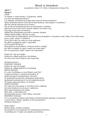Mord w katedrze na podstawie tekstu T.S. Eliota w tłumaczeniu Jerzego Sito AKT I Scena I CHóR Tu stańmy w cieniu katedry. Tu będziemy czekali. Czy kusi nas niebezpieczeństwo? Czy nadzieja schronienia przyciąga stopy nasze ku drzwiom katedry? Jakież niebezpieczeństwo może grozić nam biednym, nam ubogim z Canterbury? Jaki ból, którego dotychczas nie znamy? Nie ma dla nas niebezpieczeństwa ani schronienia w katedrze. Jakieś przeczucie aktu, który musimy obejrzeć na własne oczy, Przyciąga stopy nasze ku katedrze. Odkąd złoty październik przeszedł w chmurny listopad, Odkąd zebrano jabłka i złożono na zimę, a ziemia stała się archipelagiem ostrych brązowych punktów w bezmiarze wody i błota, Nowy Rok czeka, dyszy, czeka, szepce w ciemności. Nowy Rok czeka, los czeka na swoje spełnienie. Kto dłoń wyciągnął do ognia i wspomniał na Wszystkich Świętych, Wspomniał na męczenników i świętych, którzy czekają? Kto dłoń wyciągnie do ognia i zaprze się swego pana? Kto się ogrzeje przy ogniu i zaprze się swego pana? Siedem lat i lato już minęło, Siedem lat, odkąd opuścił nas Arcybiskup, On, który był zawsze łaskawy dla swego ludu. (Wchodzą Księża.) PIERWSZY KSIĄDZ Siedem lat i lato już minęło. Siedem lat, odkąd opuścił nas Arcybiskup. DRUGI KSIĄDZ Co czyni Arcybiskup, co czyni Papież, nasz Pan? Z upartym Królem i z Królem francuskim, W stałych intrygach, kombinacjach, zmowach, W spotkaniach ustalonych, spotkaniach niedoszłych, Spotkaniach niekończących się lub niedokończonych, W miejscu takim lub innym, we Francji? TRZECI KSIĄDZ Nie widzę nic sensownego w świeckiej sztuce rządzenia, Jak tylko dwulicowość, przemoc i nadużycia. Król rządzi lub baronowie rządzą: Silni silnie, a słabi kaprysem. Wyznają jedno prawo: wziąć władzę i utrzymać. PIERWSZY KSIĄDZ Czy to się skończy, dopiero gdy biedni za bramą Kościoła zapomną o przyjacielu, o swoim Ojcu w Bogu, zapomną, że był przyjacielem? (Wchodzi Posłaniec.) POSŁANIEC Służący Bogu, strażnicy świątyni, Przyszedłem was powiadomić bez niepotrzebnych frazesów: Arcybiskup jest w Anglii, jest opodal, pod miastem; 1 Zostałem wysłany tak spiesznie, jak było to możliwe, Aby was powiadomić o jego rychłym przybyciu, Abyście mogli go spotkać przygotowani. PIERWSZY KSIĄDZ Co, czy koniec wygnania? Czy Pan nasz, Arcybiskup, Pogodził się z Królem? Cóż to za pojednanie Dwóch dumnych ludzi? TRZECI KSIĄDZ Jakiż pokój wyrosnąć zdoła Między kowadłem i młotem? DRUGI KSIĄDZ Powiedz nam, Czy stary spór się zakończył? Czy padła ściana dumy, Która ich oddzielała? Pokój li to, czy wojna? PIERWSZY KSIĄDZ Czy przybywa tu z gwarancją bezpieczeństwa? POSŁANIEC Macie prawo wyrazić pewne niedowierzanie. Przybywa w dumie i żalu, podtrzymuje i nadal wszystkie swoje żądania, Pewien jest, niewątpliwie, miłości ludu, który go wita wszędzie z entuzjazmem szaleńców, PIERWSZY KSIĄDZ Raz jeszcze, wojna czy pokój? POSŁANIEC Pokój, lecz bez pocałunku. Jest rzeczą powszechnie znaną, że kiedy Arcybiskup Rozstawał się z Królem, powiedział: "Żegnam - powiedział - człowieka, Którego na tym świecie więcej już nie zobaczę". Zapewniam was, że to słyszałem z wiarygodnego źródła. Jest parę różnych wykładni, co mógł przez to rozumieć; Lecz nikt z tych słów nie wysnuwa szczęśliwych wniosków. (Wychodzi.) PIERWSZY KSIĄDZ Wiem, że duma zrodzona w nagłym wyniesieniu została utwierdzona w gorzkich przeciwnościach. Widziałem go jako Kanclerza, któremu schlebiał Król; Lubili go dworzanie lub bali się; na swój wyniosły sposób, Gardzący i pogardzany, zawsze samotny, niepewny siebie, nigdy nie był On jednym z nich. Dumę swą karmił zwykle bezspornymi cnotami, Jeśliby Król był większy albo gdyby był słabszy, Być może losy Tomasza byłyby inne. DRUGI KSIĄ.DZ A jednak Pan nasz powrócił. Nasz Pan znowu wrócił do swego. Cieszmy się zatem, mówię, cieszmy się i przyjmijmy go twarzą pełną radości, Jam sługa Arcybiskupa. Przyjmijmy Arcybiskupa radośnie. CHÓR Tomaszu, Arcybiskupie. Tomaszu, Panie nasz, zostaw nas, pozwól nam być - w naszych pokornych i brudnych żywotach, Zostaw nas, nie każ nam sprostać zagładzie domu, zagładzie Arcybiskupa, zagładzie świata. DRUGI KSIĄDZ Cóż za sposób mówienia i to w takiej chwili! Czy wiecie, że Arcybiskup lada moment przybędzie? (Wchodzi Tomasz.) Scena II TOMASZ Pokój. Pozwól im trwać w uniesieniu. Mówią lepiej, niż wiedzą; i więcej, niż rozumiesz. Bo wiedzą i nie wiedzą, co znaczy działać czy cierpieć, Bo wiedzą i nie wiedzą, że działać znaczy cierpieć, 2 A cierpieć znaczy działać. Ani działacz nie cierpi, ani cierpiący nie działa. DRUGI KSIĄDZ Panie mój, racz mi wybaczyć, że nie dostrzegłem ciebie Otulony jazgotem. Wybacz nam, Arcybiskupie, przyjęlibyśmy cię lepiej, Gdyby nas uprzedzono wcześniej o twoim przybyciu. Pokoje są w takim stanie, w jakim je zostawiłeś. TOMASZ I będę się starał zostawić je tak, jak znalazłem. Jestem wam bardziej niż wdzięczny za waszą dobroć i troskę. To błahe sprawy. Krótka chwila wytchnienia w Canterbury, Otoczonym zewsząd przez morze ruchliwych wrogów. Zbuntowani biskupi, York, Londyn, Salisbury, Przejęliby nasze listy, Nasłali do portu szpiegów, I polecili mnie spotkać tym, którzy nas nienawidzą. Świadomy, za łaską Boga, ich przewidywań, Moje listy wysłałem innego dnia, Miałem dobrą przeprawę, Zastałem w Sandwich Broca, Warenne'a, Szeryfa Kentu; Tych wszystkich, którzy przysięgli zabrać mi moją głowę. Powstrzymał ich Jan, Dziekan Salisbury, Ostrzegając przed zdradą, Na pewien czas mamy spokój. PIERWSZY KSIĄDZ Czy jadą w ślad za wami? TOMASZ Głodny sęp krąży jakiś czas wysoko, Koniec nasz będzie prosty i nagły, zesłany przez Boga. Tymczasem treścią naszych pierwszych czynów Będą cienie i walka z cieniami. Przerwa b