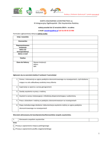 Redakcje „Problemów Społecznych” i portalu www.ops.pl KARTA ZGŁOSZENIA UCZESTNICTWA na III Integracyjny Ogólnopolski Zlot Asystentów Rodziny należy przesłać do 12 września 2014 r. na adres e-mail: [email protected] lub fax 85 65 25 906 Formularz zgłoszeniowy dotyczy jednej osoby Imię i nazwisko Stanowisko Reprezentowana instytucja Adres do korespondencji Adres e-mail Telefon Dane do faktury Nazwa instytucji: Adres: NIP: Zgłaszam się na warsztat (należy X wskazać 3 warsztaty): 1. Pomoc i interwencja w ujęciu podejścia skoncentrowanego na rozwiązaniach, czyli działania mające na celu odbudowę osobistej mocy klienta 2. Superwizja w oparciu o pracę genogramem 3. Zasoby asystenta w pracy z rodziną 4. Asystent w pracy motywującej z młodzieżą eksperymentującą i uzaleznioną 5. Praca z dzieckiem i rodziną w podejściu skoncentrowanym na rozwiązaniach 6. Etapy metodycznego działania i dokumentacja asystenta rodziny w ujęciu podejścia skoncentrowanego na rozwiązaniach Warsztat adresowany do koordynatorów/kierowników zespołu asystentów. 1. Kierowanie zespołem asystentów Inne: Proszę o zapewnienie miejsca parkingowego Proszę o zapewnienie posiłku wegetariańskiego 1 Redakcje „Problemów Społecznych” i portalu www.ops.pl Potwierdzam wpłatę kwoty na konto: Wyższa Szkoła Finansów i Zarządzania ul. Ciepła 40 15-472 Białystok NIP: 542-10-18-448 ING Bank Śląski o/Białystok 69105018231000002333781884 w kwocie i zgłaszam 130 zł za udział w konferencji ( w tym 2 noclegi, wyżywienie, udział w warsztatach, materiały i przerwy kawowe w dniach 25-27.09.2014) Lub 70 zł za udział w konferencji ( w tym wyżywienie – 3 obiady, 2 kolacje, udział w warsztatach, materiały i przerwy kawowe w dniach 25-27.09.2014) ……………………………. Miejscowość, data …………………………………… Podpis O udziale w konferencji decyduje kolejność zgłoszeń i wpłat. Liczba miejsc 110, w tym 60 noclegowych. Wpłata i zaznaczenie kwadratu przy kwocie 70 lub 130 zł gwarantuje lub nie nocleg! Kontakt do organizatora ( w razie pytań) : Stowarzyszenie DROGA ( Anna Tomulewicz, Emilia Dźwil) email:[email protected] Tel. 85 65 25 906 KARTĘ ZGŁOSZENIA UCZESTNICTWA należy przesłać do 12 września 2014 r. na adres e-mail: [email protected] lub fax 85 65 25 906 2