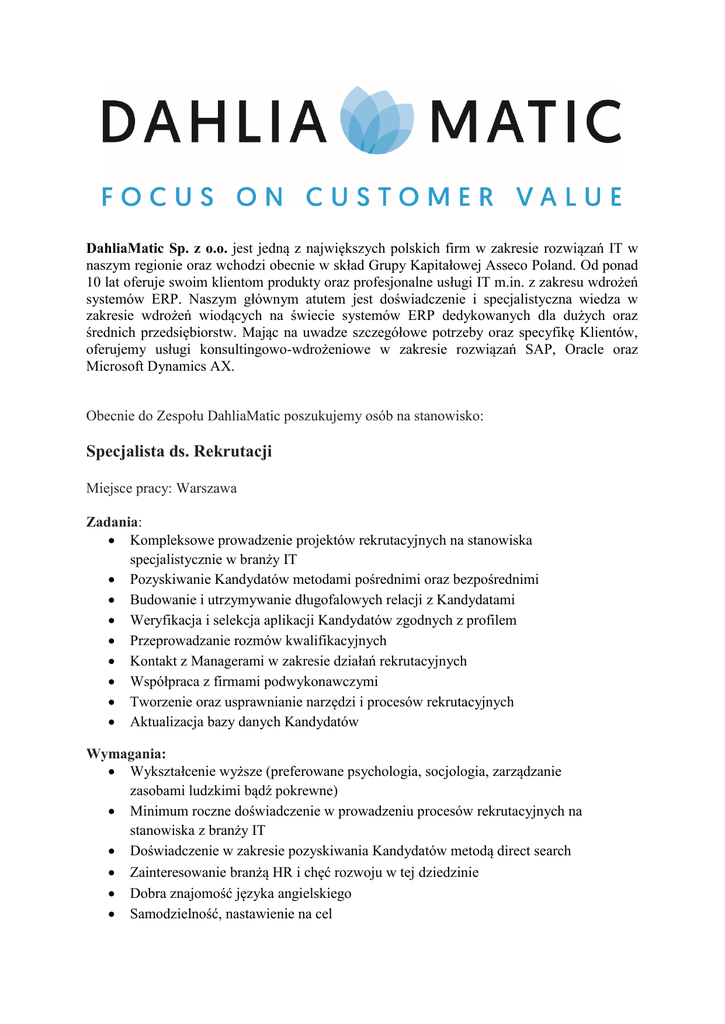 DahliaMatic Sp. z o.o. jest jedną z największych polskich firm w zakresie rozwiązań IT w naszym regionie oraz wchodzi obecnie w skład Grupy Kapitałowej Asseco Poland. Od ponad 10 lat oferuje swoim klientom produkty oraz profesjonalne usługi IT m.in. z zakresu wdrożeń systemów ERP. Naszym głównym atutem jest doświadczenie i specjalistyczna wiedza w zakresie wdrożeń wiodących na świecie systemów ERP dedykowanych dla dużych oraz średnich przedsiębiorstw. Mając na uwadze szczegółowe potrzeby oraz specyfikę Klientów, oferujemy usługi konsultingowo-wdrożeniowe w zakresie rozwiązań SAP, Oracle oraz Microsoft Dynamics AX. Obecnie do Zespołu DahliaMatic poszukujemy osób na stanowisko: Specjalista ds. Rekrutacji Miejsce pracy: Warszawa Zadania: Kompleksowe prowadzenie projektów rekrutacyjnych na stanowiska specjalistycznie w branży IT Pozyskiwanie Kandydatów metodami pośrednimi oraz bezpośrednimi Budowanie i utrzymywanie długofalowych relacji z Kandydatami Weryfikacja i selekcja aplikacji Kandydatów zgodnych z profilem Przeprowadzanie rozmów kwalifikacyjnych Kontakt z Managerami w zakresie działań rekrutacyjnych Współpraca z firmami podwykonawczymi Tworzenie oraz usprawnianie narzędzi i procesów rekrutacyjnych Aktualizacja bazy danych Kandydatów Wymagania: Wykształcenie wyższe (preferowane psychologia, socjologia, zarządzanie zasobami ludzkimi bądź pokrewne) Minimum roczne doświadczenie w prowadzeniu procesów rekrutacyjnych na stanowiska z branży IT Doświadczenie w zakresie pozyskiwania Kandydatów metodą direct search Zainteresowanie branżą HR i chęć rozwoju w tej dziedzinie Dobra znajomość języka angielskiego Samodzielność, nastawienie na cel Umiejętność pracy zespołowej Oferujemy: Atrakcyjne warunki zatrudnienia Opiekę medyczną Kartę Multisport Możliwość rozwoju zawodowego Pracę w firmie o ugruntowanej pozycji na rynku Osoby zainteresowane prosimy o przesłanie aplikacji na adres: [email protected] Prosimy o dołączenie do aplikacji klauzuli o następującej treści: \"Wyrażam zgodę na przetwarzanie moich danych osobowych przez DahliaMatic Sp. z o. o. z siedzibą w Warszawie przy ul. Gottlieba Daimlera 2, dla potrzeb niezbędnych do realizacji procesu niniejszej rekrutacji oraz wszystkich przyszłych rekrutacji zgodnych z moim profilem zawodowym, zgodnie z Ustawą z dn. 29.08.1997 o Ochronie Danych Osobowych (tekst jednolity: Dz.U. z 2014r., poz.1182 ze zm.).\"
