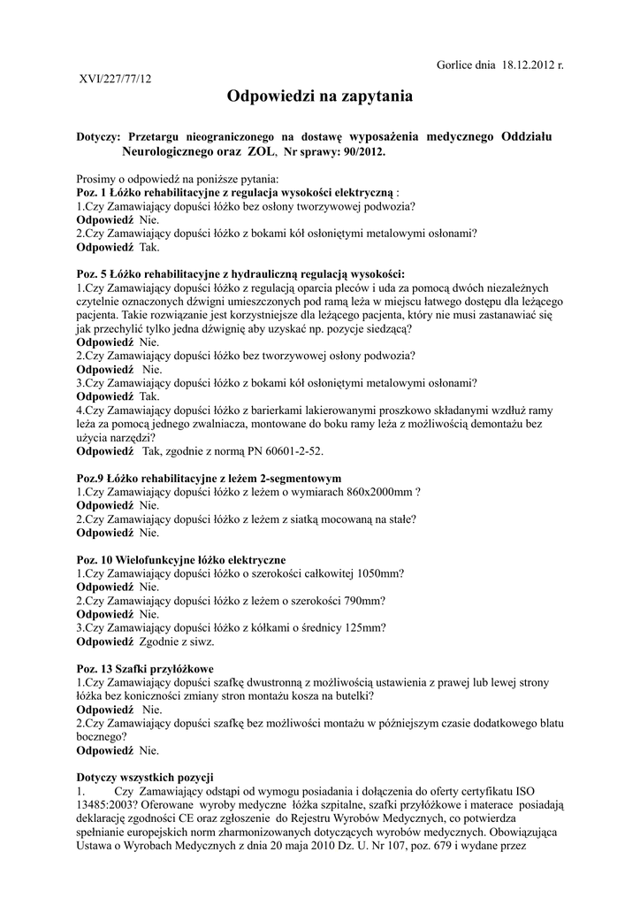Gorlice dnia 18.12.2012 r. XVI/227/77/12 Odpowiedzi na zapytania Dotyczy: Przetargu nieograniczonego na dostawę wyposażenia medycznego Oddziału Neurologicznego oraz ZOL, Nr sprawy: 90/2012. Prosimy o odpowiedź na poniższe pytania: Poz. 1 Łóżko rehabilitacyjne z regulacja wysokości elektryczną : 1.Czy Zamawiający dopuści łóżko bez osłony tworzywowej podwozia? Odpowiedź Nie. 2.Czy Zamawiający dopuści łóżko z bokami kół osłoniętymi metalowymi osłonami? Odpowiedź Tak. Poz. 5 Łóżko rehabilitacyjne z hydrauliczną regulacją wysokości: 1.Czy Zamawiający dopuści łóżko z regulacją oparcia pleców i uda za pomocą dwóch niezależnych czytelnie oznaczonych dźwigni umieszczonych pod ramą leża w miejscu łatwego dostępu dla leżącego pacjenta. Takie rozwiązanie jest korzystniejsze dla leżącego pacjenta, który nie musi zastanawiać się jak przechylić tylko jedna dźwignię aby uzyskać np. pozycje siedzącą? Odpowiedź Nie. 2.Czy Zamawiający dopuści łóżko bez tworzywowej osłony podwozia? Odpowiedź Nie. 3.Czy Zamawiający dopuści łóżko z bokami kół osłoniętymi metalowymi osłonami? Odpowiedź Tak. 4.Czy Zamawiający dopuści łóżko z barierkami lakierowanymi proszkowo składanymi wzdłuż ramy leża za pomocą jednego zwalniacza, montowane do boku ramy leża z możliwością demontażu bez użycia narzędzi? Odpowiedź Tak, zgodnie z normą PN 60601-2-52. Poz.9 Łóżko rehabilitacyjne z leżem 2-segmentowym 1.Czy Zamawiający dopuści łóżko z leżem o wymiarach 860x2000mm ? Odpowiedź Nie. 2.Czy Zamawiający dopuści łóżko z leżem z siatką mocowaną na stałe? Odpowiedź Nie. Poz. 10 Wielofunkcyjne łóżko elektryczne 1.Czy Zamawiający dopuści łóżko o szerokości całkowitej 1050mm? Odpowiedź Nie. 2.Czy Zamawiający dopuści łóżko z leżem o szerokości 790mm? Odpowiedź Nie. 3.Czy Zamawiający dopuści łóżko z kółkami o średnicy 125mm? Odpowiedź Zgodnie z siwz. Poz. 13 Szafki przyłóżkowe 1.Czy Zamawiający dopuści szafkę dwustronną z możliwością ustawienia z prawej lub lewej strony łóżka bez koniczności zmiany stron montażu kosza na butelki? Odpowiedź Nie. 2.Czy Zamawiający dopuści szafkę bez możliwości montażu w późniejszym czasie dodatkowego blatu bocznego? Odpowiedź Nie. Dotyczy wszystkich pozycji 1. Czy Zamawiający odstąpi od wymogu posiadania i dołączenia do oferty certyfikatu ISO 13485:2003? Oferowane wyroby medyczne łóżka szpitalne, szafki przyłóżkowe i materace posiadają deklarację zgodności CE oraz zgłoszenie do Rejestru Wyrobów Medycznych, co potwierdza spełnianie europejskich norm zharmonizowanych dotyczących wyrobów medycznych. Obowiązująca Ustawa o Wyrobach Medycznych z dnia 20 maja 2010 Dz. U. Nr 107, poz. 679 i wydane przez Ministra Zdrowia związane z nią Rozporządzenia nie nakłada na Wytwórców produkujących wyroby medyczne klasy I obowiązku posiadania przez wytwórców w/w certyfikatu. Odpowiedź. Nie. 2.Czy Zamawiający przychyli się do prośby i wydzieli do odrębnego pakietu pozycję 14 wózek transportowo-kąpielowy? Odpowiedź Nie - nie przewidujemy podziału zamówiena na drobne zadania. Dotyczy Wózek transportowo -kąpielowy: 1.Czy Zamawiający dopuści wózek transportowo-kąpielowy z możliwością wzdłużnego przemieszczania w poziomie co jest rozwiązaniem lepszym? Odpowiedź Tak. 2.Czy Zamawiający dopuści wózek transportowo -kąpielowy bez możliwości zdjęcia niecki wanny? W oferowanym wózku istnieje możliwości transportu pacjenta wewnątrz wanny Odpowiedź Nie. Dotyczy : parawanu 1.Czy Zamawiający dopuści parawan o wysokości 1850mm? Odpowiedź Tak. DYREKTOR Szpitala Specjalistycznego im. H. Klimontowicza w Gorlicach mgr inż. Marian Świerz