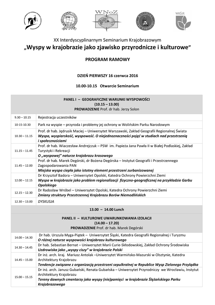 XX Interdyscyplinarnym Seminarium Krajobrazowym „Wyspy w krajobrazie jako zjawisko przyrodnicze i kulturowe” PROGRAM RAMOWY DZIEŃ PIERWSZY 16 czerwca 2016 10.00-10.15 Otwarcie Seminarium PANEL I – GEOGRAFICZNE WARUNKI WYSPOWOŚCI (10.15 – 13.00) PROWADZENIE Prof. dr hab. Jerzy Solon 9.30 – 10.15 Rejestracja uczestników 10-15-10.30 Park na wyspie – przyroda i problemy jej ochrony w Wolińskim Parku Narodowym 10.30 – 11.15 11.15 – 11.45 11.45 – 12.00 12.00 – 12.15 12.15 – 12.30 12.30 – 13.00 Prof. dr hab. Jędrusik Maciej – Uniwersytet Warszawski, Zakład Geografii Regionalnej Świata Wyspa, wyspiarskość, wyspowość. O niejednoznaczności pojęć w studiach nad przestrzenią i społecznościami Prof. dr hab. Wiaczesław Andrejczuk – PSW im. Papieża Jana Pawła II w Białej Podlaskiej, Zakład Turystyki i Rekreacji O „wyspowej” naturze krajobrazu krasowego Prof. dr hab. Marek Degórski, dr Bożena Degórska – Instytut Geografii i Przestrzennego Zagospodarowania PAN Miejska wyspa ciepła jako istotny element przestrzeni zurbanizowanej Dr Krzysztof Badora – Uniwersytet Opolski, Katedra Ochrony Powierzchni Ziemi Wyspa w krajobrazie jako problem regionalizacji fizyczno-geograficznej na przykładzie Garbu Opolskiego Dr Radosław Wróbel – Uniwersytet Opolski, Katedra Ochrony Powierzchni Ziemi Zmiany struktury Przestrzennej Krajobrazu Borów Niemodlińskich DYSKUSJA 13.00 – 14.00 Lunch PANEL II – KULTUROWE UWARUNKOWANIA IZOLACJI (14.00 – 17.20) PROWADZENIE Prof. dr hab. Marek Degórski 14.00 – 14.30 14.30 – 14.45 14.45 – 15.00 15.00 – 15.15 Dr hab. Urszula Myga-Piątek – Uniwersytet Śląski, Katedra Geografii Regionalnej i Turyzmu O różnej naturze wyspowości krajobrazu kulturowego Dr hab. Sebastian Bernat – Uniwersytet Marii Curie-Skłodowskiej, Zakład Ochrony Środowiska Uzdrowiska jako „wyspy ciszy” w krajobrazie Polski Dr inż. arch. kraj. Mariusz Antolak –Uniwersytet Warmińsko-Mazurski w Olsztynie, Katedra Architektury Krajobrazu Tendencje związane z organizacją przestrzeni sepulkralnej w Republice Wysp Zielonego Przylądka Dr inż. arch. Janusz Gubański, Renata Gubańska – Uniwersytet Przyrodniczy we Wrocławiu, Instytut Architektury Krajobrazu Tereny dawnych cmentarzy jako wyspy (nie)pamięci w krajobrazie Ślężańskiego Parku Krajobrazowego 15.15 – 15.30 15.30 – 15.45 15.45 – 16.00 16.00 – 16.15 Agnieszka Jaszczak – Uniwersytet Warmińsko-Mazurski w Olsztynie, Katedra Architektury Krajobrazu Izolacja w krajobrazie Cypru – między ,,turystycznym rajem’’, a utraconym dziedzictwem Dr hab. prof. IGiPZ PAN Joanna Plit – Komisja Krajobrazu Kulturowego PTG i Prof. dr hab. Florian Plit – Uniwersytet im. J. Kochanowskiego w Kielcach, Instytut Geografii Problem wysp w regionalizacji kulturowej Dr hab. Michał Kupiec – Zachodniopomorski Uniwersytet Technologiczny w Szczecinie, Katedra Ekologii, Ochrony i Kształtowania Środowiska Krajobraz kulturowy Wyspy Chrząszczewskiej Dr Małgorzata Strzyż – Uniwersytet Jana Kochanowskiego w Kielcach, Instytut Geografii Święty krzyż, wyspa przyrodniczo-kulturowa 16.15 – 16.45 Przerwa PANEL III – SPOJRZENIE ARCHITEKTONICZNO-KRAJOBRAZOWE NA ZAJWISKA WSYPOWOŚCI (16.45 – 19.40) PROWADZENIE dr hab. Paweł Pieńkowski 16.45 – 17.00 17.00 – 17.15 17.15 – 17.30 17.30 – 17.45 17.45 – 18.00 18.00 – 18.15 WPROWADZENIE dr hab. Anna Kiepas-Kokot – Zachodniopomorski Uniwersytet Technologiczny w Szczecinie, Wydział Kształtowania Środowiska i Rolnictwa, Katedra Ekologii, Ochrony i Kształtowania Środowiska Osiedla grodzone w przestrzeni Szczecina jako przykład izolacji przestrzennej i społecznej Dr inż. arch. Monika Adamska – Politechnika Opolska, Wydział Budownictwa i Architektury Odrzańskie wyspy Opola – wyspa Bolko i wyspa Pasieka Dr inż. arch. Jacek Burdziński, dr inż. arch. Janusz Gubański – Uniwersytet Przyrodniczy we Wrocławiu, Instytut Architektury Krajobrazu Kępa mieszczańska we Wrocławiu – integracja formalnej i funkcjonalnej wyspy z miejską przestrzenią publiczną Dr inż. arch. Michał Uruszczak – Uniwersytet Rolniczy w Krakowie, Katedra Gospodarki Przestrzennej i Architektury Krajobrazu Wyspy obronne Jury Krakowsko-Częstochowskiej i ich turystyczne znaczenie dr inż. arch. Radomir Nowakowski – Uniwersytet Technologiczno – Przyrodniczy w Bydgoszczy , Katedra Urbanistyki i Planowania Przestrzennego Wyspowość jako walor turystyczny na przykładzie Gotlandii 18.15 Podsumowanie I dnia konferencji 18.30 Przejazd na Białą Górę 19.00 Uroczysta kolacja DZIEŃ DRUGI 17 czerwca 2016 8.00 – 8.45 9.00 – 9.30 9.30 – 9.45 9.45 – 10.00 10.00 – 10.30 PANEL I – EKOLOGICZNE PROCESY POWSTAWANIA EFEKTÓW WYSP (9.00 – 12.00) PROWADZENIE Prof. dr hab. Joanna Plit Śniadanie Prof. dr hab. Jerzy Solon – Instytut Geografii i Przestrzennego Zagospodarowania PAN Możliwości określania stopnia izolacji płatów na podstawie analizy mapy pokrycia terenu Dr hab. inż. Paweł Pieńkowski, dr hab. Marek Podlasiński – Zachodniopomorski Uniwersytet Technologiczny w Szczecinie, Katedra Ekologii, Ochrony i Kształtowania Środowiska W poszukiwaniu metod wyznaczania izolowanych wysp krajobrazowych Dr inż. arch. kraj. Mariusz Antolak – Uniwersytet Warmińsko-Mazurski w Olsztynie, Katedra Architektury Krajobrazu Jak stworzyć wyspę różnorodności biologicznej w zabytkowym parku? Analiza przypadku parku w Mortęgach DYSKUSJA 10.30 – 11.00 Przerwa na kawę 11.00 – 12.00 Sesja posterowa Dr inż. arch. kraj. Mariusz Antolak – Uniwersytet Warmińsko-Mazurski w Olsztynie, Katedra Architektury Krajobrazu Współczesne trendy związane z kształtowaniem otoczenia zabudowy mieszkaniowej na Bornholmie i archipelagu wysp Ertholmene Cmentarze Republiki Wysp Zielonego Przylądka – aspekt krajobrazowy Dr Małgorzata Strzyż – Uniwersytet Jana Kochanowskiego w Kielcach, Instytut Geografii Wyspy w krajobrazie Świę