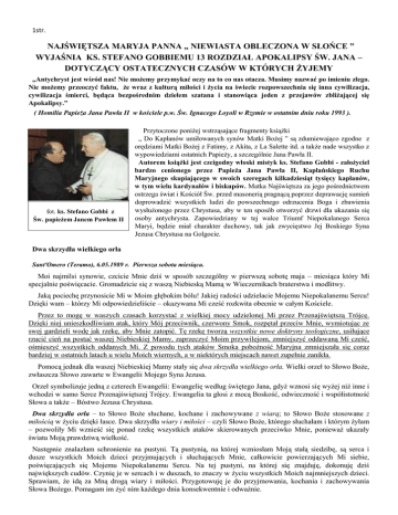 1str. NAJŚWIĘTSZA MARYJA PANNA „ NIEWIASTA OBLECZONA W SŁOŃCE ” WYJAŚNIA KS. STEFANO GOBBIEMU 13 ROZDZIAŁ APOKALIPSY ŚW. JANA – DOTYCZĄCY OSTATECZNYCH CZASÓW W KTÓRYCH ŻYJEMY „Antychryst jest wśród nas! Nie możemy przymykać oczy na to co nas otacza. Musimy nazwać po imieniu złego. Nie możemy przeoczyć faktu, że wraz z kulturą miłości i życia na świecie rozpowszechnia się inna cywilizacja, cywilizacja śmierci, będąca bezpośrednim dziełem szatana i stanowiąca jeden z przejawów zbliżającej się Apokalipsy.” ( Homilia Papieża Jana Pawła II w kościele p.w. Św. Ignacego Loyoli w Rzymie w ostatnim dniu roku 1993 ). fot. ks. Stefano Gobbi z Św. papieżem Janem Pawłem II Przytoczone poniżej wstrząsające fragmenty książki „ Do Kapłanów umiłowanych synów Matki Bożej ” są zdumiewająco zgodne z orędziami Matki Bożej z Fatimy, z Akita, z La Salette itd. a także nade wszystko z wypowiedziami ostatnich Papieży, a szczególnie Jana Pawła II. Autorem książki jest czcigodny włoski mistyk ks. Stefano Gobbi - założyciel bardzo cenionego przez Papieża Jana Pawła II, Kapłańskiego Ruchu Maryjnego skupiającego w swoich szeregach kilkadziesiąt tysięcy kapłanów, w tym wielu kardynałów i biskupów. Matka Najświętsza za jego pośrednictwem ostrzega świat i Kościół Św. przed masonerią pragnącą poprzez deprawację sumień doprowadzić wszystkich ludzi do powszechnego odrzucenia Boga i zbawienia wysłużonego przez Chrystusa, aby w ten sposób otworzyć drzwi dla ukazania się osoby antychrysta. Zapowiedziany w tej walce Triumf Niepokalanego Serca Maryi, będzie miał charakter duchowy, tak jak zwycięstwo Jej Boskiego Syna Jezusa Chrystusa na Golgocie. Dwa skrzydła wielkiego orła Sant'Omero (Teramo), 6.05.1989 r. Pierwsza sobota miesiąca. Moi najmilsi synowie, czcicie Mnie dziś w sposób szczególny w pierwszą sobotę maja – miesiąca który Mi specjalnie poświęcacie. Gromadzicie się z waszą Niebieską Mamą w Wieczernikach braterstwa i modlitwy. Jaką pociechę przynosicie Mi w Moim głębokim bólu! Jakiej radości udzielacie Mojemu Niepokalanemu Sercu! Dzięki wam – którzy Mi odpowiedzieliście – okazywana Mi cześć rozkwita obecnie w całym Kościele. Przez to mogę w waszych czasach korzystać z wielkiej mocy udzielonej Mi przez Przenajświętszą Trójcę. Dzięki niej unieszkodliwiam atak, który Mój przeciwnik, czerwony Smok, rozpętał przeciw Mnie, wymiotując ze swej gardzieli wodę jak rzekę, aby Mnie zatopić. Tę rzekę tworzą wszystkie nowe doktryny teologiczne, usiłujące rzucić cień na postać waszej Niebieskiej Mamy, zaprzeczyć Moim przywilejom, zmniejszyć oddawaną Mi cześć, ośmieszyć wszystkich oddanych Mi. Z powodu tych ataków Smoka pobożność Maryjna zmniejszała się coraz bardziej w ostatnich latach u wielu Moich wiernych, a w niektórych miejscach nawet zupełnie zanikła. Pomocą jednak dla waszej Niebieskiej Mamy stały się dwa skrzydła wielkiego orła. Wielki orzeł to Słowo Boże, zwłaszcza Słowo zawarte w Ewangelii Mojego Syna Jezusa. Orzeł symbolizuje jedną z czterech Ewangelii: Ewangelię według świętego Jana, gdyż wznosi się wyżej niż inne i wchodzi w samo Serce Przenajświętszej Trójcy. Ewangelia ta głosi z mocą Boskość, odwieczność i współistotność Słowa a także – Bóstwo Jezusa Chrystusa. Dwa skrzydła orła – to Słowo Boże słuchane, kochane i zachowywane z wiarą; to Słowo Boże stosowane z miłością w życiu dzięki łasce. Dwa skrzydła wiary i miłości – czyli Słowo Boże, którego słuchałam i którym żyłam – pozwoliły Mi wznieść się ponad rzekę wszystkich ataków skierowanych przeciwko Mnie, ponieważ ukazały światu Moją prawdziwą wielkość. Następnie znalazłam schronienie na pustyni. Tą pustynią, na której wzniosłam Moją stałą siedzibę, są serca i dusze wszystkich Moich dzieci przyjmujących i słuchających Mnie, całkowicie powierzających Mi siebie, poświęcających się Mojemu Niepokalanemu Sercu. Na tej pustyni, na której się znajduję, dokonuję dziś największych cudów. Czynię je w sercach i w duszach, to znaczy w życiu wszystkich Moich najmniejszych dzieci. Sprawiam, że idą za Mną drogą wiary i miłości. Przygotowuję je do przyjmowania, kochania i zachowywania Słowa Bożego. Pomagam im żyć nim każdego dnia konsekwentnie i odważnie. 2 str. W ciszy i ukryciu – to znaczy na pustyni, na której się znajduję – działam z mocą, aby poświęceni Mi synowie wierzyli dziś w Ewangelię, pozwalali się prowadzić jedynie Mądrości Ewangelii i byli zawsze żywą Ewangelią. Przez Mój Kapłański Ruch Maryjny uformowałam we wszystkich częściach świata Mój zastęp. Jego zadanie polega na tym, by pozwolić się przenieść ze Mną na skrzydłach wielkiego orła, to znaczy na skrzydłach wiary i miłości, przyjmując w waszych czasach Słowo Boże z miłością i żyjąc tylko Nim. Wielkie cuda – jakich dokonuję dziś na pustyni, na której się znajduję – polegają na takiej zupełnej przemianie życia Moich małych dzieci, by stały się odważnymi świadkami wiary i przykładami jaśniejącymi świętością. W ten sposób każdego dnia w ciszy i ukryciu przygotowuję Moje wielkie zwycięstwo nad Smokiem – przez tryumf Mojego Niepokalanego serca w świecie. Ogromny czerwony Smok Sanktuarium w Tindari (Sycylia), 14.05.1989 r. Uroczystość Zesłania Ducha Świętego . Najmilsi synowie, adorujecie dziś i wzywacie Ducha Świętego, który zstąpił w dniu Pięćdziesiątnicy na Apostołów i uczniów zjednoczonych ze Mną w Jerozolimskim Wieczerniku. Wzywacie Go obecnie z ufnością i wytrwałością, zjednoczeni ze Mną w Wieczernikach modlitwy, które rozszerzyły się już we wszystkich częściach świata. Za pośrednictwem Mego Kapłańskiego Ruchu Maryjnego zapraszam dziś wszystkie dzieci Kościoła do zgromadzenia się w stałym wieczernik