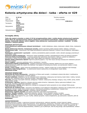 [email protected] Kolonia artystyczna dla dzieci - Łeba - oferta nr 429 Wiek 6-10 lat Ilość dni 10 Miejscowość Łeba Tematyka Obozy artystyczne Wyżywienie pełne wyżywienie Terminy wyjazdu: Cena za osobę 1390.00 zł Ośrodek Zakwaterowanie kolonijny w Łebie Szczegóły oferty Tylko dla małych artystów w wieku 6-10 lat przygotowaliśmy obóz z wielką dawką artystycznych popisów. Mamy Wam do zaproponowania zabawy plastyczne przeróżnymi technikami, robienie krasnoludkowych domów, malowanie rękami, szkice węglem, masy plastyczne, wykonywanie makiety i mydełek - to tylko niektóre z naszych planów! PROGRAM ARTYSTYCZNY Prace plastyczne wykonywane różnymi technikami - kredki (ołówkowe, olejne, świecowe), ołówki, farby, malowanie woskiem. Nauka dobierania kolorów, kompozycji rysunku, sztuka wyrażania siebie poprzez dzieło. Zabawy z kolorami. Plastelinowe ludki - towarzyszyć nam będą samodzielnie wykonane Plastusie z różnych mas do lepienia, zwierzątka i ufoludki. Wyklejanki, wydzieranki i wycinanki - zrobimy samodzielnie piękne serwetki, ramki, obrazki używając przeróżnych materiałów i kleju. Kamienny pejzaż artystyczny - stworzymy razem przepiękny skalnik z pomalowanych przez nas polnych kamieni! Kolorowe domy krasnoludków - z pomocą opiekunów wykonamy duże domki z tektury, a potem je ozdobimy i pomalujemy. Każdy krasnal będzie mógł zrobić sobie zdjęcie we własnym, kolorowym domu! Wielkie dzieło malowania rękami! Ogromna płachta papieru i my! Oto nasze wariacje artystyczne malowane palcami, bez użycia pędzli! Szkice węglem - poznamy podstawy szkicu, karykatury i rysunku. Wykonanie makiety przestrzennej - wspólnie wykonamy ogromną makietę, będzie przy tym dużo zabawy i odpowiedzialnych zadań dla małych architektów! Czy będzie to fantastyczna kraina, czy wymarzone miasto, a może Planeta Kosmitów? Anioły z masy solnej - każdy może być prawdziwym artystą - ulepimy anioły lub co tylko podpowie nam fantazja. Specjalna sesja fotograficzna - na zakończenie kolonii uwiecznimy na fotografiach nasze dzieła. Malowanie kredą. PROGRAM REKREACYJNY Wycieczka do Parku Dinozaurów - największy w Polsce park jurajski, z mnóstwem atrakcji dla dzieci i możliwością rozmaitych zajęć edukacyjnych w formie zabawy. Wioska Indiańska. Wejdziemy też do ciekawej wioski indiańskiej i zobaczymy tam barwny świat Indian. Czółna, hamaki, namioty tipi, indiańskie tańce i poznanie strojów i zwyczajów Indian. Mini Zoo, poznanie zwyczajów zwierząt, pielęgnacji i hodowli. Zobaczymy antylopy, kangury, kozy, króliki, sarnę, świnki wietnamskie, osiołki. Grillowanie i ogniska. Spędzimy ciekawe wieczory pełne śmiechu i śpiewania. Zjemy upieczone kiełbaski i inne przysmaki. Poznamy ogniskowe opowieści i piosenki. Rajd terenowy z fabułą. Jakie tajemnice czekają na rozwiązanie? Jakie wyzwania na nas czekają? Która grupa najsprytniej dotrze do celu? Wycieczka do stadniny koni - nauczymy się podstaw o tych pięknych zwierzętach, dowiemy się co jedzą konie, jak się je pielęgnuje, trenuje, czego można konia nauczyć. Interaktywna prelekcja o jeździectwie i hodowli koni. Zwiedzanie Łeby, wizyta w porcie , możliwość zakupu pamiątek. Plażowanie i kąpiele morskie pod opieką ratownika i pod okiem wychowawców. Konkurs "Rzeźba z piasku". Budowanie pałaców, twierdz i innych budowli z piasku na plaży. Wieczór karaoke. Prawdziwy show - poczuj się jak gwiazda - na poważnie i na wesoło, solo i w zespole. Zabawy i gry. Przeciąganie liny, gry w piłkę, zabawy grupowe, nauka żonglowania, gry planszowe, skakanki, piłki do skakania, badminton. Dyskoteka. ZAKWATEROWANIE Ośrodek kolonijny w Łebie, z ogromnym terenem rekreacyjnym, pięknym ogrodem, dużymi placami zabaw, wielofunkcyjnymi boiskami, chatą do grillowania. Teren ogrodzony, bezpieczny. Przytulne, ładne pokoje 2-6-osobowe z łazienkami, standard bardzo dobry. Pomieszczenia urządzone specjalnie dla dzieci, kolorowo, czysto i przyjemnie. W obiekcie jest sklepik, internet bezprzewodowy, świetlica, gra w piłkarzyki, stół do ping ponga, sala dyskotekowa. Zobacz stronę obiektu WYŻYWIENIE Wyżywienie 3 razy dziennie plus podwieczorki, bardzo dobra kuchnia, posiłki przygotowywane z myślą o dzieciach, smaczne, możliwość diety wegetariańskiej (proszę zaznaczyć w karcie dziecka). Śniadanie, obiad, podwieczorek, kolacja, napoje do każdego posiłku, prowiant i picie na drogę powrotną dla dzieci korzystających z dojazdu kolonijnego. Pierwszym posiłkiem jest kolacja w dniu przyjazdu, ostatnim posiłkiem jest śniadanie w dniu wyjazdu. Miedzy posiłkami i wieczorem dzieci mają dostęp do wody do picia (można zabrać swój plastikowy kubeczek czy bidon). CENA ZAWIERA Zakwaterowanie (10 noclegów), wyżywienie, wszystkie wstępy do odwiedzanych obiektów, realizację programu artystycznego i rekreacyjnego, opiekę wychowawców, ratowników oraz całodobową opiekę lekarską, ubezpieczenie NNW do kwoty 10 000 zł. WEŹ ZE SOBĄ Strój do kąpieli, 2-3 ręczniki, klapki, sandały, wygodne buty sportowe (1-2 pary), ciepły sweter i kurtkę, dres, 3 pary spodni, 4 bluzy, koszulki, bieliznę, skarpetki, przybory toaletowe, piżamę, czapkę od słońca, krem z filtrem, poprawnie wypełnioną kartę kolonijną, legitymację szkolną, kieszonkowe na drobne wydatki (sugerujemy ok. 50 zł). Informacje dla Rodziców Dopilnujemy Waszych Smyków, by czuły się dobrze i aby niczego im nie brakowało. Zapewniamy całodobową opiekę i maksymalne bezpieczeństwo podczas wszystkich zajęć. Dbamy o dobry humor wszystkich uczestników. Nasi instruktorzy i wychowawcy są przeszkoleni do pracy z dziećmi, doświadczeni, a praca jest dla nich pasją. Na naszych obozach dzieci nie mają czasu na tęsknotę i nudę! Uczestnicy mogą mieć na obozach telefony komórkowe i dzwonić codziennie do rodziców, jednak na czas zajęć telefony zostawiamy :) Rodzice na życzeni