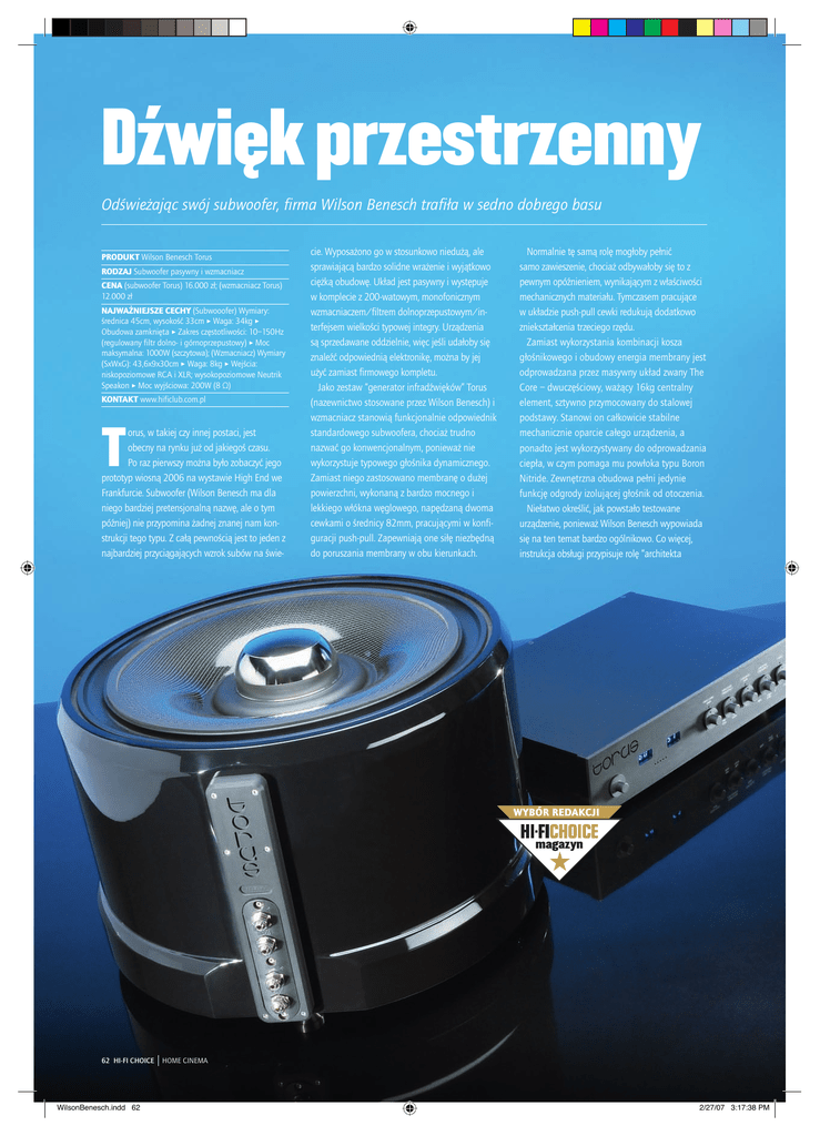 Dźwięk przestrzenny Odświeżając swój subwoofer, firma Wilson Benesch trafiła w sedno dobrego basu PRODUKT Wilson Benesch Torus RODZAJ Subwoofer pasywny i wzmacniacz CENA (subwoofer Torus) 16.000 zł; (wzmacniacz Torus) 12.000 zł NAJWAŻNIEJSZE CECHY (Subwooofer) Wymiary: średnica 45cm, wysokość 33cm > Waga: 34kg > Obudowa zamknięta > Zakres częstotliwości: 10–150Hz (regulowany filtr dolno- i górnoprzepustowy) > Moc maksymalna: 1000W (szczytowa); (Wzmacniacz) Wymiary (SxWxG): 43,6x9x30cm > Waga: 8kg > Wejścia: niskopoziomowe RCA i XLR; wysokopoziomowe Neutrik Speakon > Moc wyjściowa: 200W (8 Ω) KONTAKT www.hificlub.com.pl T orus, w takiej czy innej postaci, jest obecny na rynku już od jakiegoś czasu. Po raz pierwszy można było zobaczyć jego prototyp wiosną 2006 na wystawie High End we Frankfurcie. Subwoofer (Wilson Benesch ma dla niego bardziej pretensjonalną nazwę, ale o tym później) nie przypomina żadnej znanej nam konstrukcji tego typu. Z całą pewnością jest to jeden z najbardziej przyciągających wzrok subów na świe- cie. Wyposażono go w stosunkowo niedużą, ale sprawiającą bardzo solidne wrażenie i wyjątkowo ciężką obudowę. Układ jest pasywny i występuje w komplecie z 200-watowym, monofonicznym wzmacniaczem/filtrem dolnoprzepustowym/interfejsem wielkości typowej integry. Urządzenia są sprzedawane oddzielnie, więc jeśli udałoby się znaleźć odpowiednią elektronikę, można by jej użyć zamiast firmowego kompletu. Jako zestaw “generator infradźwięków” Torus (nazewnictwo stosowane przez Wilson Benesch) i wzmacniacz stanowią funkcjonalnie odpowiednik standardowego subwoofera, chociaż trudno nazwać go konwencjonalnym, ponieważ nie wykorzystuje typowego głośnika dynamicznego. Zamiast niego zastosowano membranę o dużej powierzchni, wykonaną z bardzo mocnego i lekkiego włókna węglowego, napędzaną dwoma cewkami o średnicy 82mm, pracującymi w konfiguracji push-pull. Zapewniają one siłę niezbędną do poruszania membrany w obu kierunkach. Normalnie tę samą rolę mogłoby pełnić samo zawieszenie, chociaż odbywałoby się to z pewnym opóźnieniem, wynikającym z właściwości mechanicznych materiału. Tymczasem pracujące w układzie push-pull cewki redukują dodatkowo zniekształcenia trzeciego rzędu. Zamiast wykorzystania kombinacji kosza głośnikowego i obudowy energia membrany jest odprowadzana przez masywny układ zwany The Core – dwuczęściowy, ważący 16kg centralny element, sztywno przymocowany do stalowej podstawy. Stanowi on całkowicie stabilne mechanicznie oparcie całego urządzenia, a ponadto jest wykorzystywany do odprowadzania ciepła, w czym pomaga mu powłoka typu Boron Nitride. Zewnętrzna obudowa pełni jedynie funkcję odgrody izolującej głośnik od otoczenia. Niełatwo określić, jak powstało testowane urządzenie, ponieważ Wilson Benesch wypowiada się na ten temat bardzo ogólnikowo. Co więcej, instrukcja obsługi przypisuje rolę “architekta WYBÓR REDAKCJI magazyn 62 HI-FI CHOICE WilsonBenesch.indd 62 HOME CINEMA 2/27/07 3:17:38 PM Subwoofer i wzmacniacz Wilson Benesch Torus [ Recenzja ] „Torus wzmacniał strukturę dźwięku, sprawiając, że stawał się on bardziej obecny i lepiej wypełniał pomieszczenie” subwooferów” Richardowi Lordowi z firmy REL, podczas gdy w rzeczywistości wiele pionierskich prac tego typu już w latach 70. ubiegłego wieku przeprowadził Karl-Erik Stahl. Jego technologia ACE-Bass – zastosowana w serii urządzeń Audio Pro – pomogła w rozwiązaniu kluczowych problemów, z którymi borykali się konstruktorzy subwooferów na długo przed powstaniem firmy REL (a’ propos RELa, recenzję suba tej firmy zamieścimy w następnym numerze). Wilson Benesch ignoruje też ostatnio często spotykane rozwiązanie, polegające na odizolowaniu obudowy subwoofera od przetworników i wykorzystaniu wielu skierowanych przeciwnie głośników (to jeden z pomysłów WB), wykorzystywane na przykład przez firmy Mordaunt-Short i Eclipse. Mimo że Wilson Benesch wskazuje, że do poruszania powietrza w ilości wystarczającej do powstania dobrego basu niezbędna jest duża powierzchnia membrany, to jednak membrana taka nie jest w stanie przyspieszać i odpowiednio szybko hamować, aby zapewnić odpowiednią integrację z głośnikami satelitarnymi. Pierwotne rozwiązanie tego problemu nazwane Isobaric Tactic stworzono w ramach rządowego funduszu S.M.A.R.T. mniej więcej osiem lat temu. Nowy przetwornik Torusa jest bardziej praktyczny – powinien okazać się bardziej efektywny i łatwiejszy w produkcji od poprzednika. Dedykowany Torusowi wzmacniacz wyposażono w dwa wejścia. Wysokopoziomowe służy do połączenia z wyjściem przedwzmacniacza systemu stereofonicznego lub za pośrednictwem zbalansowanego złącza Neutrik Speakon, podobnego do konektora typu REL, z gniazdami głośnikowymi końcówki mocy, lub równolegle z parą głównych głośników. Zapewnia to obsługę sygnałów niskiej częstotliwości. Alternatywnie można wykorzystać złącza niskopoziomowe do połączenia z przedwzmacniaczem lub wyjściem LFE wzmacniacza wielokanałowego przeznaczonego do efektów specjalnych. Wszystkie wejścia mogą być podłączone równocześnie, a system może być dostrojony do kombinacji sygnału niskiej częstotliwości z systemu stereo i wyjścia LFE – podobnie do oryginalnego rozwiązania stosowanego przez REL-a i kilku innych producentów. Każde wejście jest wyposażone w niezależny filtr dolnoprzepustowy i regulację stopnia wzmocnienia. Przełącznik DIL umieszczony w podstawie urządzenia uaktywnia filtr górnoprzepustowy lub tryb bypass. Kontrolki oraz wyświetlacz na przednim panelu pozwalają na bieżącą regulację filtrów dolnoprzepustowych. JAKOŚĆ DŹWIĘKU Ocena możliwości Torusa zajęła nam sporo czasu. Podłączyliśmy go do kilku rodzajów głośników różnej wielkości i o różnym paśmie przenoszenia. Wykorzyst