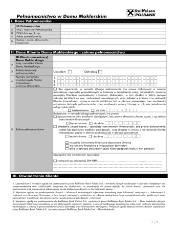 Pełnomocnictwo w Domu Maklerskim I. Dane Pełnomocnika 1 2 3 4 5 ID Pełnomocnika Imię i nazwisko Pełnomocnika PESEL/lub kod kraju Adres zameldowania Rodzaj i numer dokumentu tożsamości II. Dane Klienta Domu Maklerskiego i zakres pełnomocnictwa 1 2 ID Klienta (mocodawcy) Domu Maklerskiego Imię i nazwisko Klienta Domu Maklerskiego 3 Rodzaj dyspozycji pełnomocnictwa Udzielam 4 Numery rachunków inwestycyjnych Klienta (mocodawcy) w Domu Maklerskim 1. 2. 3. Odwołuję Bez ograniczeń, w ramach którego pełnomocnik ma prawo dokonywać w imieniu mocodawcy czynności przewidzianych w Umowie o świadczenie usług maklerskich, zawartej pomiędzy Klientem (mocodawcą) i Domem Maklerskim, w tym działać w takim samym zakresie jak Klient na ww. rachunkach inwestycyjnych, oraz składać w imieniu i na rachunek Klienta (mocodawcy) zapisy w ofercie publicznej lub w obrocie pierwotnym, bez możliwości udzielania dalszych pełnomocnictw i bez możliwości zmiany Umowy w zakresie świadczenia usług maklerskich bezterminowo do dnia Rodzajowe, w ramach którego pełnomocnik ma prawo: dysponowania tylko środkami pieniężnymi, bez prawa składania zleceń kupna / sprzedaży instrumentów finansowych 5 Zakres pełnomocnictwa bezterminowo do dnia składania zleceń kupna / sprzedaży instrumentów finansowych, bez prawa dokonywania wypłat lub przelewów środków pieniężnych , oraz składać w imieniu i na rachunek Klienta (mocodawcy) zapisy w ofercie publicznej lub w obrocie pierwotnym bezterminowo do dnia wszystkie instrumenty finansowe dozwolone Umową instrumenty finansowe z wyłączeniem derywatów tylko w zakresie derywatów (jeżeli Klient podpisał Aneks w tym zakresie) Szczególne (do określonych czynności): (wyłącznie po akceptacji DM RBPL) …………………………………………………………… ....................................................................................................................................... ...................................................................................................................................... III. Oświadczenia Klienta II. Oświadczenia Klienta 1. Upoważniam i wyrażam zgodę na przetwarzanie przez Raiffeisen Bank Polska S.A. i emitenta danych osobowych w zakresie niezbędnym do przeprowadzania ofert publicznych, przyjmuję do wiadomości, że przysługuje mi prawo wglądu do moich danych osobowych oraz ich poprawiania oraz dobrowolnie zobowiązuje się do podawania danych na formularzach zapisu. 2. Wyrażam zgodę na przekazywanie danych i informacji stanowiących tajemnicę zawodową oraz informacji związanych z dokonanym i zapisami na instrumenty finansowe, w tym danych osobowych, emitentom, w zakresie niezbędnym do przeprowadzenia ofert publicznych oraz upoważniam te podmioty do otrzymywania i przetwarzania tych danych i informacji. 3. Wyrażam zgodę na przekazywanie do Raiffeisen Bank Polska S.A. uzyskanych przez Raiffeisen Bank Polska S.A. – Dom Maklerski danych stanowiących tajemnicę zawodową, w tym dotyczących złożonych zapisów, w celu prawidłowego świadczenia usług oraz realizacji obowiązków wynikających z ustawy o przeciwdziałaniu praniu pieniędzy oraz finansowaniu terroryzmu. Powyższa zgoda dotyczy również danych uzyskanych przez Raiffeisen Bank Polska S.A. i przekazywanych Raiffeisen Bank Polska S.A. – Dom Maklerski. 1|2 Pełnomocnictwo w Domu Maklerskim 4. Oświadczam i potwierdzam, iż, iż: 1. Będę zapoznawał się z treścią prospektu emisyjnego wraz z warunkami emisji publikowanymi przez emitenta i Komunikatem Domu Maklerskiego Raiffeisen Bank Polska S.A. oraz akceptuje warunki oferty publicznej; 2. Zobowiązuję się do zapewnienia środków pieniężnych z tytułu zapisu na instrumenty finansowe na rachunku bankowym Raiffeisen Bank Polska S.A. - Dom Maklerski o numerze: […] 3. Wyrażam zgodę na przydzielenie mniejszej liczby instrumentów finansowych niż objęte zapisem lub nieprzydzielenie ich wcale; 4. Został poinformowany, że administratorem danych osobowych jest Raiffeisen Bank Polska S.A. z siedzibą w Warszawie przy ul. Pięknej 20, 00-549 Warszawa; 5. Oświadczam, że nie jest rezydentem w Stanach Zjednoczonych Ameryki, ani w żadnym innym państwie, w którym dostęp do informacji o ofercie publicznej stanowiłby naruszenie obowiązujących przepisów bądź jest ograniczony na podstawie prospektu emisyjnego lub warunków emisji oraz, że nie znajduje się na terytorium żadnego z ww. Państw. 6. Oświadczam, że złożenie zapisu na instrumenty finansowej nie będzie sprzeczne z postanowieniami umowy, której jest stroną lub ani nie narusza i nie stoi w sprzeczności z żadnymi przepisami prawa, decyzjami administracyjnymi lub orzeczeniami sądów lub organów władzy państwowej jego dotyczących lub jakiejkolwiek części jego majątku. IV. Podpis Klienta Data Podpis Klienta Domu Maklerskiego Miejscowość V. Oświadczenia Pełnomocnika 1.. Wyrażam zgodę na przetwarzanie moich danych osobowych przez Dom Maklerski Raiffeisen Bank Polska S.A. / Raiffeisen Bank Polska S.A. z siedzibą w Warszawie (00–549), przy ul. Pięknej 20, wpisana do Krajowego Rejestru Sądowego prowadzonego przez Sąd Rejonowy dla m.st. Warszawy, XII Wydział Gospodarczy pod nr KRS 14540, o numerze NIP: 526-020-58-71, w celu wykonania niniejszego pełnomocnictwa. Przyjmuję do wiadomości, że mam prawo wglądu do przekazanych danych osobowych oraz prawo ich poprawiania. 2.. Wyrażam zgodę na przekazywanie Bankowi uzyskanych przez Dom Maklerski danych osobowych niezbędnych do prawidłowego świadczenia usług, jak również w celu realizacji obowiązków wynikających z ustawy z dnia 16 listopada 2000 r. o przeciwdziałaniu praniu pieniędzy oraz finansowaniu terroryzmu. Powyższa zgoda dotyczy również danych uzyskanych przez Bank i przekazywanych Domowi Maklerskiemu. 3.. Oświadczam, że dobrowolnie wyrażam zgodę na przekazywanie mi za pośrednictwem E