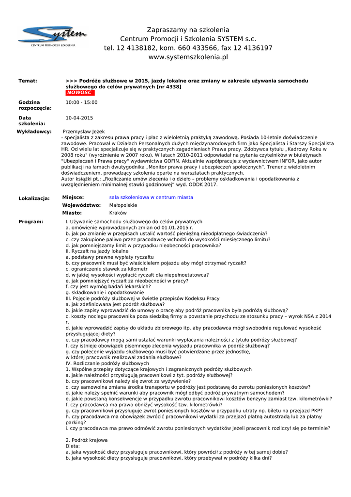 Zapraszamy na szkolenia Centrum Promocji i Szkolenia SYSTEM s.c. tel. 12 4138182, kom. 660 433566, fax 12 4136197 www.systemszkolenia.pl Temat: >>> Podróże służbowe w 2015, jazdy lokalne oraz zmiany w zakresie używania samochodu służbowego do celów prywatnych [nr 4338] NOWOŚĆ Godzina rozpoczęcia: 10:00 - 15:00 Data szkolenia: 10-04-2015 Wykładowcy: Lokalizacja: Program: Przemysław PrzemysławJeżek Jeżek - -specjalista specjalistazzzakresu zakresuprawa prawapracy pracyi ipłac płaczzwieloletnią wieloletniąpraktyką praktykązawodową. zawodową.Posiada Posiada10-letnie 10-letniedoświadczenie doświadczenie zawodowe. zawodowe.Pracował PracowałwwDziałach DziałachPersonalnych Personalnychdużych dużychmiędzynarodowych międzynarodowychfirm firmjako jakoSpecjalista Specjalistai iStarszy StarszySpecjalista Specjalista HR. HR.Od Odwielu wielulat latspecjalizuje specjalizujesię sięwwpraktycznych praktycznychzagadnieniach zagadnieniachPrawa Prawapracy. pracy.Zdobywca Zdobywcatytułu tytułu„Kadrowy „KadrowyRoku Rokuww 2008 2008roku" roku"(wyróżnienie (wyróżnienieww2007 2007roku). roku).WWlatach latach2010-2011 2010-2011odpowiadał odpowiadałna napytania pytaniaczytelników czytelnikówwwbiuletynach biuletynach "Ubezpieczeń "Ubezpieczeńi iPrawa Prawapracy" pracy"wydawnictwa wydawnictwaGOFIN. GOFIN.Aktualnie Aktualniewspółpracuje współpracujezzwydawnictwem wydawnictwemINFOR, INFOR,jako jakoautor autor publikacji publikacjina nałamach łamachdwutygodnika dwutygodnika„Monitor „Monitorprawa prawapracy pracyi iubezpieczeń ubezpieczeńspołecznych”. społecznych”.Trener Trenerzzwieloletnim wieloletnim doświadczeniem, doświadczeniem,prowadzący prowadzącyszkolenia szkoleniaoparte opartena nawarsztatach warsztatachpraktycznych. praktycznych. Autor Autorksiążki książkipt.: pt.:„Rozliczanie „Rozliczanieumów umówzlecenia zleceniai ioodzieło dzieło– –problemy problemyoskładkowania oskładkowaniai iopodatkowania opodatkowaniazz uwzględnieniem uwzględnieniemminimalnej minimalnejstawki stawkigodzinowej” godzinowej”wyd. wyd.ODDK ODDK2017. 2017. Miejsce: sala szkoleniowa ww centrum miasta Miejsce: sala szkoleniowa centrum miasta Województwo: Małopolskie Województwo: Małopolskie Miasto: Kraków Miasto: Kraków I. Używanie samochodu służbowego do celów prywatnych a. omówienie wprowadzonych zmian od 01.01.2015 r. b. jak po zmianie w przepisach ustalić wartość pieniężną nieodpłatnego świadczenia? c. czy zakupione paliwo przez pracodawcę wchodzi do wysokości miesięcznego limitu? d. jak pomniejszamy limit w przypadku nieobecności pracownika? II. Ryczałt na jazdy lokalne a. podstawy prawne wypłaty ryczałtu b. czy pracownik musi być właścicielem pojazdu aby mógł otrzymać ryczałt? c. ograniczenie stawek za kilometr d. w jakiej wysokości wypłacić ryczałt dla niepełnoetatowca? e. jak pomniejszyć ryczałt za nieobecności w pracy? f. czy jest wymóg badań lekarskich? g. składkowanie i opodatkowanie III. Pojęcie podróży służbowej w świetle przepisów Kodeksu Pracy a. jak zdefiniowana jest podróż służbowa? b. jakie zapisy wprowadzić do umowy o pracę aby podróż pracownika była podróżą służbową? c. koszty noclegu pracownika poza siedzibą firmy a powstanie przychodu ze stosunku pracy – wyrok NSA z 2014 r. d. jakie wprowadzić zapisy do układu zbiorowego itp. aby pracodawca mógł swobodnie regulować wysokość przysługującej diety? e. czy pracodawcy mogą sami ustalać warunki wypłacania należności z tytułu podróży służbowej? f. czy istnieje obowiązek pisemnego zlecenia wyjazdu pracownika w podróż służbową? g. czy polecenie wyjazdu służbowego musi być potwierdzone przez jednostkę, w której pracownik realizował zadania służbowe? IV. Rozliczanie podróży służbowych 1. Wspólne przepisy dotyczące krajowych i zagranicznych podróży służbowych a. jakie należności przysługują pracownikowi z tyt. podróży służbowej? b. czy pracownikowi należy się zwrot za wyżywienie? c. czy samowolna zmiana środka transportu w podróży jest podstawą do zwrotu poniesionych kosztów? d. jakie należy spełnić warunki aby pracownik mógł odbyć podróż prywatnym samochodem? e. jakie powstaną konsekwencje w przypadku zwrotu pracownikowi kosztów benzyny zamiast tzw. kilometrówki? f. czy pracodawca ma prawo obniżyć wysokość tzw. kilometrówki? g. czy pracownikowi przysługuje zwrot poniesionych kosztów w przypadku utraty np. biletu na przejazd PKP? h. czy pracodawca ma obowiązek zwrócić pracownikowi wydatki za przejazd płatną autostradą lub za płatny parking? i. czy pracodawca ma prawo odmówić zwrotu poniesionych wydatków jeżeli pracownik rozliczył się po terminie? 2. Podróż krajowa Dieta: a. jaka wysokość diety przysługuje pracownikowi, który powrócił z podróży w tej samej dobie? b. jaka wysokość diety przysługuje pracownikowi, który przebywał w podróży kilka dni? c. jakie sytuacje powodują, że dieta pracownikowi nie przysługuje? d. o ile należy pomniejszyć wysokość diety, w przypadku gdy w hotelu zapewniono pracownikowi śniadanie? e. czy obiad z kontrahentem ma wpływ na wysokość przysługującej diety? f. czy zwrot pracownikowi kosztów wyżywienia wygeneruje u niego przychód? g. czy rozpoczęcie podróży służbowej w dniu wolnym daje pracownikowi prawo do diety? Koszt noclegu: a. w jakich sytuacjach pracownikowi przysługuje zwrot kosztów noclegu a kiedy ryczałt? b. czy kierowcy należy wypłacić ryczałt za nocleg w przypadku kiedy pracodawca wyposażył samochód w miejsce do spania? c. czy powstanie u pracownika przychód w przypadku zwrotu kosztu noclegu powyżej określonego limitu? d. w jakich sytuacjach pracodawca może odmówić wypłaty ryczałtu? Koszty dojazdów: a. w jakich sytuacjach pracownikowi przysługuje zwrot kosztów dojazdu a kiedy ryczałt? b. w jakich sytuacjach pracodawca może odmówić wypł