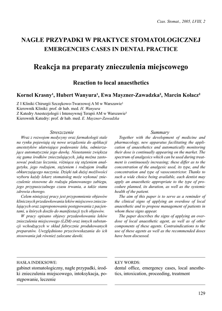 Czas. Stomat., 2005, LVIII, 2 NAGŁE PRZYPADKI W PRAKTYCE STOMATOLOGICZNEJ EMERGENCIES CASES IN DENTAL PRACTICE Reakcja na preparaty znieczulenia miejscowego Reaction to local anaesthetics Kornel Krasny¹, Hubert Wanyura¹, Ewa Mayzner-Zawadzka², Marcin Kołacz² Z I Kliniki Chirurgii Szczękowo-Twarzowej A M w Warszawie1 Kierownik Kliniki: prof. dr hab. med. H. Wanyura Z Katedry Anestezjologii i Intensywnej Terapii AM w Warszawie² Kierownik Katedry: prof. dr hab. med. E. Mayzner-Zawadzka Streszczenie Summary Wraz z rozwojem medycyny oraz farmakologii stale na rynku pojawiają się nowe urządzenia do aplikacji anestetyków ułatwiające podawanie leku, odmierzające automatycznie jego dawkę. Nieustannie zwiększa się gama środków znieczulających, jaką można zastosować podczas leczenia, różniąca się stężeniem analgetyku, jego rodzajem, stężeniem i rodzajem środka obkurczającego naczynia. Dzięki tak dużej możliwości wyboru każdy lekarz stomatolog może wykonać znieczulenie stosowne do rodzaju planowanego zabiegu, jego przypuszczalnego czasu trwania, a także stanu zdrowia chorego. Celem niniejszej pracy jest przypomnienie objawów klinicznych przedawkowania leków miejscowo znieczulających oraz zaproponowanie postępowania z pacjentami, u których doszło do manifestacji tych objawów. W pracy opisano objawy przedawkowania leków znieczulenia miejscowego (LZM) oraz innych substancji wchodzących w skład fabrycznie produkowanych preparatów. Uwzględniono przeciwwskazania do ich stosowania jak również zalecane dawki. Together with the development of medicine and pharmacology, new apparatus facilitating the application of anaesthetics and automatically monitoring their dose is continually appearing on the market. The spectrum of analgesics which can be used during treatment is continuously increasing; these differ as to the concentration of the analgesic used, its type, and the concentration and type of vasoconstrictor. Thanks to such a wide choice being available, each dentist may apply an anaesthetic appropriate to the type of procedure planned, its duration, as well as the systemic health of the patient. The aim of this paper is to serve as a reminder of the clinical signs of applying an overdose of local anaesthetic and to propose management of patients in whom these signs appear. The paper describes the signs of applying an overdose of local anaesthetic agent, as well as of other components of these agents. Contraindications to the use of these agents as well as the recommended doses have been discussed. HASŁA INDEKSOWE: KEY WORDS: gabinet stomatologiczny, nagłe przypadki, środki znieczulenia miejscowego, intoksykacja, postępowanie, leczenie dental office, emergency cases, local anesthetics, intoxication, proceeding, treatment 129 K. Krasny i in. Wstęp Coraz częściej pacjenci zgłaszający się do gabinetu stomatologicznego proszą o wykonanie zabiegów w znieczuleniu. Dotyczy do zarówno zabiegów z zakresu stomatologii zachowawczej, periodontogii, stomatologii dziecięcej, jak i chirurgii stomatologicznej. Lekarz, w zależności od typu i rozległości zabiegu, może wykonać znieczulenie nasiękowe lub przewodowe. Leczenie z wyeliminowaniem czynnika bólu jest wygodne zarówno dla pacjenta jak i lekarza. Zabiegi wykonywane w znieczuleniu przebiegają sprawniej, bardziej komfortowo oraz z mniejszym obciążeniem psychicznym dla chorego (13). Wielu pacjentów nie zdecydowałoby się na leczenie bez możliwości wyeliminowania bólu. Należy jednak pamiętać, że każdy środek znieczulający ma określoną dawkę, której nie można przekroczyć. Stosowanie leków miejscowo znieczulających (LMZ) staje się rutynowe podczas czynności stomatologicznych. Dlatego też znajomość objawów przedawkowania tych środków obowiązuje wszystkich lekarzy wykonujących znieczulenia nasiękowe i przewodowe. Podobnie jak we wcześniej opisanych nagłych przypadkach mogących mieć miejsce w praktyce stomatologicznej (7, 8, 9, 10, 11, 12, 13) umiejętność szybkiej oceny i interpretacji stanu ogólnego pacjenta jest nieodzowna do właściwego postępowania zapewniającego bezpieczeństwo choremu. Cel pracy Celem niniejszej pracy jest przypomnienie objawów klinicznych przedawkowania leków miejscowo znieczulających oraz zaproponowanie postępowania z chorymi, u których doszło do manifestacji tych objawów. Patomechanizm przedawkowania leków miejscowo znieczulających Wyróżnia się przedawkowanie leku względne i bezwzględne. Przedawkowanie względne ma 130 Czas. Stomat., miejsce jeśli dojdzie do szybkiego, donaczyniowego podania leku (lub w miejsce dobrze ukrwione) w dawce nawet znacznie mniejszej od dawki granicznej. Przedawkowanie bezwzględne to podanie leku w ilości przekraczającej dawkę dopuszczalną – przeliczoną na kilogram masy ciała. W tabeli I zestawiono najczęściej stosowane w gabinetach stomatologicznych leki do znieczuleń miejscowych. Określono maksymalną ilość ampułek, którą można podać choremu z uwzględnieniem jego wieku i masy ciała. Przedawkowanie leków miejscowo znieczulających manifestuje się przede wszystkim objawami ze strony ośrodkowego układu nerwowego. Poprzez powolny wzrost stężenia leku we krwi dochodzi początkowo do blokowania, tzw. neuronów hamujących, co odpowiednio uwidacznia się efektem pobudzenia (18). Stan ten w zależności od dawki może przejść w depresję układu nerwowego spowodowaną blokowaniem wszystkich neuronów przez LMZ (4). Znacznie rzadziej i w mniejszym stopniu przedawkowanie LMZ prowadzi do wystąpienia objawów ze strony układu sercowo-naczyniowego, tj. spadku ciśnienia tętniczego krwi i zaburzeń rytmu serca (1). Natężenie objawów przedawkowania leków miejscowo znieczulających jest uzależnione od: 1) całkowitej dawki środka ( przedawkowanie bezwzględne), 2) miejsca podania (podanie donaczyniowe jest najczęstszą przyczyną wystąpienia objawów przedawko