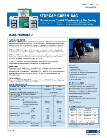 CI/Sfb (43) Pr4 Listopad 2008 STOPGAP GREEN BAG Uniwersalny Środek Wyrównujący Do Podłóg ct-c25-f7 - bs en13813:2002 z STOPGAP 114 Liquid ct-c30-f7 - bs en13813:2002 z STOPGAP 128 Liquid Klasyfikacja wylewek Dane produktu Wprowadzenie STOPGAP GREEN BAG to uniwersalny, niskozapachowy, szybkoschnący środek wyrównujący, odpowiedni do zastosowań przy małych i dużych obciążeniach, stosowany do przygotowywania solidnych podłoży pod nowe wykładziny podłogowe. odpowiedni do stosowania na obszarach klinicznie i biologicznie wrażliwych, takich jak szpitale, laboratoria, pomieszczenia sterylne itp. STOPGAP GREEN BAG odpowiedni do stosowania na chłonnych i niechłonnych podłożach i można go używać do wypełniania ubytków w podłogach drewnianych przed położeniem sklejki. STOPGAP GREEN BAG odpowiedni także do stosowania na chłonnych, nierównych wylewkach betonowych i piaskowo-cementowych przed nałożeniem wodoodpornej powłoki ochronnej STOPGAP lub powłoki izolacyjnej STOPGAP ISOLATOR. STOPGAP GREEN BAG jest wymiarowo stabilny i dostarczany w postaci fabrycznie wymieszanego suchego proszku do zastosowań w warstwach 3-20 mm. Dobór płynu. Podsypkę STOPGAP GREEN BAG z płynem STOPGAP 114 można stosować na większość chłonnych i niechłonnych powierzchni bez konieczności ich gruntowania. Podsypkę STOPGAP GREEN BAG z płynem STOPGAP 128 stosuje się na chłonne i niechłonne powierzchnie zagruntowane gruntem STOPGAP P131 lub P121. Szczegółowe dane, zob. GRUNTOWANIE. Wydajność 25 kg worek STOPGAP GREEN BAG wymieszany z 5 litrami STOPGAP 114 albo 128 posiada wydajność około 5,0 m2 o grubości warstwy 3 mm. Dane techniczne STOPGAP LIQUID BS EN13813 Klasa 114 128 CT-C25-F7 CT-C30-F7 Czas zachowania właściwości roboczych @ 20 C 15 - 20 minut o Czas utwardzania do uzyskania obciążalności ruchowej @ 20oC Gotowy do ułożenia wykładziny podłogowej (przy grubości warstwy 3 mm) Powierzchnie chłonne Powierzchnie niechłonne (Zależny od temperatury) Wytrzymałość na ściskanie N/mm2 (BS EN13892-2) Wytrzymałość na zginanie N/mm2 (BS EN13892-2) QCP 2501 • Szybkoschnący • Niskozapachowy • Właściwości samopoziomujące • Odpowiedni do stosowania pod wodoodporne powłoki ochronne STOPGAP • Bezbiałkowy • Grubość nanoszonej warstwy od 3-20 mm • Can be spike rolled BS EN13813:2002 Powyższy standard odnosi się do właściwości i wydajności eksploatacyjnej produktu oraz specyfikacji, według której został przetestowany. Przedstawione dane podają minimalne wartości wytrzymałości na ściskanie i na zginanie, którymi produkt będzie się charakteryzował Opakowania 12 godzin 24 godzin 12 godzin 24 godzin 1 Dzień 7 Dni 28 Dni > 8,0 > 15,0 > 25,0 > 8,0 > 20,0 > 30,0 1 Dzień 7 Dni 28 Dni > 2,0 > 5,0 > 7,0 > 3,0 > 6,0 > 8,0 2,01kg/m2 2,01kg/m2 Proszek - 25kg worki papierowe z wewnętrzną warstwą. Plyn - Butla 5-litrowa. Ile materiału? Zużycie na 1 mm grubości warstwy Grubość nanoszonej warstwy: 90 minut Cechy Bez kruszywa Z kruszywem 3 – 15mm do 20mm Grubość ZUŻYCIE NA Kruszywo nanoszonej Wydajność 100m2 warstwy na jednostkę POWIERZCHNI sortowane 3mm 5,0m2 21 Jednostki n/a 5mm 3,0m2 34 Jednostki n/a 10mm 1,5m2 68 Jednostki n/a 20mm zapełniana mieszanka 1,0m2 102 x Proszek 51 x Kruszywo Uwaga: wydajność kleju zależeć będzie od stanu i chłonności podłoża. Przygotowanie powierzchni podłoża Warunkiem prawidłowego nałożenia wykładziny podłogowej jest właściwe przygotowanie podłoża. Podłoże musi być solidne, gładkie, suche (<75% RH*) i wolne od mleczka betonowego oraz innych zanieczyszczeń, które mogą ujemnie wpływać na przyczepność kleju. Do usuwania tłuszczu (smaru), oleju, pasty, mydła itp. z niechłonnego podłoża należy użyć środka STYCCOCLEAN C140. * Z wyjątkiem stosowania pod wodoodporne powłoki ochronne STOPGAP. Wylewki betonowe i piaskowo-cementowe muszą być całkowicie utwardzone, a wszelkie zanieczyszczenia takie jak mleczko cementowe i stare powłoki muszą być całkowicie usunięte z powierzchni. Temperaturę podłogi należy utrzymywać na poziomie 5°C przez cały czas nanoszenia i schnięcia podkład. Ogrzewanie podpodłogowe należy wyłączyć co najmniej 48 godzin przed aplikacją, w trakcie aplikacji i po jej zakończeniu. Szczegółowe informacje podaje dostępny na życzenie poradnik firmy F. Ball „Przygotowanie podłoża” (Subfloor Preparation Guide). Gruntowanie Powierzchnie chłonne - Silnie chłonne podłoża, takie jak wylewki piaskowocementowe czy sklejka itp. mogą bardzo przyspieszać wysychanie kleju, a zatem skracać czas otwarcia. Należy zastosować grunt STOPGAP P131 rozcieńczony wodą w stosunku 1: 4. Wymieszać dokładnie aż do całkowitego rozpuszczenia. W niektórych sytuacjach gruntowanie może nie być konieczne, na przykład przy instalowaniu tekstylnych wykładzin podłogowych. Niezagruntowanie może spowodować nadmierne wyschnięcie powłoki, pojawienie się dziurek i szorstką powierzchnię, a także obniży płynność produktu i utrudni szpachlowanie. Gdy podsypkę STOPGAP GREEN BAG stosuje się pod wodoodporne powłoki ochronne STOPGAP, wówczas chłonne wylewki betonowe i piaskowo-cementowe należy zagruntować gruntem STOPGAP P131 rozcieńczonym wodą w stosunku 1:7. Niechłonne powierzchnie i beton wygładzany mechanicznie należy poddać mechanicznej obróbce zgodnie z zaleceniami podanymi w poradniku firmy F. Ball „Przygotowanie podłoża” (Subfloor Preparation Guide). Suche i odpowiednio przygotowane wylewki na bazie siarczanu wapnia (np. wylewka anhydrytowa) należy zagruntować nierozcieńczonym środkiem STOPGAP P121. Uwaga - Wodoodpornych powłok ochronnych STOPGAP nie można stosować na wylewkach na bazie siarczanu wapnia np. anhydrytowych. Powierzchnie niechłonne - Gruntowanie niechłonnych podłoży takich jak powierzchnie zawierające minimalne pozostałości kleju oraz płytki terazzo i kamienne nie jest koni