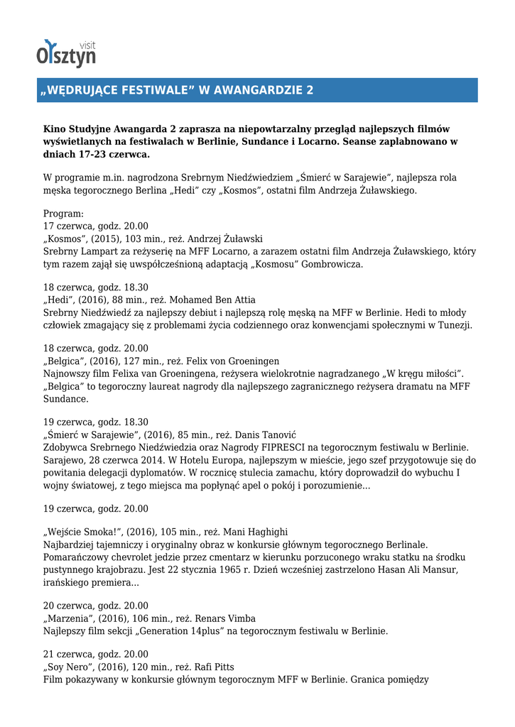 „WĘDRUJĄCE FESTIWALE” W AWANGARDZIE 2 Kino Studyjne Awangarda 2 zaprasza na niepowtarzalny przegląd najlepszych filmów wyświetlanych na festiwalach w Berlinie, Sundance i Locarno. Seanse zaplabnowano w dniach 17-23 czerwca. W programie m.in. nagrodzona Srebrnym Niedźwiedziem „Śmierć w Sarajewie”, najlepsza rola męska tegorocznego Berlina „Hedi” czy „Kosmos”, ostatni film Andrzeja Żuławskiego. Program: 17 czerwca, godz. 20.00 „Kosmos”, (2015), 103 min., reż. Andrzej Żuławski Srebrny Lampart za reżyserię na MFF Locarno, a zarazem ostatni film Andrzeja Żuławskiego, który tym razem zajął się uwspółcześnioną adaptacją „Kosmosu” Gombrowicza. 18 czerwca, godz. 18.30 „Hedi”, (2016), 88 min., reż. Mohamed Ben Attia Srebrny Niedźwiedź za najlepszy debiut i najlepszą rolę męską na MFF w Berlinie. Hedi to młody człowiek zmagający się z problemami życia codziennego oraz konwencjami społecznymi w Tunezji. 18 czerwca, godz. 20.00 „Belgica”, (2016), 127 min., reż. Felix von Groeningen Najnowszy film Felixa van Groeningena, reżysera wielokrotnie nagradzanego „W kręgu miłości”. „Belgica” to tegoroczny laureat nagrody dla najlepszego zagranicznego reżysera dramatu na MFF Sundance. 19 czerwca, godz. 18.30 „Śmierć w Sarajewie”, (2016), 85 min., reż. Danis Tanović Zdobywca Srebrnego Niedźwiedzia oraz Nagrody FIPRESCI na tegorocznym festiwalu w Berlinie. Sarajewo, 28 czerwca 2014. W Hotelu Europa, najlepszym w mieście, jego szef przygotowuje się do powitania delegacji dyplomatów. W rocznicę stulecia zamachu, który doprowadził do wybuchu I wojny światowej, z tego miejsca ma popłynąć apel o pokój i porozumienie... 19 czerwca, godz. 20.00 „Wejście Smoka!”, (2016), 105 min., reż. Mani Haghighi Najbardziej tajemniczy i oryginalny obraz w konkursie głównym tegorocznego Berlinale. Pomarańczowy chevrolet jedzie przez cmentarz w kierunku porzuconego wraku statku na środku pustynnego krajobrazu. Jest 22 stycznia 1965 r. Dzień wcześniej zastrzelono Hasan Ali Mansur, irańskiego premiera... 20 czerwca, godz. 20.00 „Marzenia”, (2016), 106 min., reż. Renars Vimba Najlepszy film sekcji „Generation 14plus” na tegorocznym festiwalu w Berlinie. 21 czerwca, godz. 20.00 „Soy Nero”, (2016), 120 min., reż. Rafi Pitts Film pokazywany w konkursie głównym tegorocznym MFF w Berlinie. Granica pomiędzy Meksykiem a Stanami Zjednoczonymi wyznacza granice ich codziennego życia. Młodzi chłopcy stojący po dwóch stronach boiska używają jej jako umownej siatki podczas gry w siatkówkę. 22 czerwca, godz. 20.00 „U pana Marsa bez zmian”, (2016), 101 min., reż. Dominik Moll Film Dominika Molla to wybuchowa mieszanka czarnego humoru, kina familijnego, a nawet ekologicznego thrillera. 23 czerwca, godz. 20.00 „Dzika”, (2016), 97 min., reż. Nicolette Krebitz Najbardziej kontrowersyjny film konkursu głównego na MFF w Sundance 2016. Film niemieckiej reżyserki Nicolette Kreibitz opowiada fascynującą historię o wyzwalającej się kobiecej seksualności. Bilet na pojedynczy seans: 13 zł www.visit.olsztyn.eu