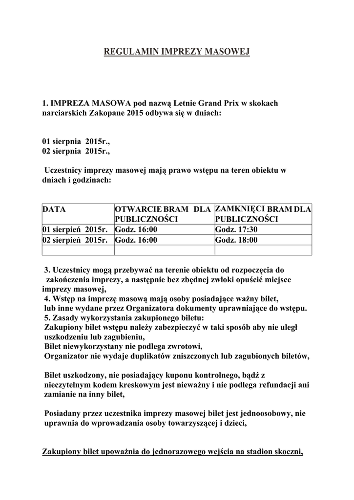 REGULAMIN IMPREZY MASOWEJ 1. IMPREZA MASOWA pod nazwą Letnie Grand Prix w skokach narciarskich Zakopane 2015 odbywa się w dniach: 01 sierpnia 2015r., 02 sierpnia 2015r., Uczestnicy imprezy masowej mają prawo wstępu na teren obiektu w dniach i godzinach: OTWARCIE BRAM DLA ZAMKNIĘCI BRAM DLA E PUBLICZNOŚCI PUBLICZNOŚCI 01 sierpień 2015r. Godz. 16:00 Godz. 17:30 02 sierpień 2015r. Godz. 16:00 Godz. 18:00 DATA 3. Uczestnicy mogą przebywać na terenie obiektu od rozpoczęcia do zakończenia imprezy, a następnie bez zbędnej zwłoki opuścić miejsce imprezy masowej, 4. Wstęp na imprezę masową mają osoby posiadające ważny bilet, lub inne wydane przez Organizatora dokumenty uprawniające do wstępu. 5. Zasady wykorzystania zakupionego biletu: Zakupiony bilet wstępu należy zabezpieczyć w taki sposób aby nie uległ uszkodzeniu lub zagubieniu, Bilet niewykorzystany nie podlega zwrotowi, Organizator nie wydaje duplikatów zniszczonych lub zagubionych biletów, Bilet uszkodzony, nie posiadający kuponu kontrolnego, bądź z nieczytelnym kodem kreskowym jest nieważny i nie podlega refundacji ani zamianie na inny bilet, Posiadany przez uczestnika imprezy masowej bilet jest jednoosobowy, nie uprawnia do wprowadzania osoby towarzyszącej i dzieci, Zakupiony bilet upoważnia do jednorazowego wejścia na stadion skoczni, niemożliwe jest ponowne wejście na obiekt po jego opuszczeniu, Posiadacz biletu jest zobowiązany zapoznać się z informacjami zawartymi na rewersie biletu oraz mapką która ułatwi bezkolizyjne dojście do właściwego SEKTORA, 6. Nie będą wpuszczane na imprezę lub zostaną z niej usunięte osoby, które odmawiają poddania się czynności sprawdzenia uprawnień do przebywania na imprezie masowej, legitymowania lub nie posiadających dokumentów umożliwiających ustalenie tożsamości, 7. Na teren imprezy mają zakaz wstępu osoby nietrzeźwe, będące pod . wpływem alkoholu lub środków odurzających albo psychotropowych, 8. Na teren imprezy nie będą wpuszczane osoby, które swym zachowaniem stwarzają potencjalne zagrożenie dla porządku publicznego, 9. Na teren imprezy nie będą wpuszczane osoby pomalowane na twarzy w sposób uniemożliwiający identyfikację, 10. Osoby obecne na imprezie masowej mają obowiązek zachowywać się w sposób nie zagrażający bezpieczeństwu innych osób obecnych na tej imprezie, a w szczególności przestrzegać regulaminu obiektu (terenu) i regulaminu imprezy masowej, 11. Na teren imprezy masowej obowiązuje zakaz wnoszenia: broni, materiałów wybuchowych, wyrobów pirotechnicznych np.: petard, zimnych ogni, rac, pochodni itp., materiałów pożarowo niebezpiecznych, napojów w opakowaniach plastikowych i kartonowych powyżej 0,2 l oraz całkowity zakaz wnoszenia napojów alkoholowych, napojów w puszkach, napojów w opakowaniach szklanych, środków odurzających, substancji psychotropowych, przedmiotów mogących zagrozić życiu lub zdrowiu ludzkiemu np.: kijów basebolowych, metalowych rurek, noży, flag na drzewcach itp., 12. Organizator zastrzega sobie prawo przeglądania odzieży i przenoszonego bagażu osób wchodzących na imprezę masową, w przypadkach określonych przepisami prawa, osoby które odmówią poddania się tej czynności nie będą wpuszczone, 13. Organizator nie prowadzi depozytu przedmiotów, których wnoszenie i posiadanie w trakcie imprezy masowej jest zabronione, 14. Organizator imprezy zabrania wprowadzania lub wnoszenia na teren imprezy masowej psów lub innych zwierząt, 15. Zabrania się niszczenia tablic informacyjnych, koszy na śmieci, ławek oraz wszelkich innych obiektów i mienia, a także samowolnego przemieszczania urządzeń i mienia znajdującego się na terenie imprezy oraz wzniecania ognia, 16. Zabrania się okrzyków prowokujących lub nawołujących do zakłócenia porządku i bezpieczeństwa, mogących stanowić zarzewie konfliktu, obraźliwych lub poniżających inne osoby z uwagi na ich płeć, rasę, wyznanie, wiek, przekonania lub z jakiegokolwiek innego powodu, 17. Osoby znajdujące się na imprezie masowej, które dopuszczać się będą zakłócenia porządku, stwarzać zagrożenie dla innych uczestników imprezy, naruszać dobre obyczaje lub które wniosą wbrew zakazowi przedmioty zakazane, albo nie będą przestrzegać regulaminu będą usunięte z imprezy 18. Osoby, o których mowa w pkt.17, jeżeli czynem swoim wyczerpią znamiona czynu zabronionego, ponoszą konsekwencje przewidziane przepisami prawa, 19. Uczestnicy imprezy masowej mają dostęp do określonych stref zgodnie z zasadami określonymi przez Organizatora, 20. Zabronione jest tarasowanie i zastawianie w jakikolwiek sposób wyjść i dróg ewakuacyjnych, dróg dojazdowych dla służb ratowniczych i policji oraz hydrantów i innych urządzeń niezbędnych w przypadku prowadzenia akcji ratowniczej lub gaśniczej, 21. Każdy uczestnik imprezy masowej zobowiązany jest do zapoznania się z REGULAMINEM IMPREZY MASOWEJ, oraz GRAFICZNYM PLANEM OBIEKTU, a w razie konieczności zastosować się do nich (Regulamin Imprezy Masowej i Graficzny Plan Obiektu BĘDĄ ROZMIESZCZONE PRZY BRAMACH WEJŚCIOWYCH NA TEREN IMPREZY MASOWEJ), 22. Uczestnik imprezy masowej zobowiązany jest do informowania Organizatora lub służbę porządkową o zauważonym pożarze, zagrożeniu życia, zdrowia ludzkiego lub mienia, 23. Organizator nie ponosi odpowiedzialności za mienie pozostawione na terenie imprezy masowej, 24. Uczestnik imprezy masowej zobowiązany jest do stosowania się do zaleceń Organizatora oraz służby porządkowej, 25. Organizator imprezy masowej mając na uwadze względy bezpieczeństwa uczestników imprezy podyktowane zmianami organizacyjnymi oraz zmianami infrastruktury Obiektu oraz biorąc pod uwagę możliwość zmian atmosferycznych zastrzega sobie prawo zmiany terminu godzin przeprowadzenia imprezy masowej lub jej odwołania, 26. Organizator, wykonując postanowienia niniejszego Regulaminu Imprezy 