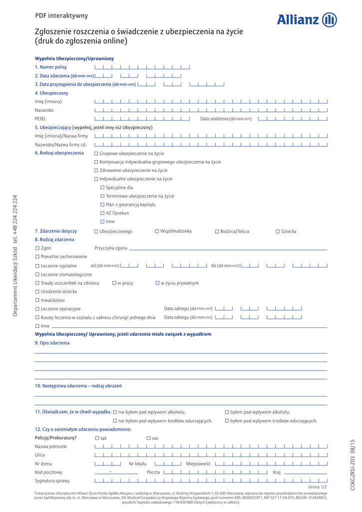 Zgłoszenie roszczenia o świadczenie z ubezpieczenia na życie (druk do zgłoszenia online) Wypełnia Ubezpieczony/Uprawniony 1. Numer polisy 2. Data zdarzenia (dd-mm-rrrr) 3. Data przystąpienia do ubezpieczenia (dd-mm-rrrr) 4. Ubezpieczony Imię (imiona) Nazwisko PESEL Data urodzenia (dd-mm-rrrr) 5. Ubezpieczający (wypełnij, jeżeli inny niż Ubezpieczony) Imię (imiona)/Nazwa firmy Nazwisko/Nazwa firmy cd. 6. Rodzaj ubezpieczenia Grupowe ubezpieczenie na życie Kontynuacja indywidualna grupowego ubezpieczenia na życie Zdrowotne ubezpieczenie na życie Indywidualne ubezpieczenie na życie Terminowe ubezpieczenie na życie Plan z gwarancją kapitału AZ Opiekun Inne 7. Zdarzenie dotyczy Współmałżonka Ubezpieczonego Rodzica/Teścia Dziecka 8. Rodzaj zdarzenia Zgon Przyczyna zgonu Poważne zachorowanie Leczenie szpitalne od (dd-mm-rrrr) do (dd-mm-rrrr) Leczenie stomatologiczne Trwały uszczerbek na zdrowiu w pracy w życiu prywatnym Urodzenie dziecka Inwalidztwo Leczenie operacyjne Data zabiegu (dd-mm-rrrr) Koszty leczenia w szpitalu z zakresu chirurgii jednego dnia Data zabiegu (dd-mm-rrrr) Inne Wypełnia Ubezpieczony/ Uprawniony, jeżeli zdarzenie miało związek z wypadkiem 9. Opis zdarzenia 10. Następstwa zdarzenia – rodzaj obrażeń 11. Oświadczam, że w chwili wypadku: nie byłem pod wpływem alkoholu. byłem pod wpływem alkoholu. nie byłem pod wpływem środków odurzających. byłem pod wpływem środków odurzających. 12. Czy o zaistniałym zdarzeniu powiadomiono: Policję/Prokuraturę? tak nie Nazwa jednostki Ulica Nr domu Kod pocztowy Nr lokalu – Miejscowość Poczta Kraj Sygnatura sprawy strona 1/2 Towarzystwo Ubezpieczeń Allianz Życie Polska Spółka Akcyjna z siedzibą w Warszawie, ul. Rodziny Hiszpańskich 1, 02-685 Warszawa, wpisana do rejestru przedsiębiorców prowadzonego przez Sąd Rejonowy dla m. st. Warszawy w Warszawie, XIII Wydział Gospodarczy Krajowego Rejestru Sądowego, pod numerem KRS: 0000021971, NIP 527-17-54-073, REGON 012634451, wysokość kapitału zakładowego: 118 630 000 złotych (wpłacony w całości). COKGZRSI-Z03 08/15 Departament Likwidacji Szkód tel. +48 224 224 224 Specjalnie dla Pogotowie ratunkowe? tak nie Nazwa jednostki Ulica Nr domu Nr lokalu – Kod pocztowy Miejscowość Poczta Kraj 13. Dane osoby uprawnionej do odbioru świadczenia Imię (imiona) Nazwisko PESEL Adres korespondencyjny Ulica Nr domu Nr lokalu – Kod pocztowy Miejscowość Kraj Poczta Tel. stacjonarny Tel. kom. E-mail Faks 14. Forma wypłaty świadczenia Przelew Nazwa Banku Nr konta Właściciel konta Departament Likwidacji Szkód tel. +48 224 224 224 Przekaz 15. Oświadczenie Ubezpieczonego Niniejszym potwierdzam, że wszelkie podane powyżej informacje są kompletne i zgodne z prawdą oraz wyrażam zgodę na ich przetwarzanie. W razie zatajenia lub podania nieprawdziwych informacji TU Allianz Życie Polska S.A. nie ponosi odpowiedzialności na warunkach przewidzianych przez przepisy kodeksu cywilnego. tak nie 15. Wyrażam zgodę, by TU Allianz Życie Polska kierowało do mnie korespondencję w formie elektronicznej na wskazany adres-email, co przyspieszy rozpatrywanie roszczenia tak nie 16. Klauzula zgody na dane wrażliwe Wyrażam zgodę na przetwarzanie przez TU Allianz Życie Polska S.A. (ubezpieczyciel) moich danych osobowych lub moich dzieci, w tym danych wrażliwych w rozumieniu art. 27 ustawy z dnia 29.08.1997 r. o ochronie danych osobowych (zawierających m.in. dane o stanie zdrowia), przekazanych przez mnie dobrowolnie drogą elektroniczną w związku ze zgłoszonym roszczeniem z umowy ubezpieczenia lub pozyskanych przez ubezpieczyciela na podstawie obowiązujących przepisów prawa w celu realizacji mojego roszczenia. tak nie 17. Klauzula informacyjna: Informujemy, że dane osobowe podane w niniejszym zgłoszeniu będą przetwarzane przez Towarzystwo Ubezpieczeń Allianz Życie Polska S.A. (Administratora) z siedzibą w Warszawie, przy ul. Rodziny Hiszpańskich 1, 02-685 Warszawa, w celu wykonania umowy ubezpieczenia. Podanie danych jest dobrowolne, ale niezbędne do wykonania umowy. Przysługuje Pani/Panu prawo dostępu do treści danych i prawo ich poprawiania. 18. Postanowienia końcowe TU Allianz Życie Polska S.A. informuje, że dane osobowe podane w niniejszym zgłoszeniu są objęte tajemnicą zawodową i nie będą udostępniane, z wyjątkiem wypadków obowiązkowego udzielania informacji, określonych w ustawie o działalności ubezpieczeniowej. Data Imię i nazwisko osoby wypełniającej druk Seria i nr dowodu osobistego strona 2/2