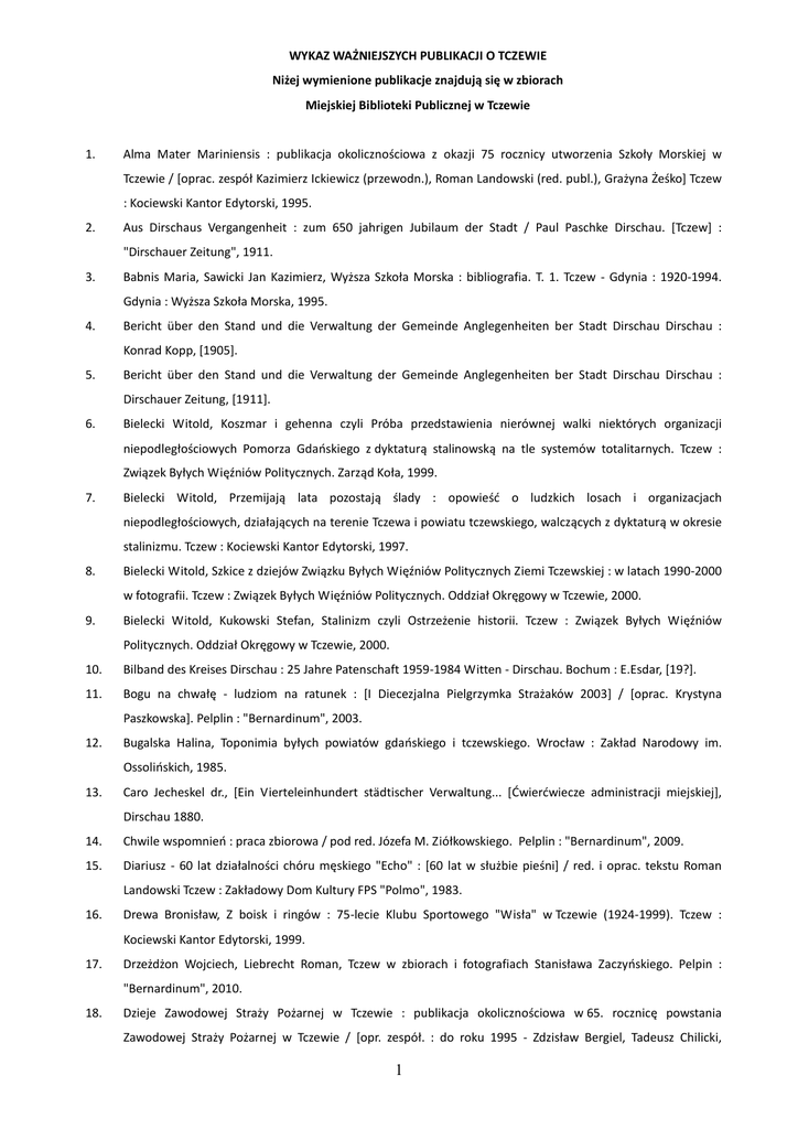 WYKAZ WAŻNIEJSZYCH PUBLIKACJI O TCZEWIE Niżej wymienione publikacje znajdują się w zbiorach Miejskiej Biblioteki Publicznej w Tczewie 1. Alma Mater Mariniensis : publikacja okolicznościowa z okazji 75 rocznicy utworzenia Szkoły Morskiej w Tczewie / [oprac. zespół Kazimierz Ickiewicz (przewodn.), Roman Landowski (red. publ.), Grażyna Żeśko] Tczew : Kociewski Kantor Edytorski, 1995. 2. Aus Dirschaus Vergangenheit : zum 650 jahrigen Jubilaum der Stadt / Paul Paschke Dirschau. [Tczew] : "Dirschauer Zeitung", 1911. 3. Babnis Maria, Sawicki Jan Kazimierz, Wyższa Szkoła Morska : bibliografia. T. 1. Tczew - Gdynia : 1920-1994. Gdynia : Wyższa Szkoła Morska, 1995. 4. Bericht über den Stand und die Verwaltung der Gemeinde Anglegenheiten ber Stadt Dirschau Dirschau : Konrad Kopp, [1905]. 5. Bericht über den Stand und die Verwaltung der Gemeinde Anglegenheiten ber Stadt Dirschau Dirschau : Dirschauer Zeitung, [1911]. 6. Bielecki Witold, Koszmar i gehenna czyli Próba przedstawienia nierównej walki niektórych organizacji niepodległościowych Pomorza Gdańskiego z dyktaturą stalinowską na tle systemów totalitarnych. Tczew : Związek Byłych Więźniów Politycznych. Zarząd Koła, 1999. 7. Bielecki Witold, Przemijają lata pozostają ślady : opowieść o ludzkich losach i organizacjach niepodległościowych, działających na terenie Tczewa i powiatu tczewskiego, walczących z dyktaturą w okresie stalinizmu. Tczew : Kociewski Kantor Edytorski, 1997. 8. Bielecki Witold, Szkice z dziejów Związku Byłych Więźniów Politycznych Ziemi Tczewskiej : w latach 1990-2000 w fotografii. Tczew : Związek Byłych Więźniów Politycznych. Oddział Okręgowy w Tczewie, 2000. 9. Bielecki Witold, Kukowski Stefan, Stalinizm czyli Ostrzeżenie historii. Tczew : Związek Byłych Więźniów Politycznych. Oddział Okręgowy w Tczewie, 2000. 10. Bilband des Kreises Dirschau : 25 Jahre Patenschaft 1959-1984 Witten - Dirschau. Bochum : E.Esdar, [19?]. 11. Bogu na chwałę - ludziom na ratunek : [I Diecezjalna Pielgrzymka Strażaków 2003] / [oprac. Krystyna Paszkowska]. Pelplin : "Bernardinum", 2003. 12. Bugalska Halina, Toponimia byłych powiatów gdańskiego i tczewskiego. Wrocław : Zakład Narodowy im. Ossolińskich, 1985. 13. Caro Jecheskel dr., [Ein Vierteleinhundert städtischer Verwaltung... [Ćwierćwiecze administracji miejskiej], Dirschau 1880. 14. Chwile wspomnień : praca zbiorowa / pod red. Józefa M. Ziółkowskiego. Pelplin : "Bernardinum", 2009. 15. Diariusz - 60 lat działalności chóru męskiego "Echo" : [60 lat w służbie pieśni] / red. i oprac. tekstu Roman Landowski Tczew : Zakładowy Dom Kultury FPS "Polmo", 1983. 16. Drewa Bronisław, Z boisk i ringów : 75-lecie Klubu Sportowego "Wisła" w Tczewie (1924-1999). Tczew : Kociewski Kantor Edytorski, 1999. 17. Drzeżdżon Wojciech, Liebrecht Roman, Tczew w zbiorach i fotografiach Stanisława Zaczyńskiego. Pelpin : "Bernardinum", 2010. 18. Dzieje Zawodowej Straży Pożarnej w Tczewie : publikacja okolicznościowa w 65. rocznicę powstania Zawodowej Straży Pożarnej w Tczewie / [opr. zespół. : do roku 1995 - Zdzisław Bergiel, Tadeusz Chilicki, 1 Elżbieta Zdrojewska ; od 1995 do 2010 - Adam Zieliński, Alfred Skoczylas, Konrad Majewski]. Tczew : Kociewski Kantor Edytorski, cop. 2010. 19. X-lecie [Dziesięciolecie] samorządności lokalnej na terenie powiatu tczewskiego / [kom. red. Maciej Płażyński i in. ; red. Jerzy Cisewski, Kazimierz Ickiewicz]. Tczew : Wydawnictwo Pomorskie, 2000. 20. Ellwart Jarosław, Kociewie i Bory Tucholskie : przewodnik turystyczny. [Wyd. 2]. Gdynia : "Region", cop. 1997. 21. Faterkowski Walenty, Wspomnienia wojenne i powojenne Walentego Faterkowskiego. Nowa Sól ; [Mirotki] : "Mirex", 2009. 22. Glinkowski Czesław,Przywróćmy pamięć... Tczew : Studio Twórczego Działania Carpe Diem, 2008. 23. Glinkowski Czesław, Tczew na przełomie XX i XXI wieku : organizatorska rola samorządu miejskiego. Tczew : Studio Twórczego Działania Carpe Diem, 2005. 24. Glinkowski Czesław, Tczewskie szlaki turystyczne. Tczew : Studio Twórczego Działania Carpe Diem, 2001. 25. Glinkowski Czesław, Życie Tczewem pisane : refleksje długoletniego prezydenta miasta. Tczew : Kociewski Kantor Edytorski : Towarzystwo Miłośników Ziemi Tczewskiej, 2002. 26. Golicki Józef, Album tczewski 1900-1945 = Dirschauer Album 1900-1945.[Tczew] : Gazeta Reklamowa, 2002. 27. Golicki Józef, Album tczewski : 1945 - 2000 : Początek i Koniec. [Tczew] : Gazeta Reklamowa, 2005/2006. 28. Golicki Jozef, Album Tczewski : Tczewskie mosty przez Wisłę : 150 lat historii ; [tł. na jęz. niem. Aleksandra Jeszke-Zillmer. [Tczew] : Gazeta Reklamowa, Agencja Impresaryjna POP & ART, 2007. 29. Golicki Józef, Album tczewski : lata 1900 - 1945 : rody i rodziny tczewskie. [Tczew] : Gazeta Reklamowa, 1999. 30. Golicki Józef, Album Tczewski : lata 1900-1945 : szkolnictwo i gospodarka Tczewa ; oprac. graf. Regina JeszkeGolicka. [Tczew] : Gazeta Reklamowa, 2000. 31. Golicki Józef, Album tczewski : lata 1900-1945 : Tczew i jego mieszkańcy w czasie I i II wojny światowej. [Tczew] : Gazeta Reklamowa, 2001. 32. Golicki Józef, Album tczewski : lata 1900-1945 : życie religijne, kulturalne i sportowe tczewian. [Tczew] : Gazeta Reklamowa, 2000. 33. Golicki Józef, Staromiejska fara i klasztor dominikanów. Tczew : Gazeta Reklamowa, Agencja Impresaryjna POP & ART, 2009. 34. Golicki Józef, Wędrówki po średniowiecznym Tczewie : kto, co, kiedy i dlaczego. [Tczew] : Gazeta Reklamowa, Agencja Impresaryjna "Pop&Art", 2010. 35. Gospodarka wodno-ściekowa w Tczewie / pod red. Marii Wons ; [współaut. Jacek Czekała, Mariusz Pepliński, Maria Wons]. Tczew : "Bernardinum", 2010. 36. Grzegorz Ciechowski 1957-2001 : wybitny artysta rodem z Tczewa : praca zbiorowa / pod red. Jana Kulasa. Pelplin : "Bernardinum", 2007. 37. Harcerska Orkiesta Dęta im. Stanisława Moniuszki w Tczewie : 60 lat tradycji (1947-2007) / praca zbiorowa pod red. Kazimierza Icki
