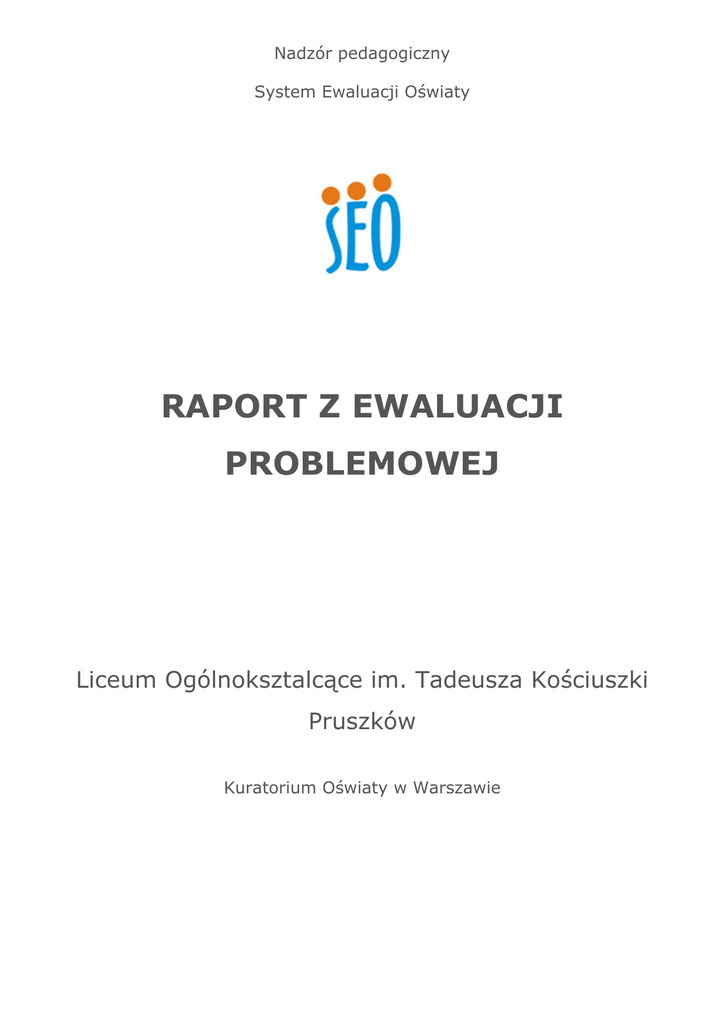 Nadzór pedagogiczny System Ewaluacji Oświaty RAPORT Z EWALUACJI PROBLEMOWEJ Liceum Ogólnoksztalcące im. Tadeusza Kościuszki Pruszków Kuratorium Oświaty w Warszawie Wstęp Prezentowany raport jest rezultatem ewaluacji zewnętrznej przeprowadzonej w szkole przez wizytatorów do spraw ewaluacji. Raport z ewaluacji problemowej dotyczy jednego lub kilku z przedstawionych poniżej wymagań państwa. Ewaluacja zewnętrzna polega na zbieraniu i analizowaniu informacji na temat funkcjonowania szkoły w obszarach wyznaczonych przez wymagania państwa: 1. Szkoła lub placówka realizuje koncepcję pracy ukierunkowaną na rozwój uczniów. 2. Procesy edukacyjne są zorganizowane w sposób sprzyjający uczeniu się. 3. Uczniowie nabywają wiadomości i umiejętności określone w podstawie programowej. 4. Uczniowie są aktywni. 5. Respektowane są normy społeczne. 6. Szkoła lub placówka wspomaga rozwój uczniów, z uwzględnieniem ich indywidualnej sytuacji. 7. Nauczyciele współpracują w planowaniu i realizowaniu procesów edukacyjnych. 8. Promowana jest wartość edukacji. 9. Rodzice są partnerami szkoły lub placówki. 10. Wykorzystywane są zasoby szkoły lub placówki oraz środowiska lokalnego na rzecz wzajemnego rozwoju. 11. Szkoła lub placówka, organizując procesy edukacyjne, uwzględnia wnioski z analizy wyników sprawdzianu, egzaminu gimnazjalnego, egzaminu maturalnego, egzaminu potwierdzającego kwalifikacje zawodowe i egzaminu potwierdzającego kwalifikacje w zawodzie oraz innych badań zewnętrznych i wewnętrznych. 12. Zarządzanie szkołą lub placówką służy jej rozwojowi. Ewaluacja ma także na celu ustalenie poziomu spełniania przez szkołę wymagań zawartych w rozporządzeniu Ministra Edukacji Narodowej z dnia 7.10.2009r. wraz ze zmianami z dnia 10.05.2013r. Szkoła może spełniać te wymagania na pięciu poziomach: ● Poziom E - oznaczający niski stopień wypełniania wymagania przez szkołę. ● Poziom D - oznaczający podstawowy stopień wypełniania wymagania przez szkołę. ● Poziom C - oznaczający średni stopień wypełniania wymagania przez szkołę. ● Poziom B - oznaczający wysoki stopień wypełniania wymagania przez szkołę. ● Poziom A - oznaczający bardzo wysoki stopień wypełniania wymagania przez szkołę. Liceum Ogólnoksztalcące im. Tadeusza Kościuszki 2/49 Opis metodologii Badanie zostało zrealizowane w dniach 26-01-2015 - 17-03-2015 przez zespół wizytatorów ds. ewaluacji, w skład którego weszli: Ewa Kosińska, Andrzej Jabłoński. Badaniem objęto 392 uczniów (ankieta i wywiad grupowy), 150 rodziców (ankieta i wywiad grupowy) i 61 nauczycieli (ankieta i wywiad grupowy). Przeprowadzono wywiad indywidualny z dyrektorem placówki, grupowy z partnerami szkoły, a także obserwacje lekcji, placówki i analizę dokumentacji. Na podstawie zebranych danych został sporządzony raport, który obejmuje podstawowe obszary działania szkoły lub placówki. Wyjaśnienie skrótów dla narzędzi: OZ - Arkusz obserwacji zajęć AD - Kwestionariusz ankiety dla dyrektora/dyrektorki szkoły AN - Kwestionariusz ankiety dla nauczycieli AR - Kwestionariusz ankiety dla rodziców AMD - Kwestionariusz ankiety dla uczniów "Mój dzień" AMS - Kwestionariusz ankiety dla uczniów "Moja szkoła" APW - Kwestionariusz ankiety poewaluacyjnej dla wizytatora ADZ - Kwestionariusz badania "Analiza danych zastanych" WN - Scenariusz wywiadu grupowego z nauczycielami WR - Scenariusz wywiadu grupowego z rodzicami WU - Scenariusz wywiadu grupowego z uczniami WD - Scenariusz wywiadu z dyrektorem/dyrektorką szkoły WNPO - Scenariusz wywiadu z nauczycielem po obserwacji WP - Scenariusz wywiadu z partnerami WNO - Scenariusz wywiadu z zespołem nauczycieli uczących w jednym oddziale Liceum Ogólnoksztalcące im. Tadeusza Kościuszki 3/49 Obraz szkoły Liceum Ogólnokształcące im. Tadeusza Kościuszki w Pruszkowie ma 120 - letnią historię, jej początki sięgają 1895 r. kiedy to została założona szkoła elementarna. Od 1917 r. nosi imię Tadeusza Kościuszki. Cała społeczność szkolna dba o kultywowanie tradycji, w holu wisi replika pierwszego sztandaru z 1933 r., na oryginalnym drzewcu, specjalne tablice upamiętniają byłych dyrektorów i zasłużonych nauczycieli. W szkole działa drużyna harcerska. Szkolne Koło Strzeleckie zorganizowane przez Zarząd Powiatowy Ligii Obrony Kraju odnosi sukcesy na terenie powiatu i województwa. Organizowane są zjazdy absolwentów. Tradycją liceum jest Święto Patrona, obchodzone od roku 1957 w każdą rocznicę złożenia przysięgi przez Tadeusza Kościuszkę na Rynku Krakowskim i jednocześnie początku Powstania Kościuszkowskiego. Święto jest okazją do stworzenia forum dla prezentacji pasji i zainteresowań uczniów, organizacji licznych projektów i konkursów oraz promocji szkoły. W tym ważnym dla szkoły wydarzeniu uczestniczą przedstawiciele lokalnego środowiska, rodzice, absolwenci i pruszkowska telewizja kablowa. Ponadto młodzież uczestniczy w wielu uroczystościach związanych z jej Patronem na terenie Pruszkowa i w Warszawie, m.in. zorganizowała cykl koncertów w wykonaniu uczniów Liceum. Od 2006 roku dla upamiętnienia jubileuszu 55-lecia, elementem stroju galowego jest biały szal z logo liceum, który wyróżnia uczniów na wszystkich uroczystościach miejskich i powiatowych. Co rocznie do szkoły rekrutuje się zdolna młodzież do 5 - 6 klas pierwszych, głównie z powiatu pruszkowskiego i okolic. Wykwalifikowani nauczyciele zapewniają edukację na wysokim poziomie. Sprawna organizacja pracy w szkole rekompensuje braki w wyposażeniu pracowni przedmiotowych. Szkoła zapewnia swoim uczniom wszechstronny rozwój. Młodzież może uczestniczyć w zajęciach dodatkowych: kole plastycznym, kole teatralnym i filmowym oraz dodatkowo uczyć się języka angielskiego w Młodzieżowym Domu Kultury. Uczniowie uczestniczą i zdobywają laury w olimpiadach przedmiotowych, konkursach i zawodach