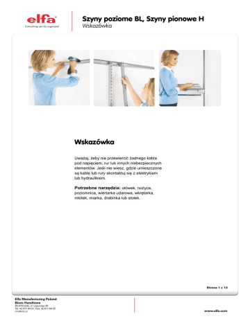 Szyny poziome BL, Szyny pionowe H Wskazówka Wskazówka Uważaj, żeby nie przewiercić żadnego kabla pod napięciem, rur lub innych niebezpiecznych elementów. Jeśli nie wiesz, gdzie umieszczone są kable lub rury skontaktuj się z elektrykiem lub hydraulikiem. Potrzebne narzędzia: ołówek, nożyce, poziomnica, wiertarka udarowa, wkrętarka, młotek, miarka, drabinka lub stołek. Strona 1 z 13 Elfa Manufacturing Poland Biuro Handlowe 93-479 Łódź, ul. Lazurowa 20 Tel: 42 611 64 01, Fax: 42 611 64 02 [email protected] www.elfa.com Szyny poziome BL, Szyny pionowe H Śruby do montażu Szyny poziomej BL UWAGA! Śruby należy dopasować do odpowiedniego typu ściany. #2 bit Śruby G5 Używane do płyt gipsowych o grubości 3 mm lub 17 mm. Użyj 10 mm wiertła. W otwór wsadź ciemno-niebieską kotwiczkę bez szarego dystansu. Dokręć śrubę wkrętarką. Śruby R6 Drewno Używane do montażu szyny w drewnianej ścianie. Użyj 3 mm wiertła. Otwór ułatwi wkręcenie śruby. W tym przypadku kołek nie będzie potrzebny. Dokręć śrubę wkrętarką. Cegła i beton Używane do montażu szyny w ścianie z betonu i cegieł. Użyj wiertła 8 mm. W otwór wsadź kołek i dokręć śrubę. Strona 2 z 13 Elfa Manufacturing Poland Biuro Handlowe 93-479 Łódź, ul. Lazurowa 20 Tel: 42 611 64 01, Fax: 42 611 64 02 [email protected] www.elfa.com Szyny poziome BL, Śruby i Szyny pionowe H Montaż Szyny poziomej BL Wycięcia 1 2 Szyna pozioma posiada dół i górę. Górę wskazuje etykieta oraz dwa nacięcia pozwalające na włożenie szyny pionowej H. Poziomowanie Szyny poziomej BL Umieść szynę na pożądanej wysokości, zaznacz ołówkiem środkowy otwór i odłóż szynę. Zwykle umieszcza się ją przy suficie lub na wysokości drzwi, ale może być umieszczona dowolnie, w zależności od przeznaczenia. Wywierć otwór w zaznaczonym miejscu, wiertłem dostosowanym do rodzaju ściany. W razie potrzeby w otwór włóż kołek. 3 Przykręć szynę jednym wkrętem na tyle mocno by nie ruszała się na ścianie. 4 Przyłóż poziomicę do szyny i złap poziom. Następnie zaznacz ołówkiem pozostałe otwory w szynie. 5 Zdejmij szynę i wywierć pozostałe otwory. Podobnie jak wcześniej dostosuj wiertło do rodzaju ściany. Strona 3 z 13 Elfa Manufacturing Poland Biuro Handlowe 93-479 Łódź, ul. Lazurowa 20 Tel: 42 611 64 01, Fax: 42 611 64 02 [email protected] www.elfa.com Szyny poziome BL, Śruby i Szyny pionowe H Montaż Szyn pionowych H, Nakładek na wspornik VS oraz Maskownicy szyny BL 1 Włóż szynę pionową w wycięcia szyny poziomej. 1. Ułóż szyny pionowe obok siebie i włóż wsporniki VS na pożądanej wysokości. 2 2. Przesuń szyny poziome, tak by były rozmieszczone w odpowiedniej odległości od siebie. Jeśli posiadasz projekt rozmieść szyny według projektu. Wsporniki VS Click In Brackets shown 3. Skrajne szyny pionowe powinny być powieszone co najmniej 10 mm od krawędzi szyny poziomej. Wsporniki VS Montaż Maskownicy szyny BL 1. Przed montażem maskownicy zamontuj wszystkie półki, ramy i inne akcesoria. Dzięki temu odległość pomiędzy szynami pionowymi H będzie odpowiednia. 2. Jeśli odległość między szynami wynosi 60cm, umieść maskownicę w dolnej części szyny poziomej BL. Następnie wsuń górną cześć maskownicy w górną część szyny poziomej. 3. Montuj maskownicę szyny BL dopiero po wykonaniu montażu całej konstrukcji systemu. Wróć do tej instrukcji dopiero po zamontowaniu wszystkich półek i ram. Upewnij się, że rozmieszczenie systemu jest zgodne z Twoimi oczekiwaniami. W przypadku mniejszego rozstawu między szynami pionowymi, odmierz odległość od wewnętrznej strony szyny lewej do wewnętrznej strony szyny prawej. 4. Odmierz tą samą odległość na maskownicy i zaznacz. W zaznaczonym miejscu przetnij maskownicę nożyczkami. 5. Maskownice nie powinny na siebie nachodzić. Strona 4 z 13 Elfa Manufacturing Poland Biuro Handlowe 93-479 Łódź, ul. Lazurowa 20 Tel: 42 611 64 01, Fax: 42 611 64 02 [email protected] www.elfa.com