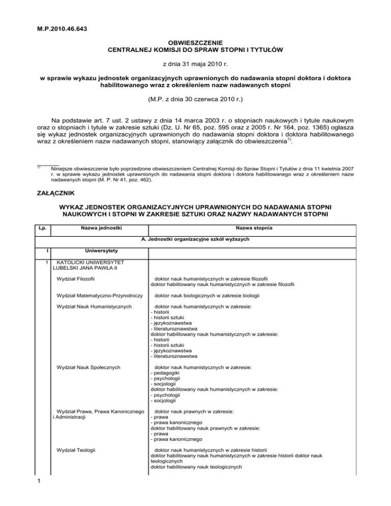 M.P.2010.46.643 OBWIESZCZENIE CENTRALNEJ KOMISJI DO SPRAW STOPNI I TYTUŁÓW z dnia 31 maja 2010 r. w sprawie wykazu jednostek organizacyjnych uprawnionych do nadawania stopni doktora i doktora habilitowanego wraz z określeniem nazw nadawanych stopni (M.P. z dnia 30 czerwca 2010 r.) Na podstawie art. 7 ust. 2 ustawy z dnia 14 marca 2003 r. o stopniach naukowych i tytule naukowym oraz o stopniach i tytule w zakresie sztuki (Dz. U. Nr 65, poz. 595 oraz z 2005 r. Nr 164, poz. 1365) ogłasza się wykaz jednostek organizacyjnych uprawnionych do nadawania stopni doktora i doktora habilitowanego 1) wraz z określeniem nazw nadawanych stopni, stanowiący załącznik do obwieszczenia . ______ 1) Niniejsze obwieszczenie było poprzedzone obwieszczeniem Centralnej Komisji do Spraw Stopni i Tytułów z dnia 11 kwietnia 2007 r. w sprawie wykazu jednostek uprawnionych do nadawania stopni doktora i doktora habilitowanego wraz z określeniem nazw nadawanych stopni (M. P. Nr 41, poz. 462). ZAŁĄCZNIK WYKAZ JEDNOSTEK ORGANIZACYJNYCH UPRAWNIONYCH DO NADAWANIA STOPNI NAUKOWYCH I STOPNI W ZAKRESIE SZTUKI ORAZ NAZWY NADAWANYCH STOPNI Lp. Nazwa jednostki Nazwa stopnia A. Jednostki organizacyjne szkół wyższych I 1 Uniwersytety KATOLICKI UNIWERSYTET LUBELSKI JANA PAWŁA II Wydział Filozofii Wydział Matematyczno-Przyrodniczy doktor nauk biologicznych w zakresie biologii Wydział Nauk Humanistycznych doktor nauk humanistycznych w zakresie: - historii - historii sztuki - językoznawstwa - literaturoznawstwa doktor habilitowany nauk humanistycznych w zakresie: - historii - historii sztuki - językoznawstwa - literaturoznawstwa Wydział Nauk Społecznych doktor nauk humanistycznych w zakresie: - pedagogiki - psychologii - socjologii doktor habilitowany nauk humanistycznych w zakresie: - psychologii - socjologii Wydział Prawa, Prawa Kanonicznego i Administracji Wydział Teologii 1 doktor nauk humanistycznych w zakresie filozofii doktor habilitowany nauk humanistycznych w zakresie filozofii doktor nauk prawnych w zakresie: - prawa - prawa kanonicznego doktor habilitowany nauk prawnych w zakresie: - prawa - prawa kanonicznego doktor nauk humanistycznych w zakresie historii doktor habilitowany nauk humanistycznych w zakresie historii doktor nauk teologicznych doktor habilitowany nauk teologicznych 2 UNIWERSYTET GDAŃSKI Instytut Geografii Instytut Oceanografii doktor nauk o Ziemi w zakresie oceanologii doktor habilitowany nauki o Ziemi w zakresie oceanologii Instytut Psychologii doktor nauk humanistycznych w zakresie psychologii Wydział Biologii doktor nauk biologicznych w zakresie biologii doktor habilitowany nauk biologicznych w zakresie biologii Wydział Chemii doktor nauk chemicznych w zakresie chemii doktor habilitowany nauk chemicznych w zakresie chemii Wydział Ekonomiczny doktor nauk ekonomicznych w zakresie ekonomii doktor habilitowany nauk ekonomicznych w zakresie ekonomii Wydział Filologiczny doktor nauk humanistycznych w zakresie: - językoznawstwa - literaturoznawstwa doktor habilitowany nauk humanistycznych w zakresie: - językoznawstwa - literaturoznawstwa Wydział Historyczny doktor nauk humanistycznych w zakresie historii doktor habilitowany nauk humanistycznych w zakresie historii Wydział Matematyki, Fizyki i Informatyki 3 doktor nauk o Ziemi w zakresie geografii doktor nauk fizycznych w zakresie fizyki doktor habilitowany nauk fizycznych w zakresie fizyki doktor nauk matematycznych w zakresie matematyki doktor habilitowany nauk matematycznych w zakresie matematyki Wydział Nauk Społecznych doktor nauk humanistycznych w zakresie: - nauki o polityce - pedagogiki doktor habilitowany nauk humanistycznych w zakresie: - pedagogiki - psychologii Wydział Prawa i Administracji doktor nauk prawnych w zakresie prawa doktor habilitowany nauk prawnych w zakresie prawa Wydział Zarządzania doktor nauk ekonomicznych w zakresie: - ekonomii - nauki o zarządzaniu doktor habilitowany nauk ekonomicznych w zakresie: - ekonomii - nauki o zarządzaniu UNIWERSYTET IM. ADAMA MICKIEWICZA W POZNANIU Instytut Filologii Angielskiej doktor nauk humanistycznych w zakresie: - językoznawstwa - literaturoznawstwa doktor habilitowany nauk humanistycznych w zakresie językoznawstwa Instytut Filozofii doktor nauk humanistycznych w zakresie filozofii doktor habilitowany nauk humanistycznych w zakresie filozofii Instytut Historii doktor nauk humanistycznych w zakresie historii doktor habilitowany nauk humanistycznych w zakresie historii Instytut Kulturoznawstwa Instytut Psychologii Instytut Socjologii doktor nauk humanistycznych w zakresie kulturoznawstwa doktor nauk humanistycznych w zakresie: - nauki o poznaniu i komunikacji społecznej - psychologii doktor nauk humanistycznych w zakresie socjologii Wydział Biologii doktor nauk biologicznych w zakresie: - biologii - ekologii doktor habilitowany nauk biologicznych w zakresie: - biologii - ekologii Wydział Chemii doktor nauk chemicznych w zakresie chemii doktor habilitowany nauk chemicznych w zakresie chemii 2 4 Wydział Filologii Polskiej i Klasycznej doktor nauk humanistycznych w zakresie: - językoznawstwa - literaturoznawstwa doktor habilitowany nauk humanistycznych w zakresie: - językoznawstwa - literaturoznawstwa Wydział Fizyki doktor nauk fizycznych w zakresie: - astronomii - biofizyki - fizyki doktor habilitowany nauk fizycznych w zakresie fizyki Wydział Historyczny doktor nauk humanistycznych w zakresie: - archeologii - etnologii - historii - historii sztuki doktor habilitowany nauk humanistycznych w zakresie: - archeologii - etnologii - historii - historii sztuki Wydział Matematyki i Informatyki doktor nauk matematycznych w zakresie: - informatyki - matematyki doktor habilitowany nauk matematycznych w zakresie: - informatyki - matematyki Wydział Nauk Geograficznych i Geologicznych doktor nauk o Ziemi w zakresie: - geografii - geologii doktor habilitowany nauk o Ziemi w zakresie: - geografii - geologii Wydział Nauk Politycznych i Dziennikarstwa doktor nauk h